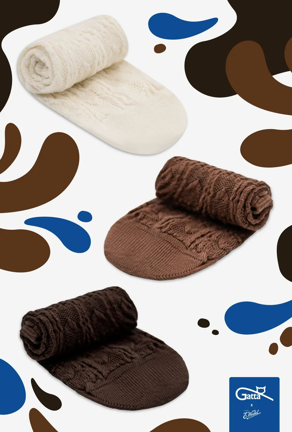 Odkryj niezwykłe połączenie czekoladowej kolorystyki i wzornictwa zainspirowanego pralinkami i tabliczkami czekolady. Sięgnij po zestaw strukturalnych skarpetek z limitowanej kolekcji Gatta x Wedel. Komplet składa się z trzech par, a każda z nich utrzymana jest w jednym z trzech odcieni klasycznej czekolady: białej, mlecznej oraz gorzkiej. Skarpetki te łączą w sobie komfort użytkowania z dopracowaną estetyką i najwyższą jakością wykonania. Zaprojektowaliśmy je i wykonaliśmy z myślą o osobach, które lubią celebrować małe przyjemności.
