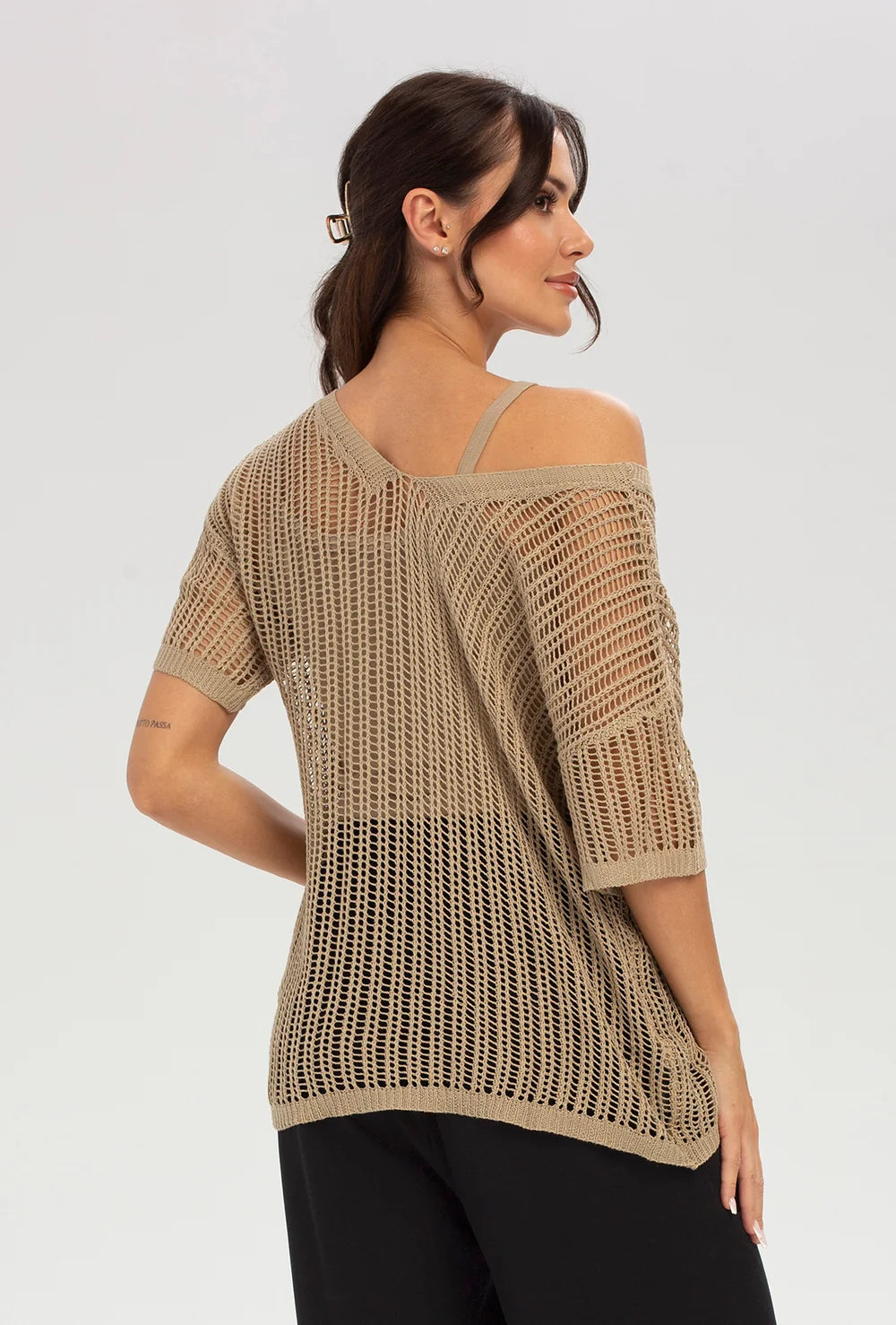 Ażurowe pareo Net w kolorze linen to lekki i stylowy element letniej garderoby. Naturalny odcień oraz dekoracyjny splot sprawiają, że model doskonale uzupełnia plażowe stylizacje.