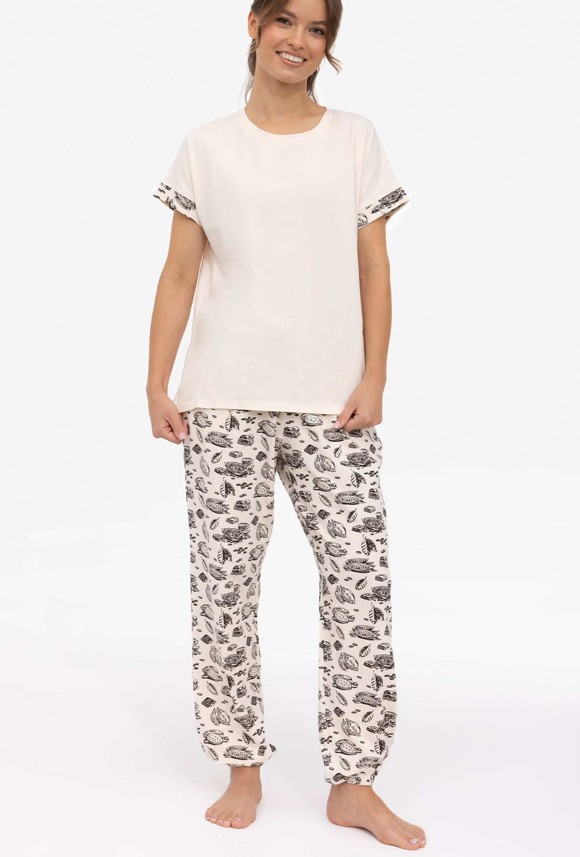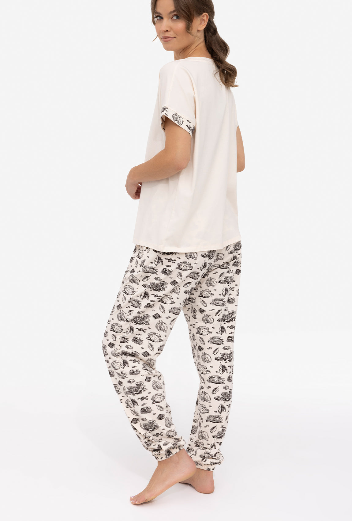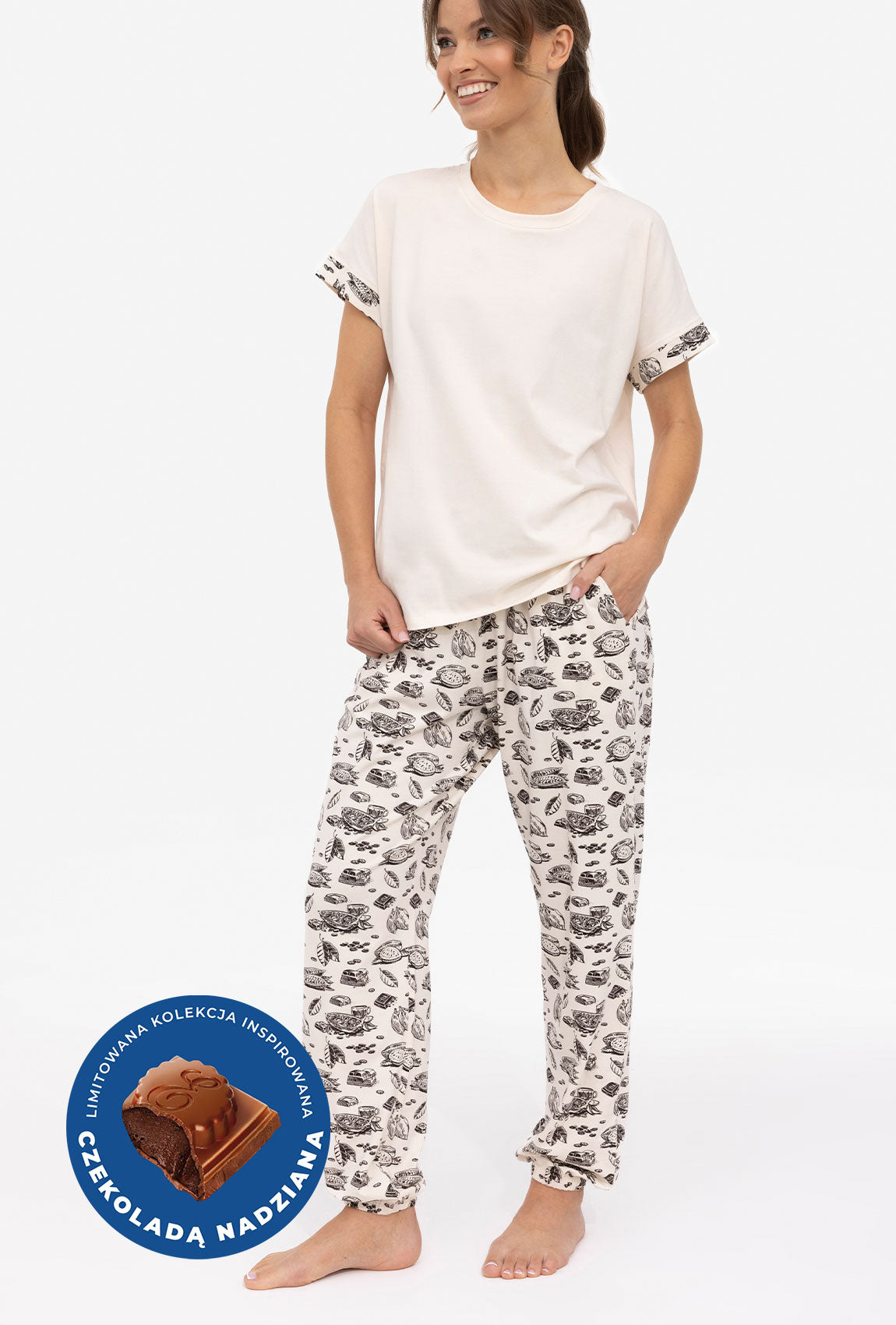 Odkryj niezwykle wygodną, a przy tym stylową piżamę damską Cacao. Daj się oczarować jej eleganckiemu wzornictwu – spodnie z jednobarwnym printem z motywami związanymi z kakao oraz minimalistyczna koszulka z wzorzystymi krawędziami rękawów to idealny set do spania na każdą porę roku!