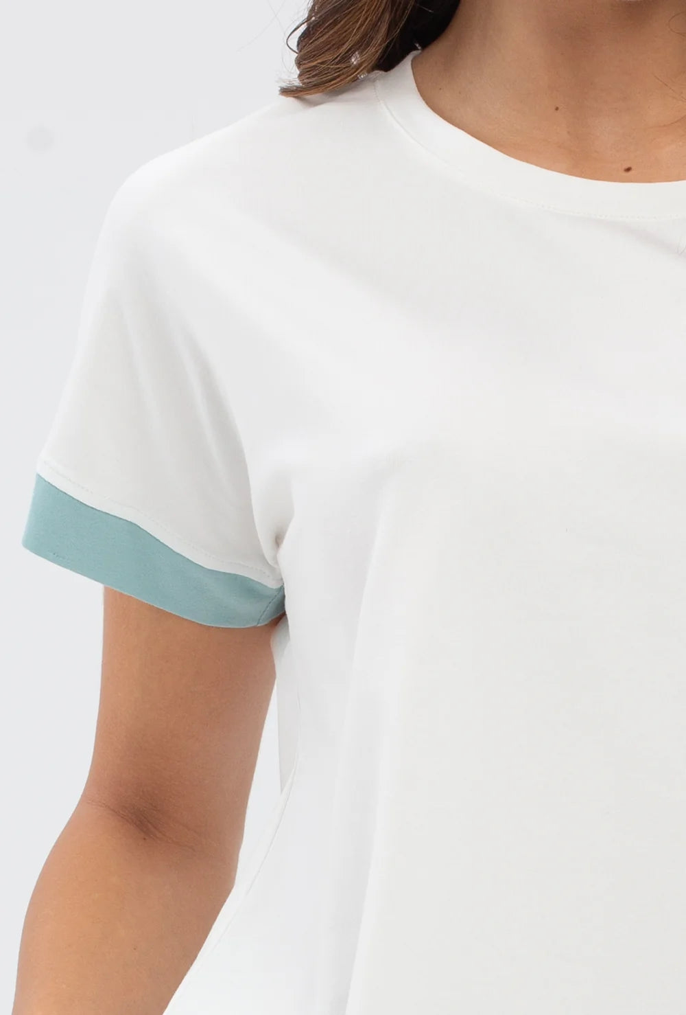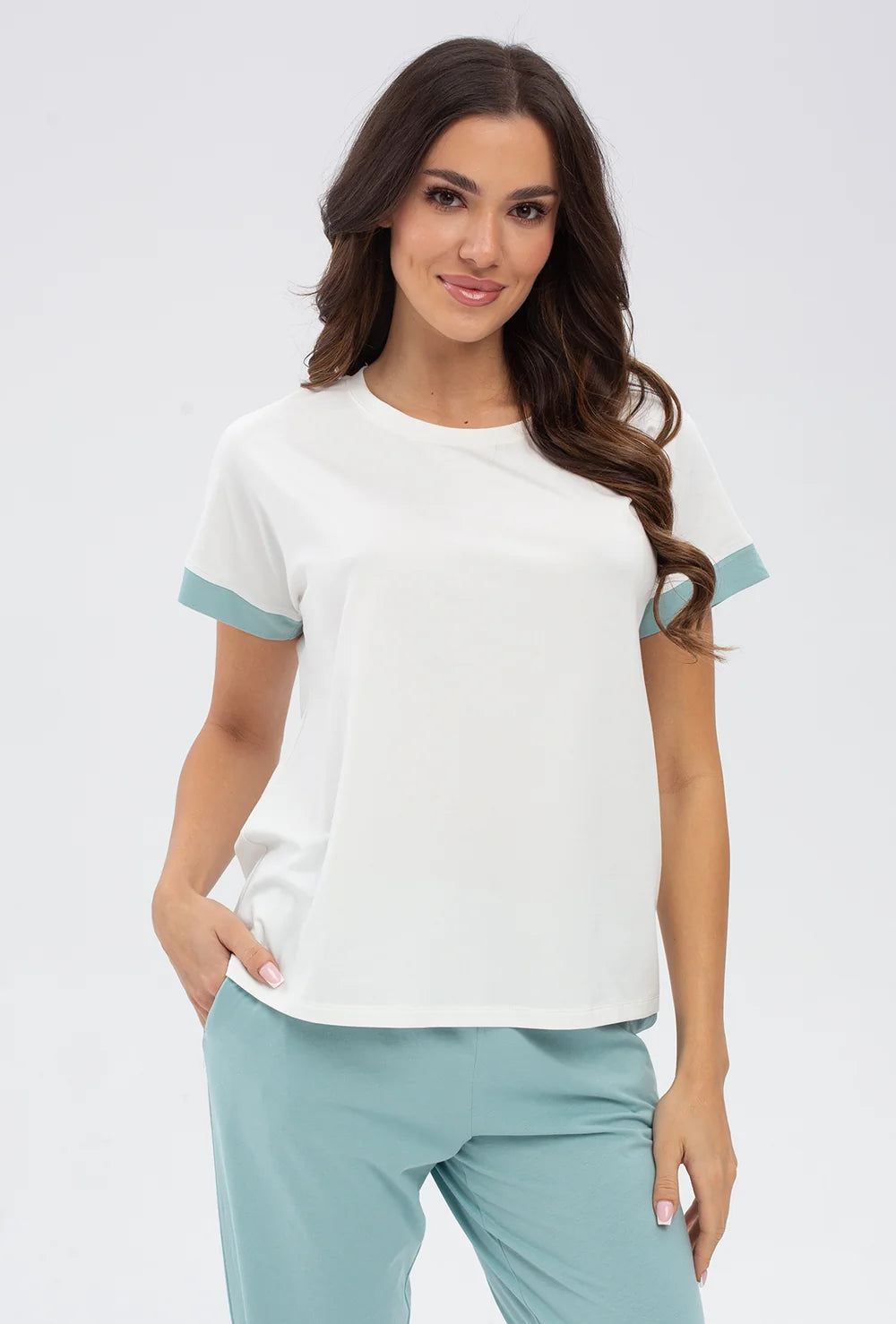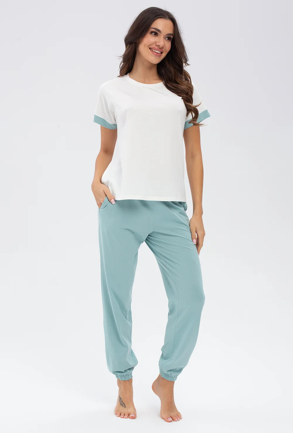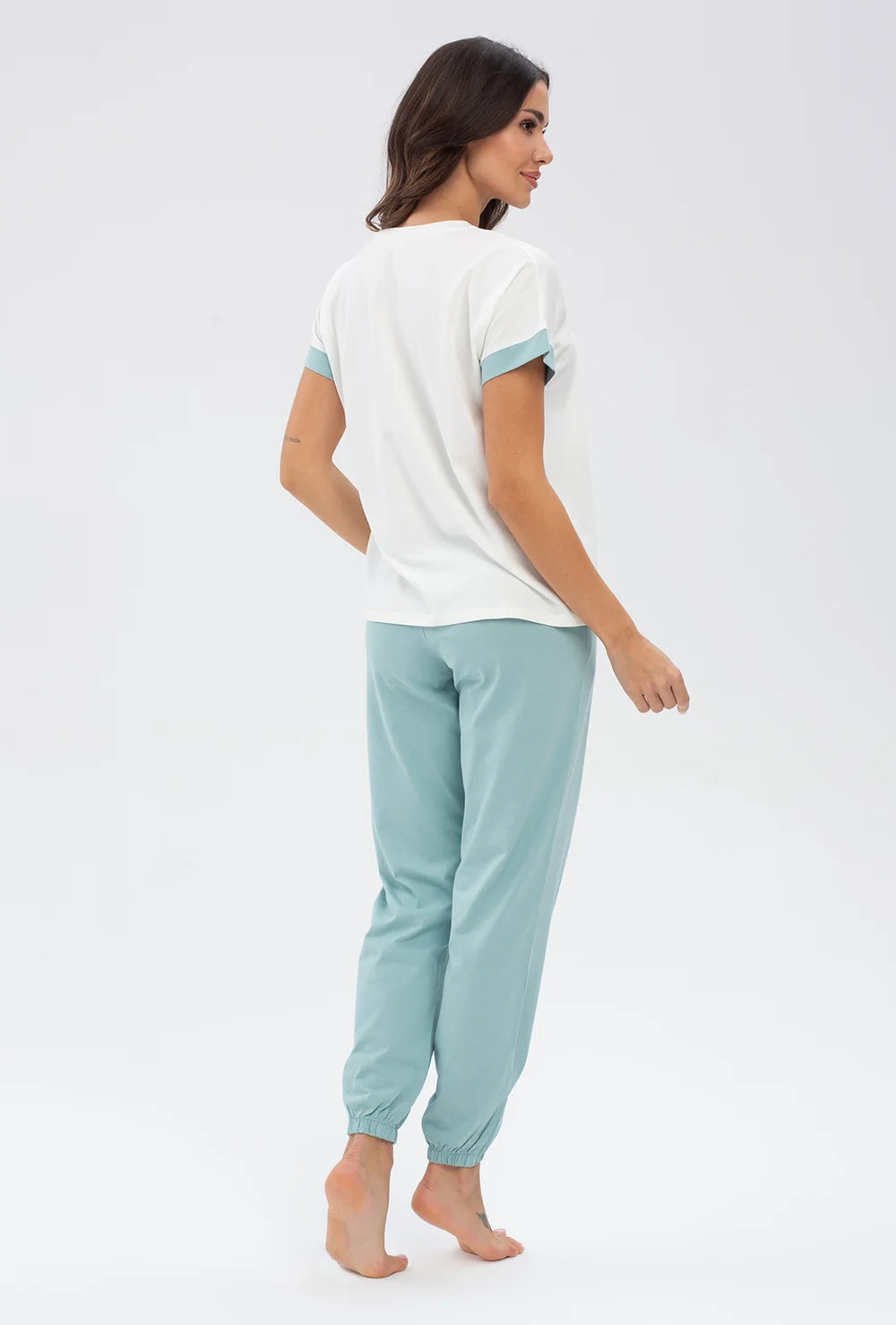 Piżama posiada luźny fason, który zapewnia swobodę ruchów. Góra z krótkim rękawem nadaje lekkości całemu zestawowi, natomiast długie spodnie z elastyczną gumką w pasie zapewniają wygodne dopasowanie i komfort noszenia.