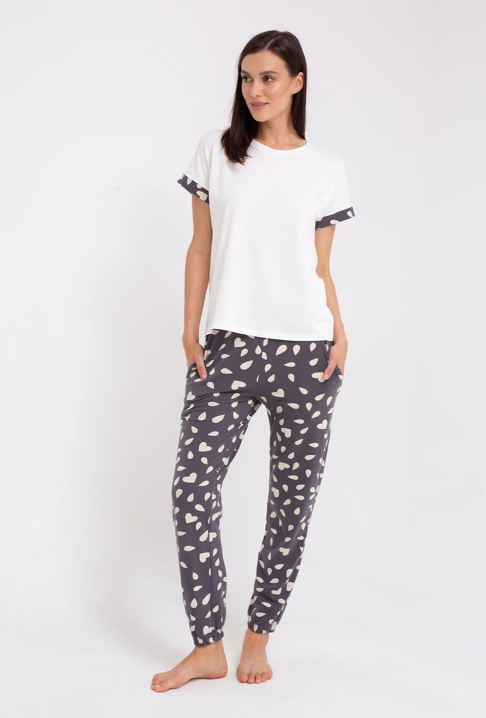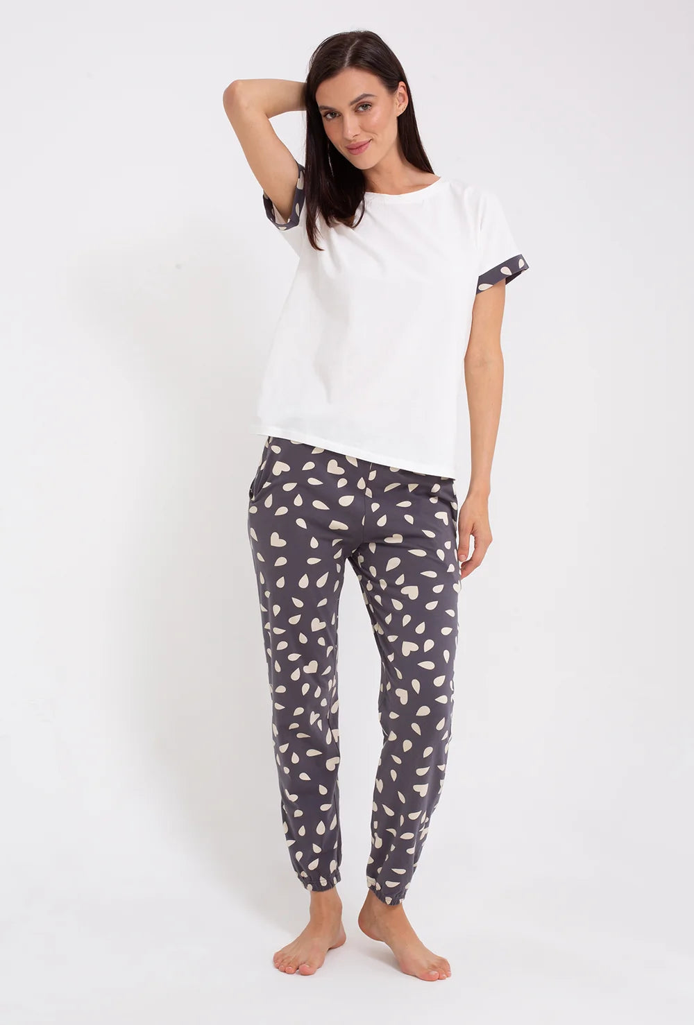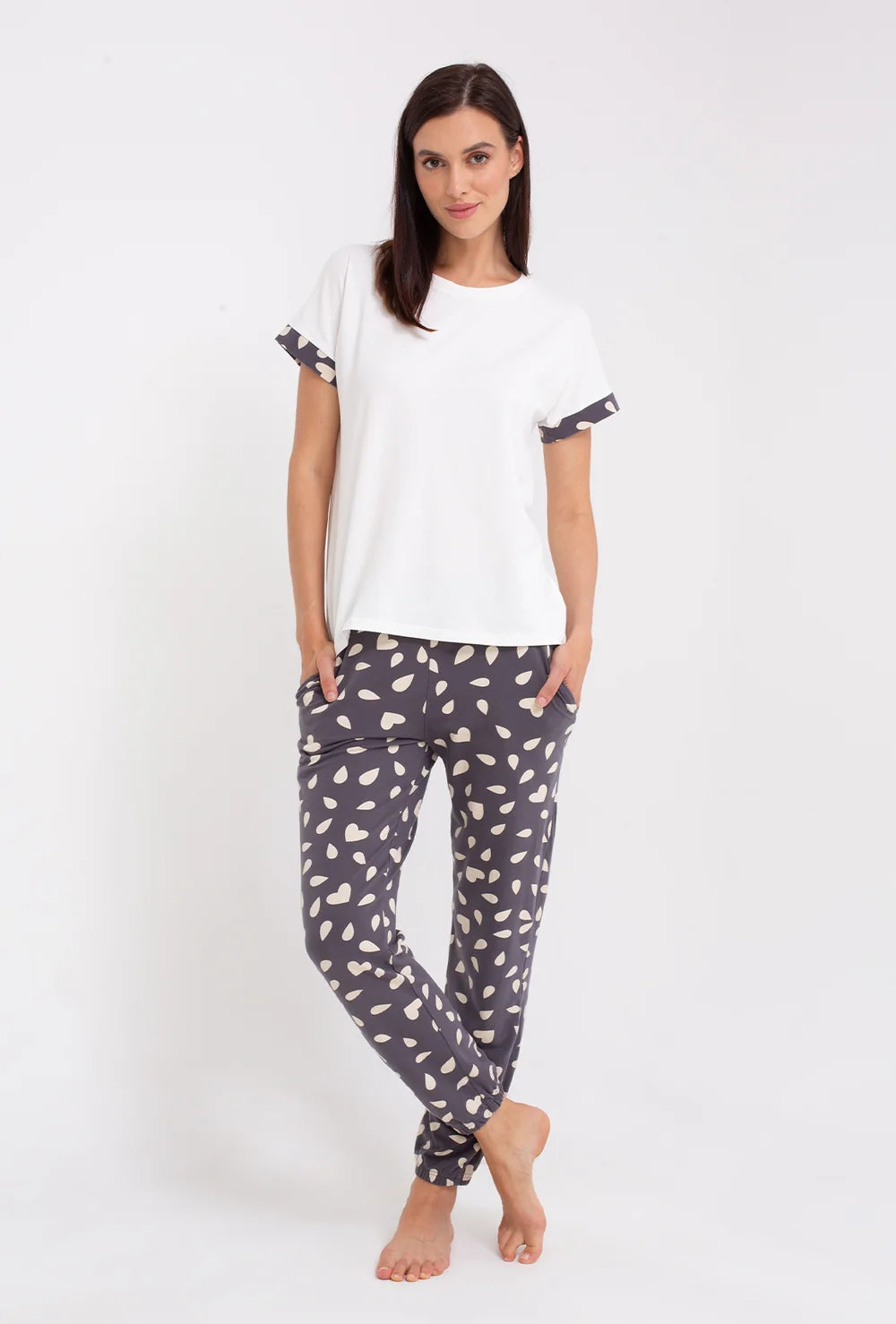 Grafitowo-biała kolorystyka, ciekawe wzornictwo oraz przemyślany krój - to znaki rozpoznawcze piżamy Luna. Grafitowe spodnie na całej powierzchni pokryte są delikatnym wzorem z motywem serca. Biała koszulka posiada grafitowe obszycia rękawów z tym samym deseniem, który widnieje na spodniach - dzięki temu oba te elementy tworzą tak spójny komplet i gotową stylizację do spania.