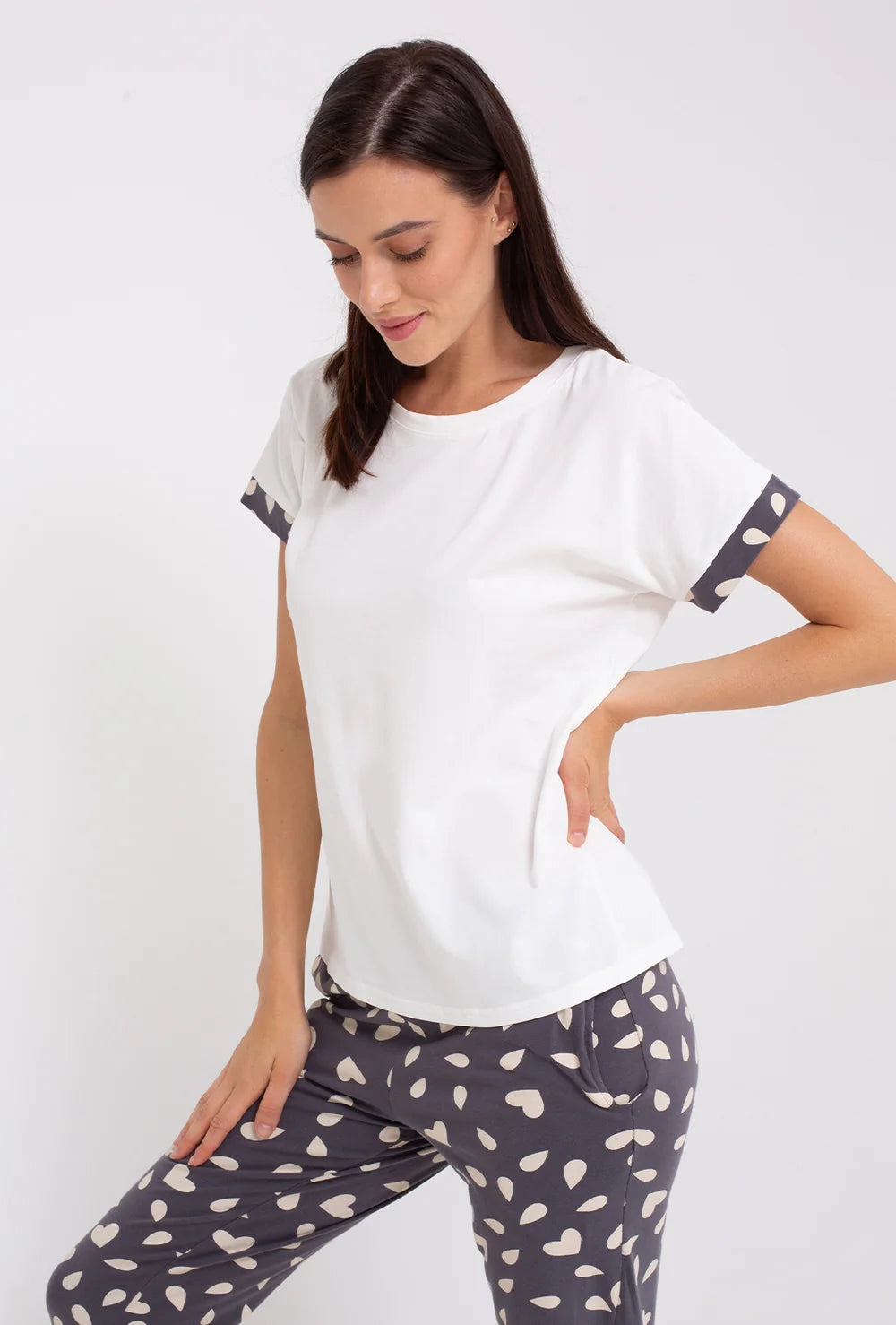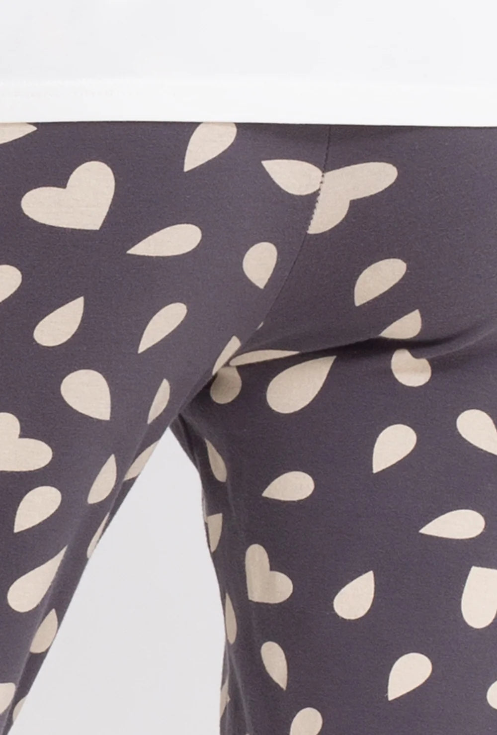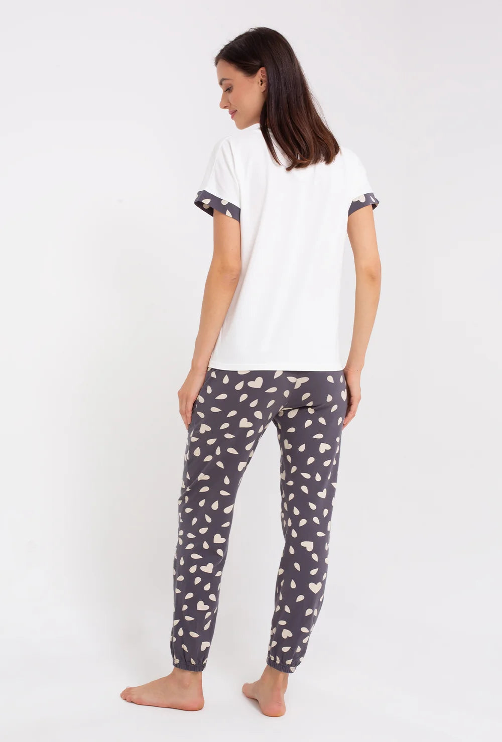 Grafitowo-biała kolorystyka, ciekawe wzornictwo oraz przemyślany krój - to znaki rozpoznawcze piżamy Luna. Grafitowe spodnie na całej powierzchni pokryte są delikatnym wzorem z motywem serca. Biała koszulka posiada grafitowe obszycia rękawów z tym samym deseniem, który widnieje na spodniach - dzięki temu oba te elementy tworzą tak spójny komplet i gotową stylizację do spania.