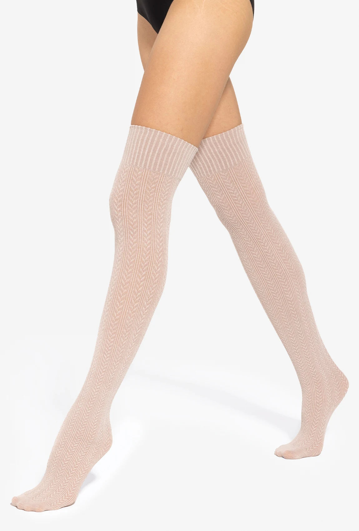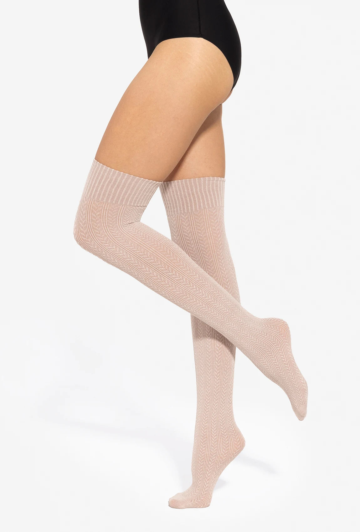 Model wyróżnia klasyczny, drobny wzór w jodełkę, który nadaje zakolanówkom elegancki i schludny wygląd. To ponadczasowy motyw, często kojarzony z zimową modą, który pięknie prezentuje się na nodze i dodaje całości struktury.