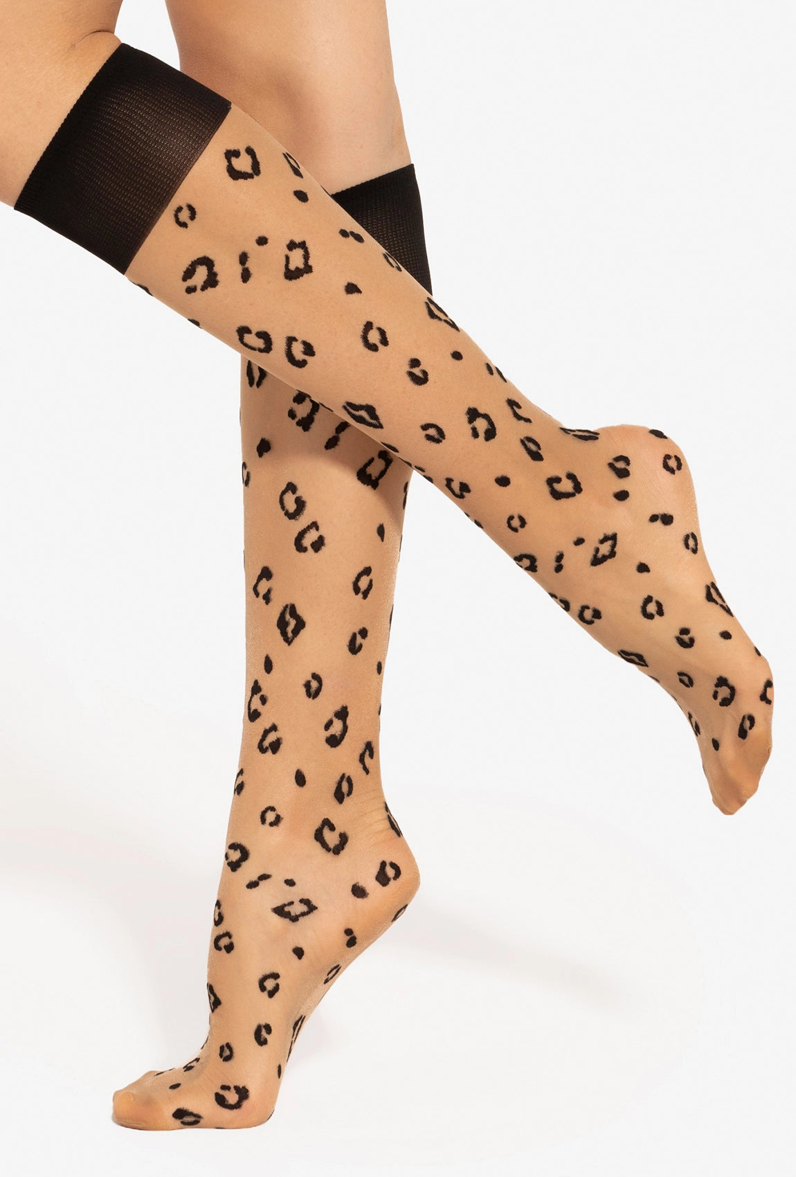 Beżowe podkolanówki w cętki 28 – subtelna elegancja z nutą drapieżności