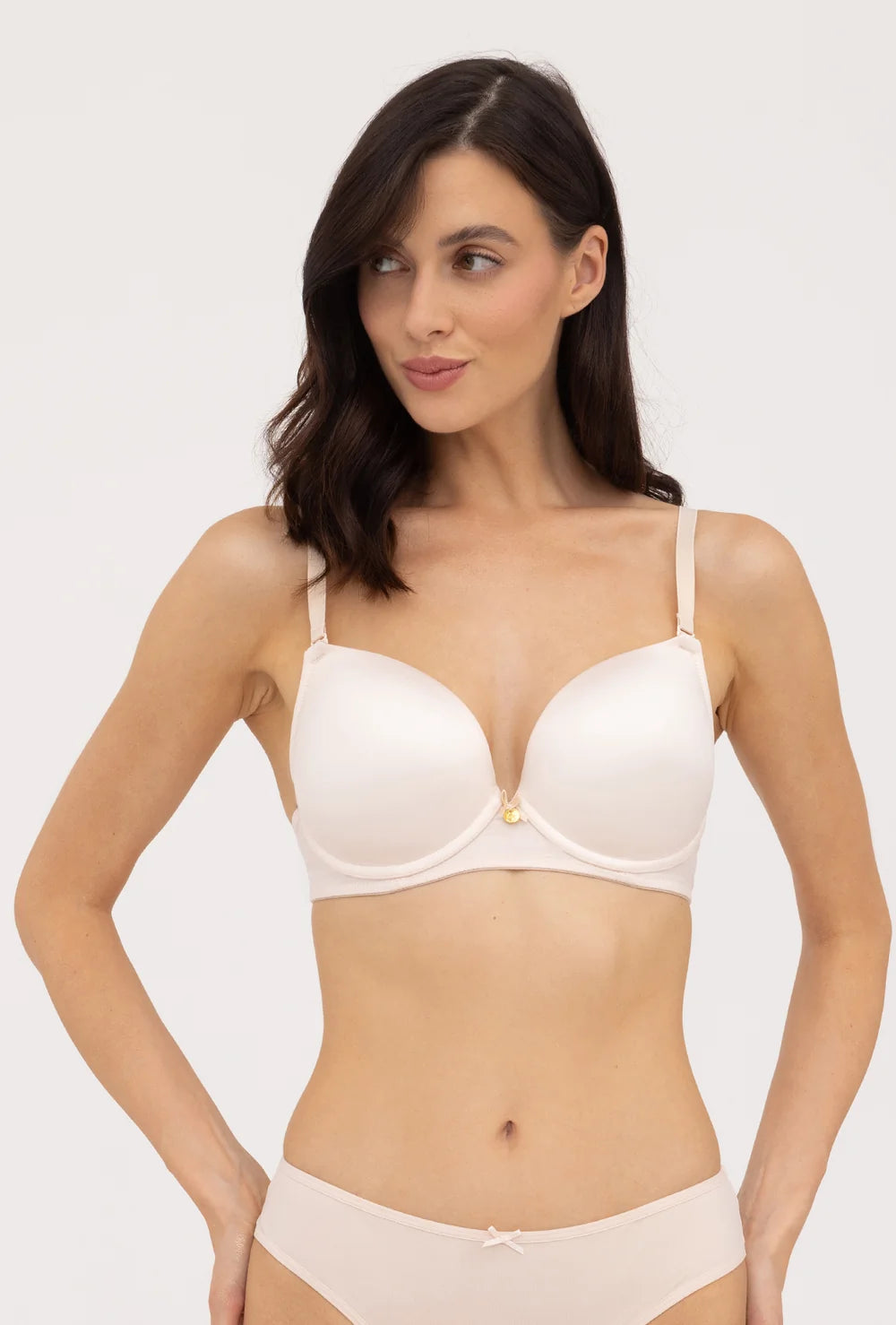 - Gładkie, termicznie formowane miseczki są niewidoczne pod ubraniem. Ich minimalistyczny i elegancki charakter dodatkowo podkreśla obłożenie delikatnie połyskującym materiałem.