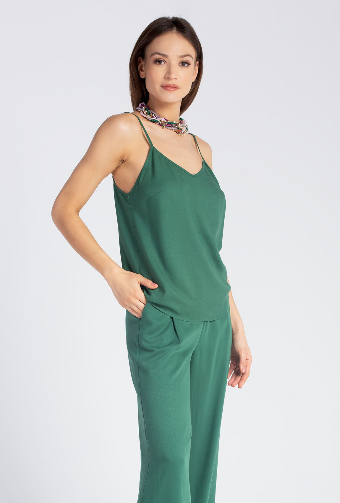 Nowa kolekcja odzieży Gatta to minimalistyczne modele, które zaprojektowano w trzech bardzo modnych w tym sezonie kolorach- czarnym, niebieskim i zielonym. Nasz damski top z łatwością połączysz zatem z klasycznymi jeansami lub szerokimi spodniami Ellery, tworząc tzw. matching set. Dzięki regulowanym ramiączkom dopasujesz ich długość do swoich potrzeb, a jeśli będzie Ci za chłodno, zarzucisz na ramiona lekką kurtkę lub marynarkę. Noś damską koszulkę na cienkich ramiączkach Loreli tak, jak lubisz, na własnych zasadach!