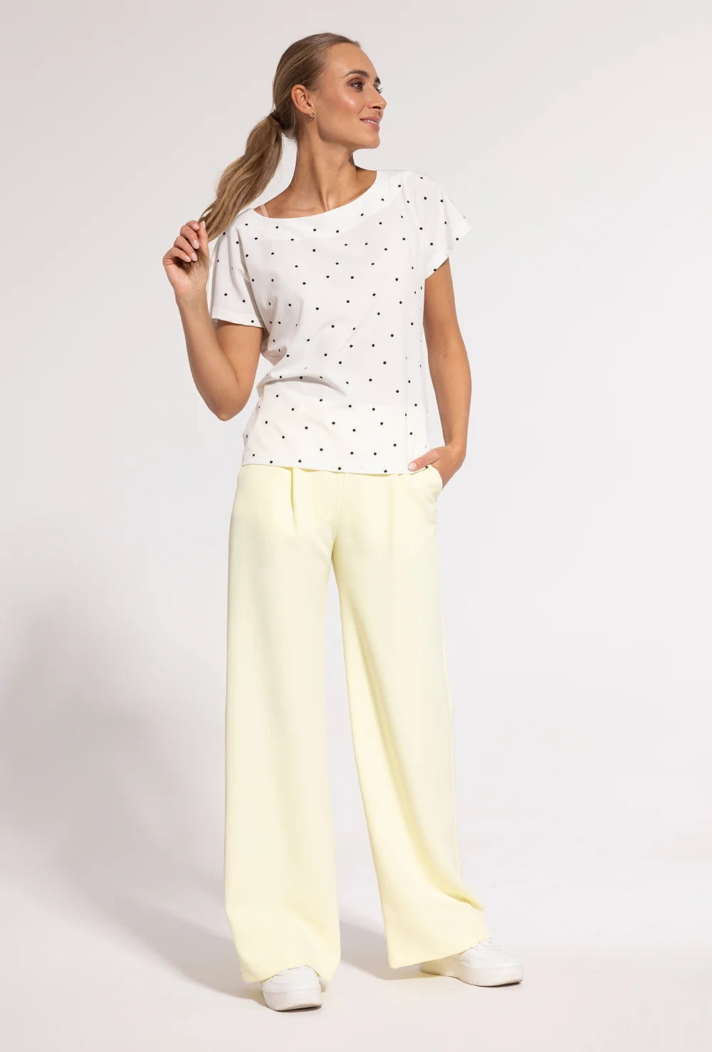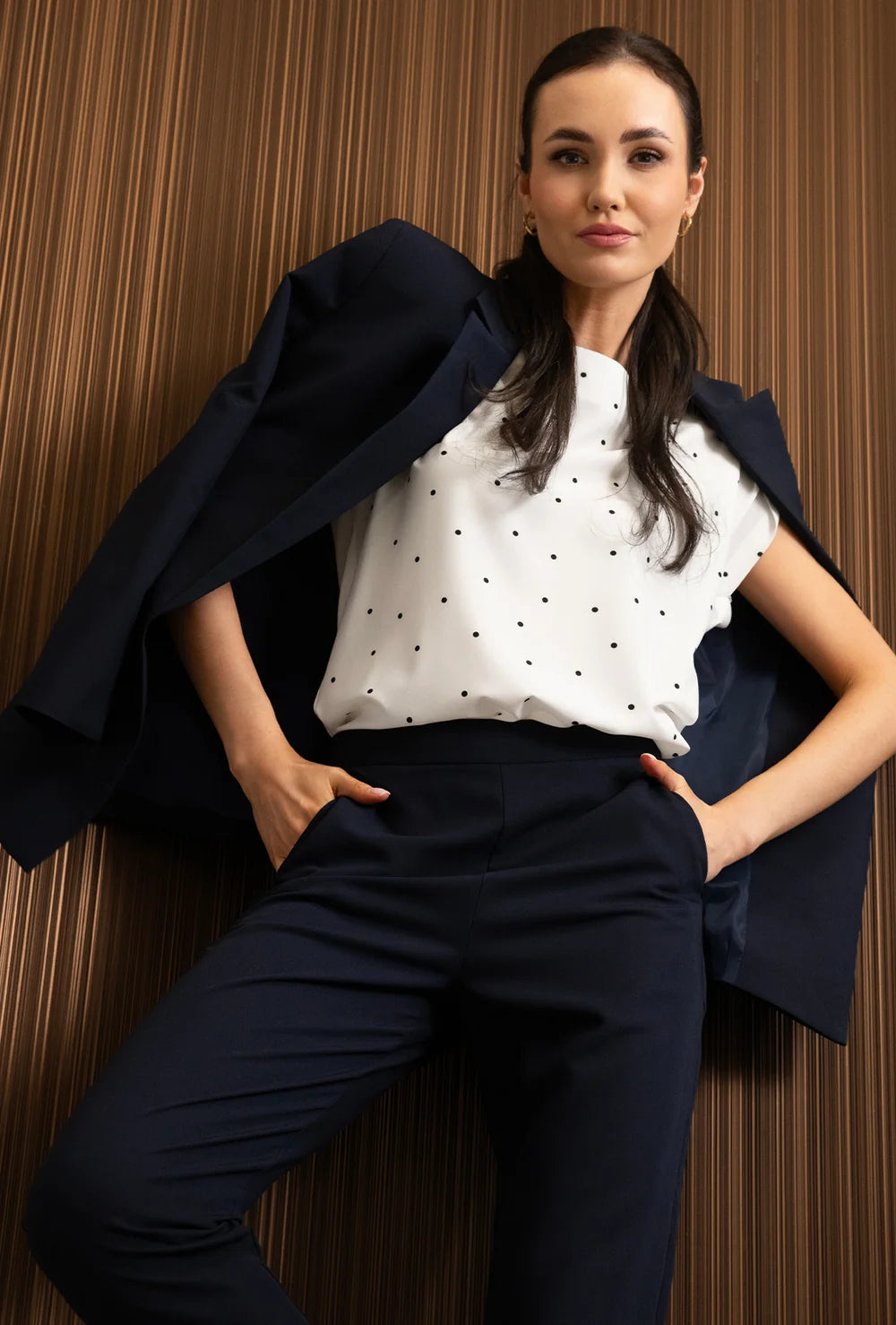 Zastanawiasz się, czy w swojej szafie masz ubrania, które będą współgrać z koszulką z krótkim rękawem w kropki Doti? Co powiesz zatem na przepis na prostą stylizację w duchu casual? Połącz bluzkę z jeansami straight leg lub mom fit, białymi sneakersami i beżowym trenczem lub jeansową kurtką (jeśli chcesz stworzyć denim total look). Szukasz pomysłu na nieco bardziej elegancki look? Zestaw bluzkę z czarnymi cygaretkami, marynarką w kolorze fuksji i beżowymi czółenkami lub balerinami. Zdecyduj się na zakup naszego T-shirtu w kropki i twórz modne stylizacje każdego dnia!