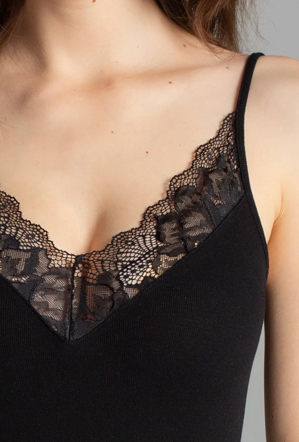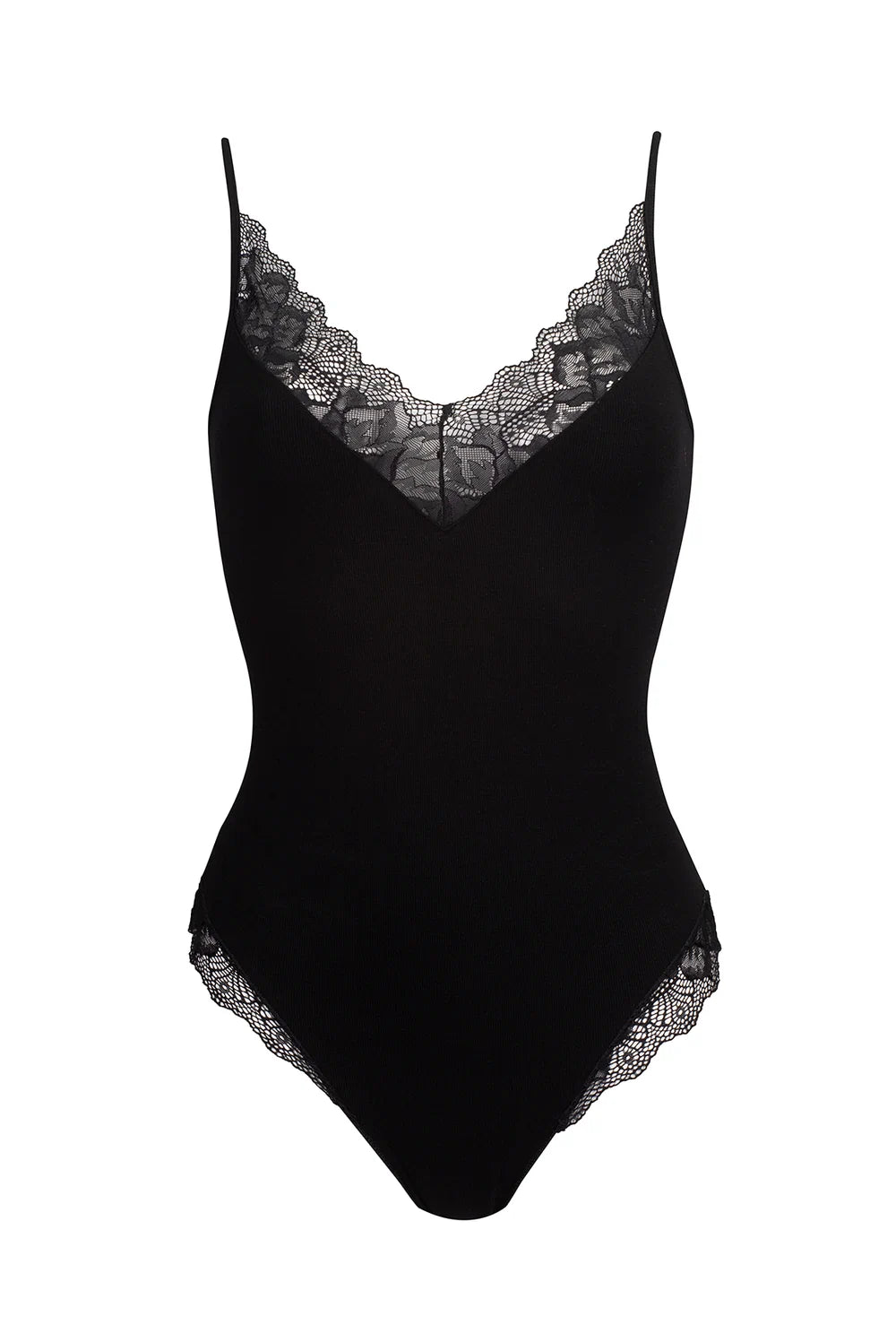 - Body ma cienkie ramiączka, dekolt w V oraz mocno wycięty tył, który eksponuje plecy. Dekolt oraz część majteczkowa ozdobiona jest subtelną koronką z kwiatowym motywem, co dodaje body kobiecego, romantycznego charakteru.