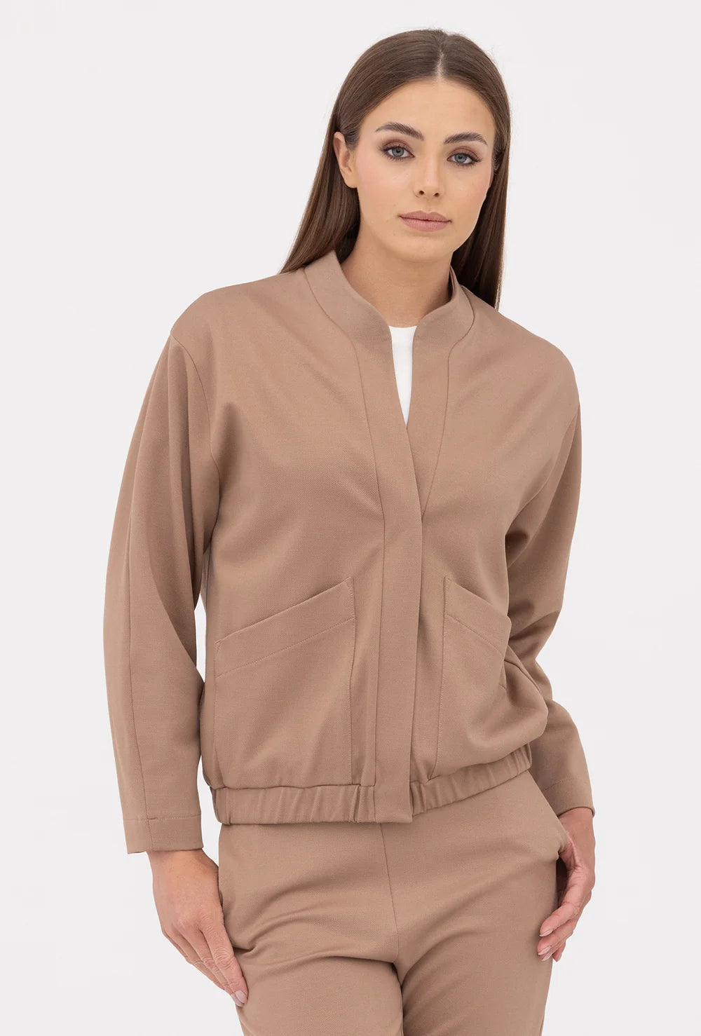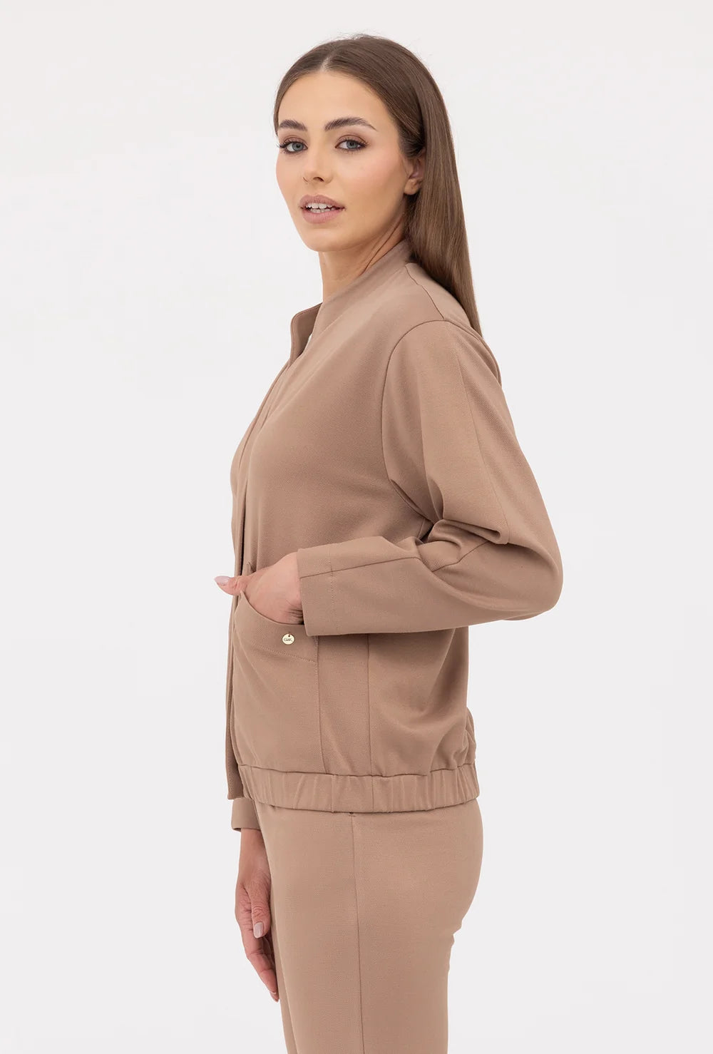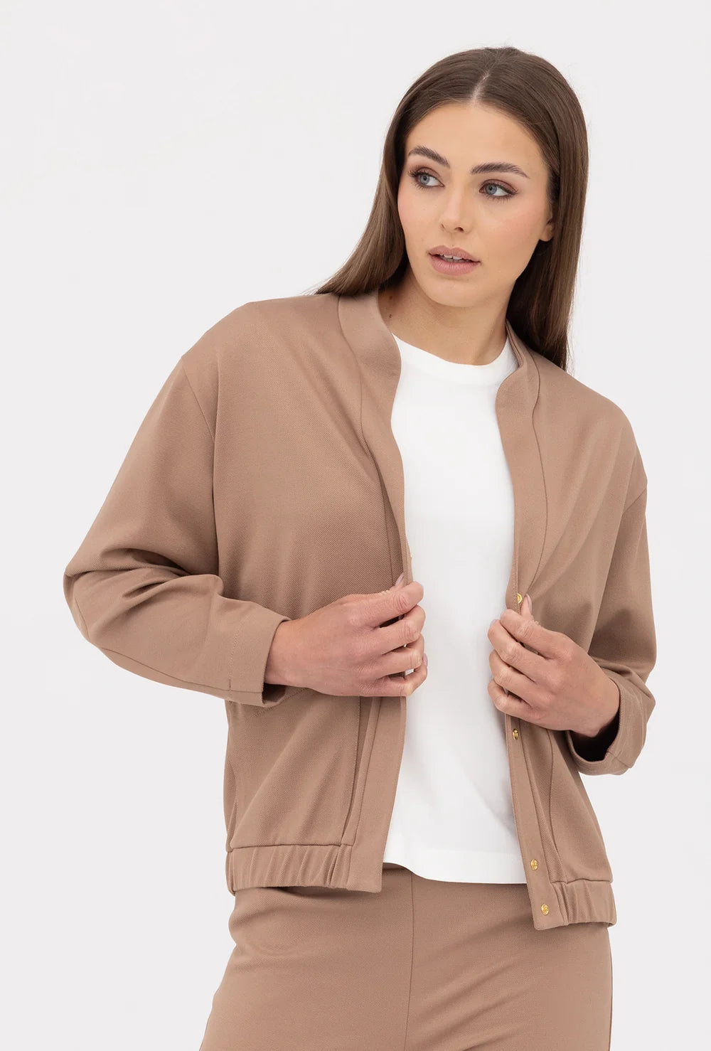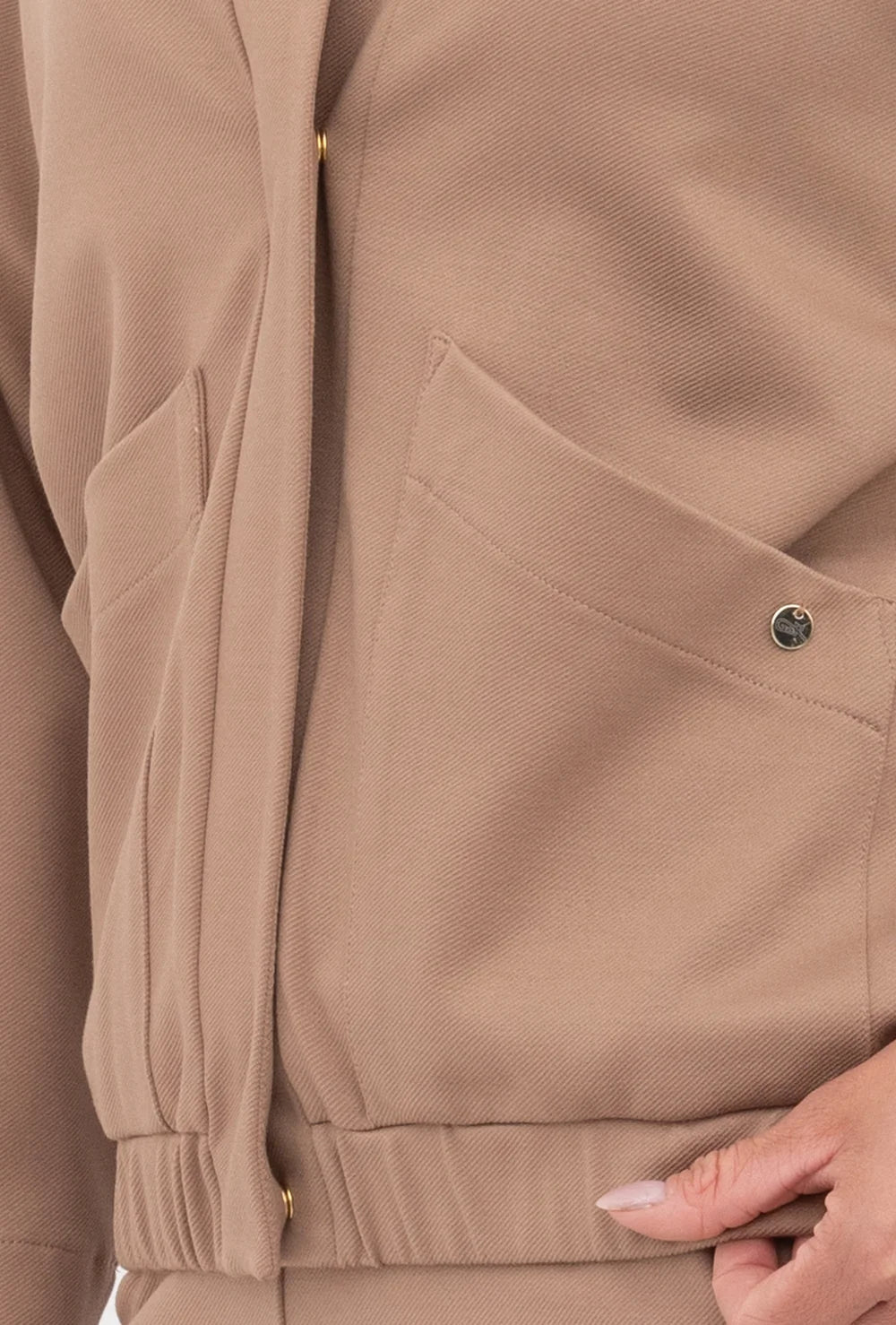 Bomberka Nella ma w sobie casualowy luz z nutką eleganckiego minimalizmu. Jej ogromnym atutem jest jednak nie tylko neutralna estetyka, ale też wygoda noszenia. Ten komfortowy fason charakteryzuje się zapięciem na ukryte napy oraz niską stójką, która świetnie układa się na sylwetce i pozwala wyeksponować dodatki - na przykład modną apaszkę. Dodatkowo niska stójka chroni dekolt przed chłodem i dlatego ten model bomberki będzie idealnym wyborem do jesiennych i wiosennych stylizacji.