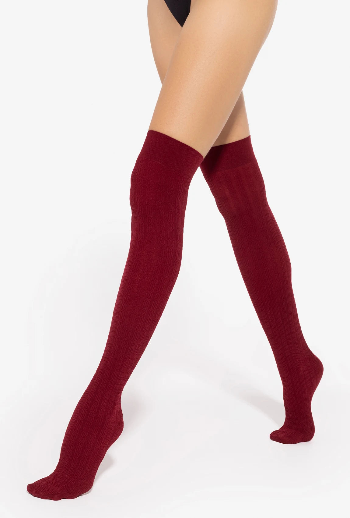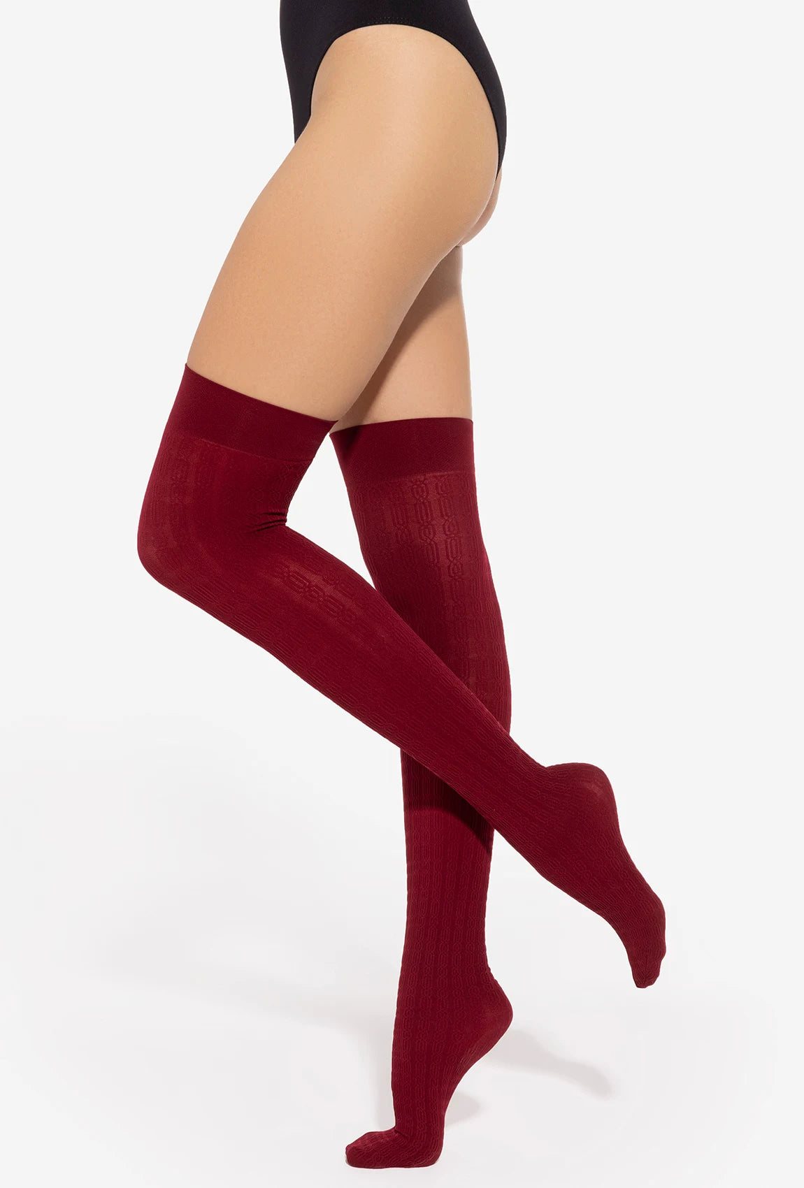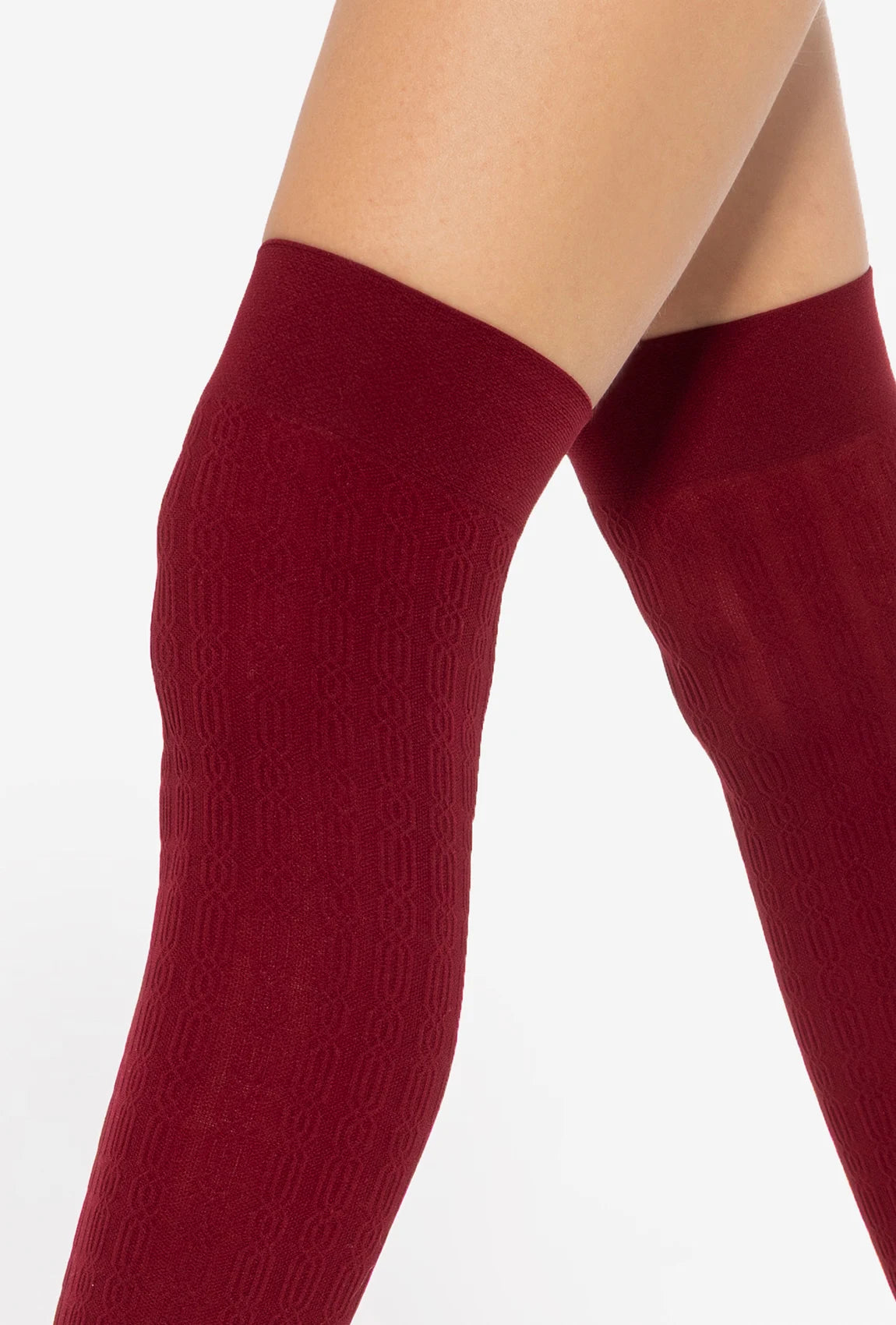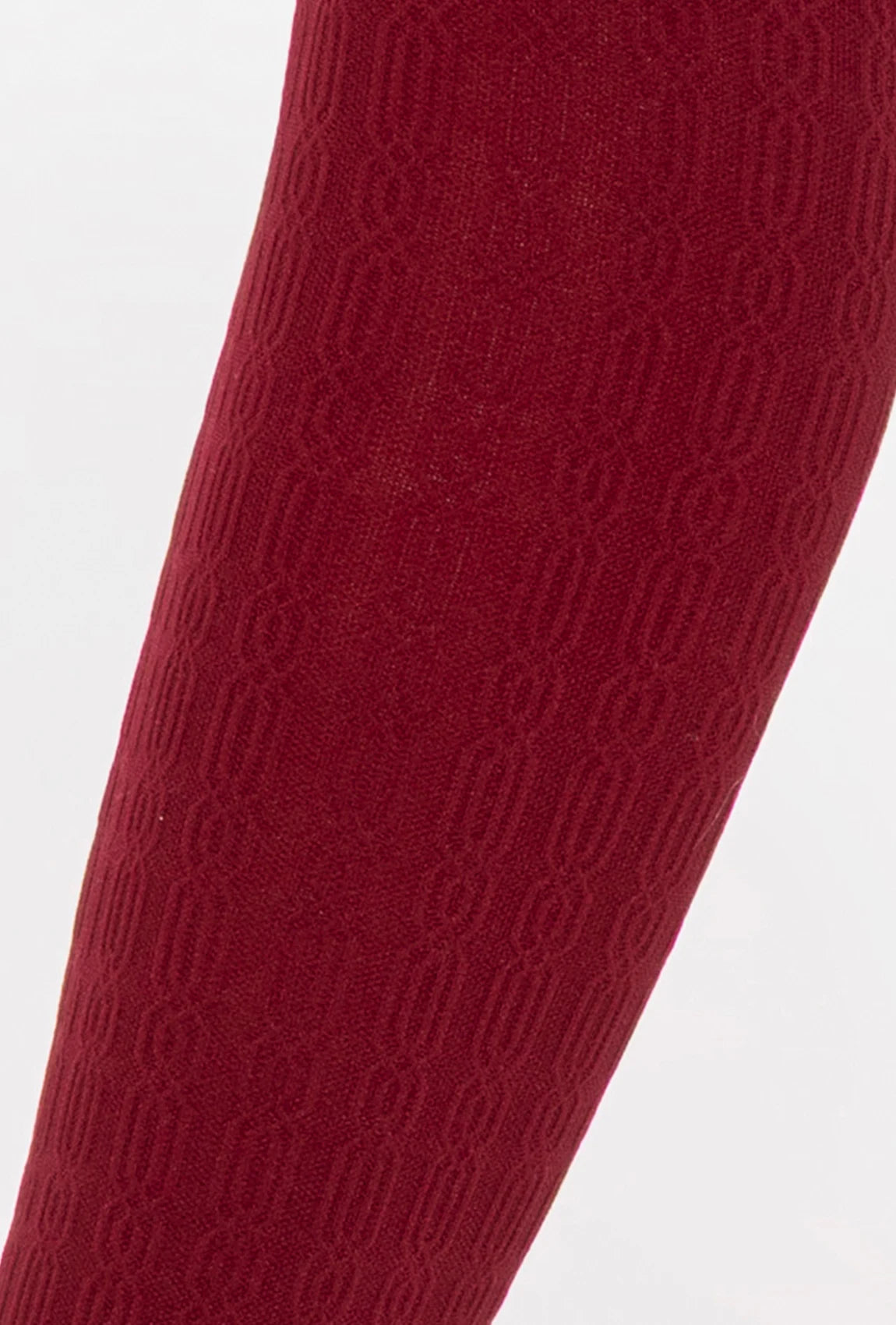 Bordowe zakolanówki 01 w odcieniu Vinaccia to kryjący, wzorowany model o matowym wykończeniu. Delikatny warkoczowy motyw i głęboki kolor sprawiają, że to stylowy i kobiecy dodatek, idealny na chłodniejsze dni.