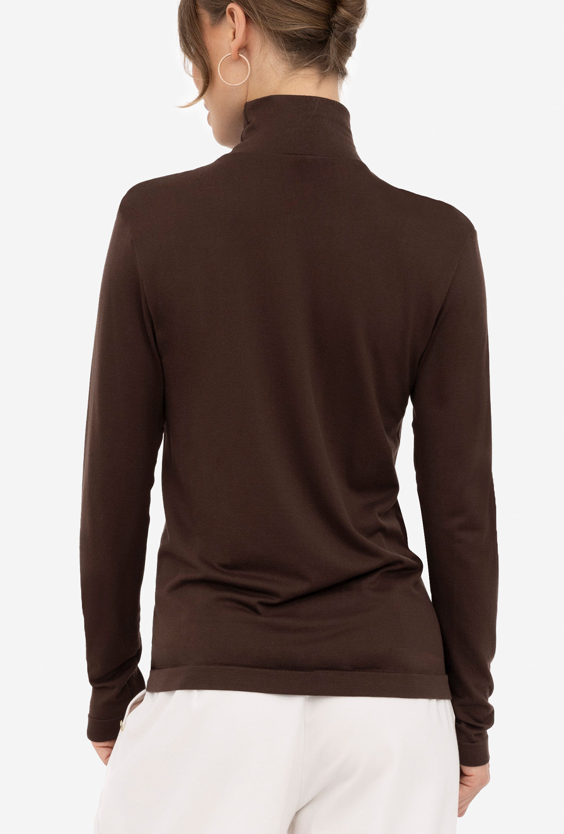 Golf Chiara w odcieniu Coffee Bean 2 świetnie wygląda w połączeniu z jasnymi spodniami lub spódnicą z wysokim stanem. Można go zestawić z marynarką, kardiganem lub płaszczem - sprawdzi się zarówno w pracy, jak i w codziennym, swobodnym zestawie.