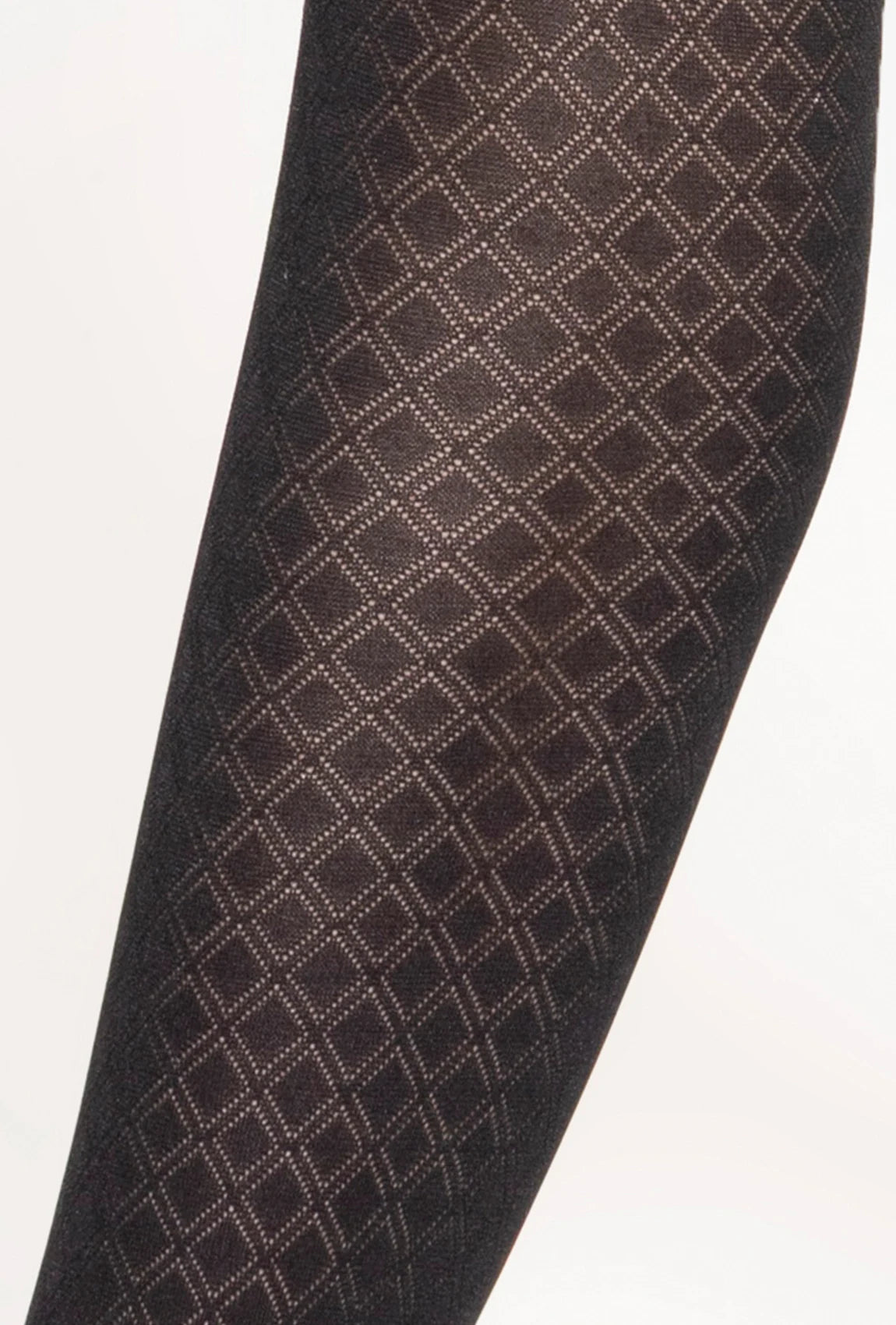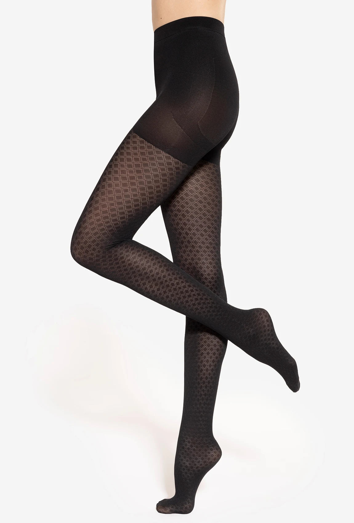 Modelujące rajstopy wzorzyste Modeline 08 w kolorze Nero to elegancki model o matowym wykończeniu, z delikatnym geometrycznym wzorem i modelującą częścią majtkową. Łączą w sobie ponadczasową klasykę i wygodę, idealne na każdą okazję.
