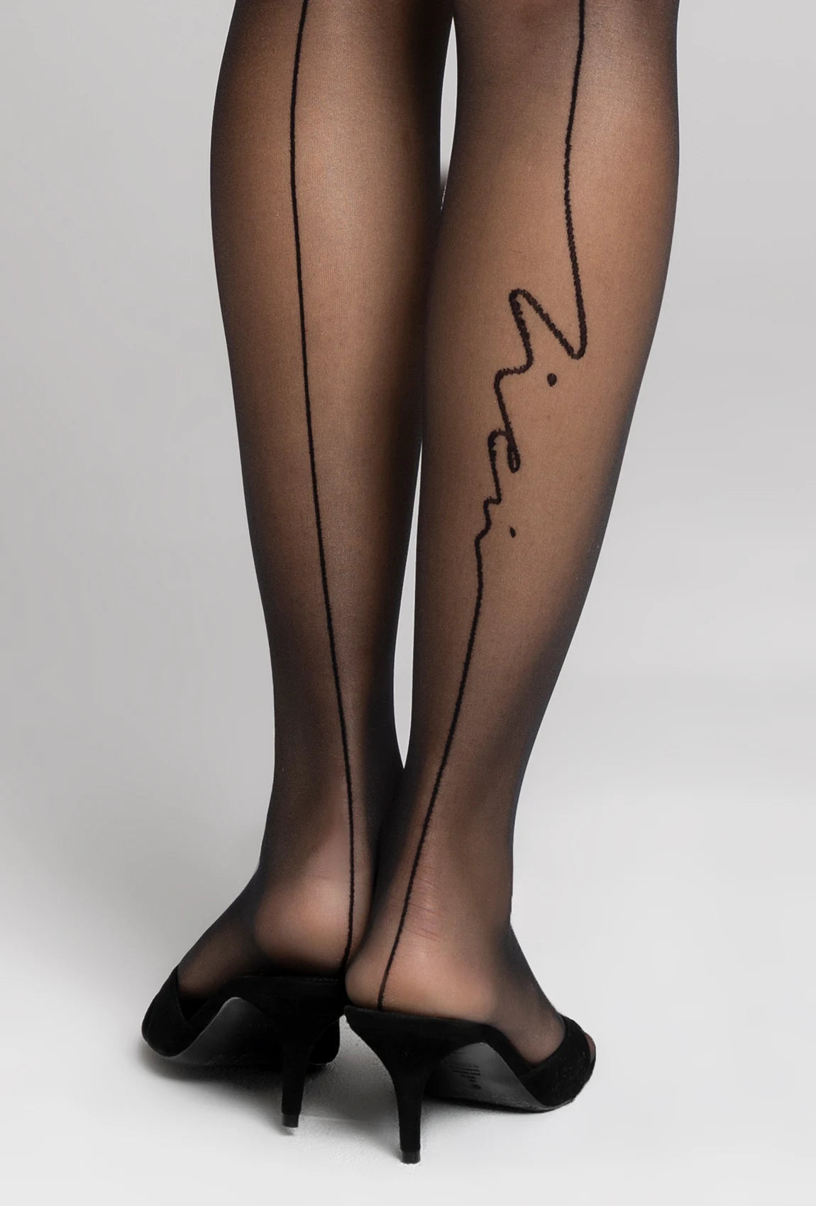 Mocną stroną rajstop Signature jest minimalistyczna, elegancka, a jednocześnie lekko zaskakująca estetyka. To cienki model 15 den, który idealnie sprawdza się w stylizacjach biurowych, wieczorowych lub okolicznościowych. Cienki szew z tyłu podkreśla linię nóg, a wkomponowana w niego sygnatura projektanta dodaje całości niebanalnego charakteru.