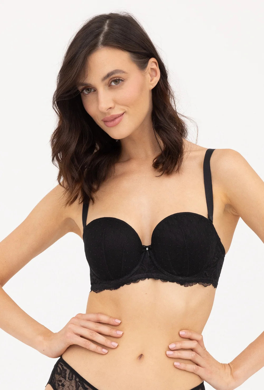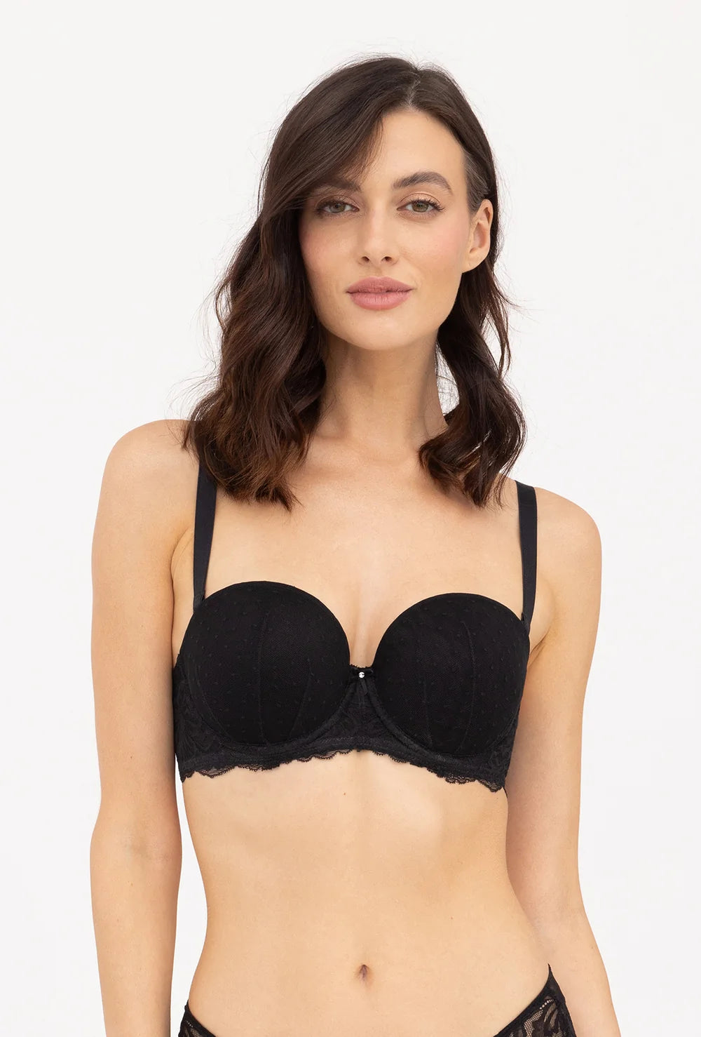 Szukasz biustonosza, który będzie pasować do bluzek lub sukienek z głębokim, poziomym dekoltem? Jeśli tak, to jesteś we właściwym miejscu - czarny biustonosz bardotka Monique jest odpowiedzią na Twoje zakupowe potrzeby! Cechą charakterystyczną tego modelu są głębokie, usztywniane miseczki i regulowane, odpinane ramiączka z możliwością przepięcia. Dzięki nim będziesz mogła dopasować ich ułożenie do rodzaju dekoltu lub upodobań. Nasza czarna bardotka posiada także zapięcie na haftki z możliwością regulacji obwodu nawet o jeden rozmiar. Zdecyduj się na jej zakup i przekonaj się o tym osobiście!