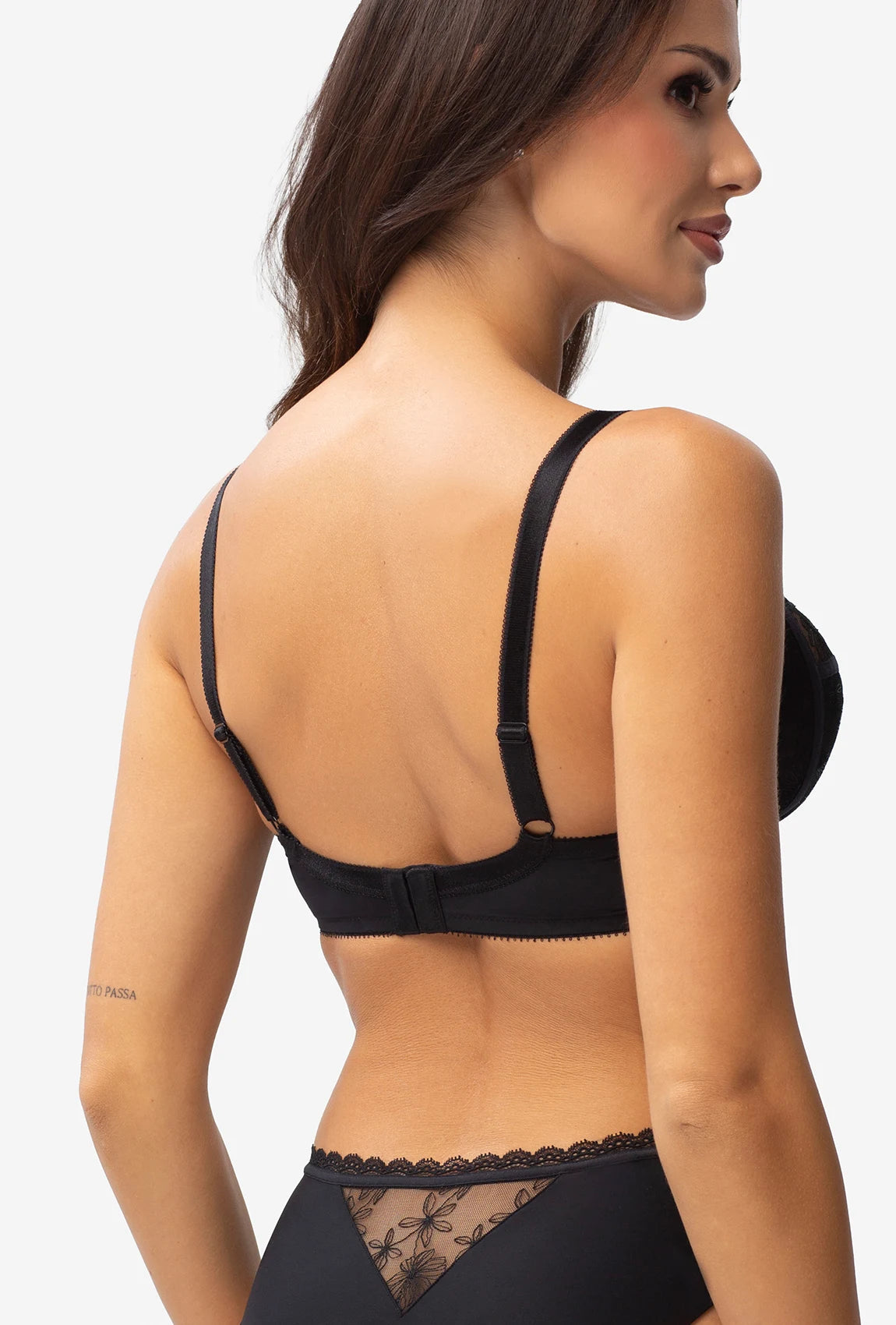 Klasyczny, a jednocześnie nieco awangardowy – czarny biustonosz Kate z fiszbinami oraz z odpinanymi dekoletkami, które akcentują dekolt i urozmaicają stylizację. Jego znakiem rozpoznawczym są również miękkie miseczki wykonane z koronki z motywem kwiatowym. Ponieważ model ten utrzymany jest w klasycznej czerni, będzie idealnym wyborem do wielu stylizacji!