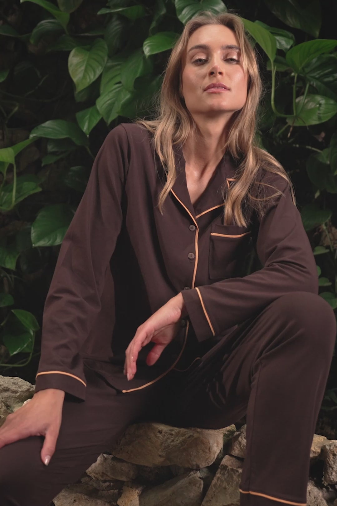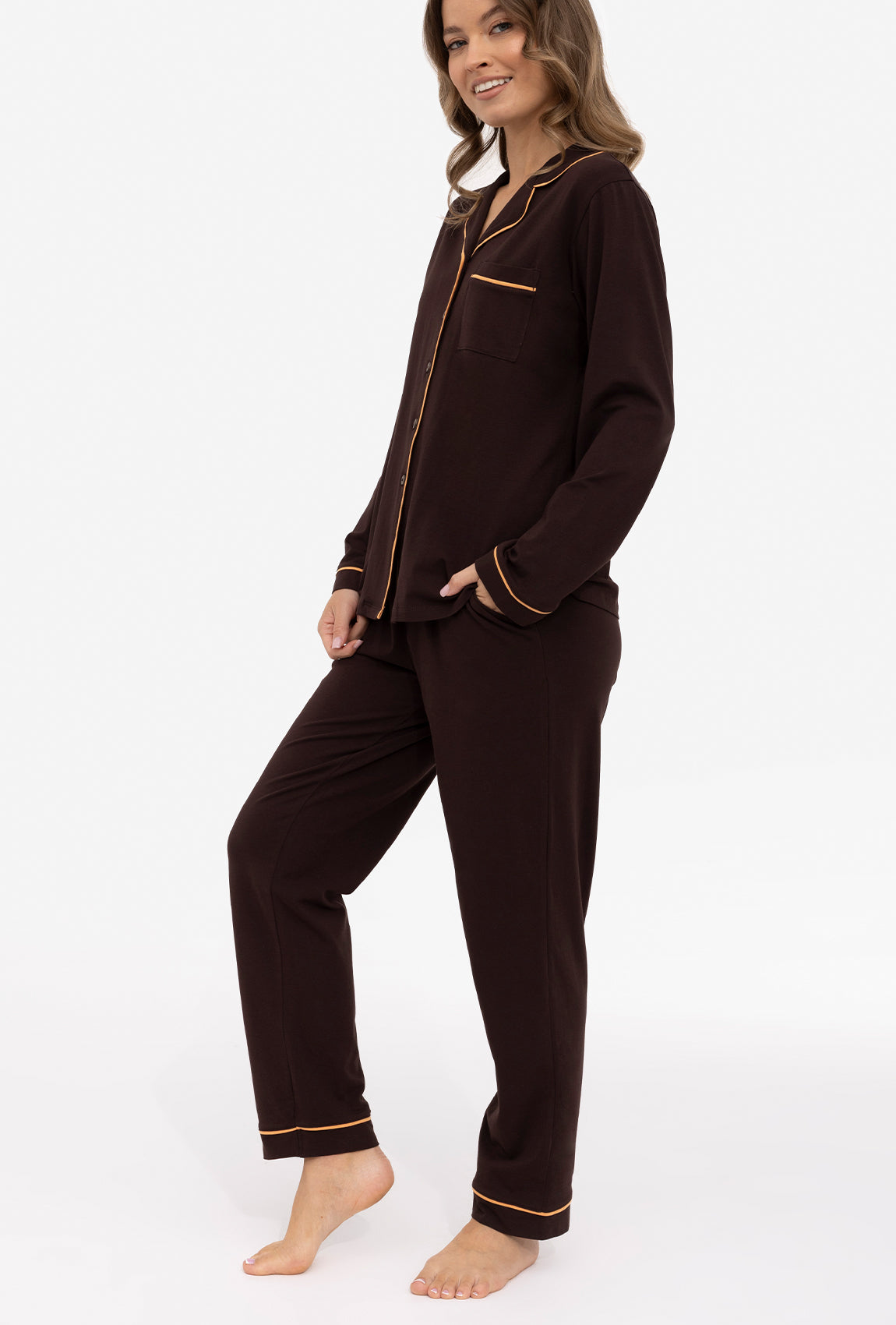 Klasyczna i elegancka piżama dwuczęściowa Choco urzeka apetycznym odcieniem gorzkiej czekolady oraz ponadczasowym fasonem. To model z koszulową górą i swobodnymi spodniami – idealny do spania lub jako wygodny strój domowy. Czym jeszcze zaskoczy Cię ten model?
