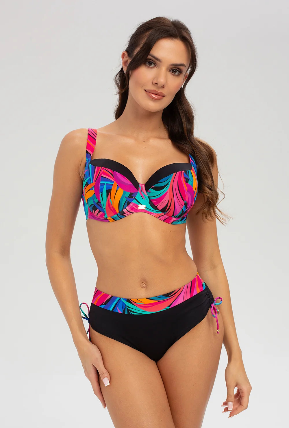 Dół od stroju kąpielowego Marmaris z podwyższoną talią to świetna propozycja dla Pań o pełniejszych kształtach. Model ten delikatnie modeluje sylwetkę oraz dodaje jej lekkości dzięki dekoracyjnym troczkom po bokach. Kontrastowa wstawka z barwnego materiału świetnie komponuje się w połączeniu z czernią i wprowadza do plażowej stylizacji sporo dobrej energii.
