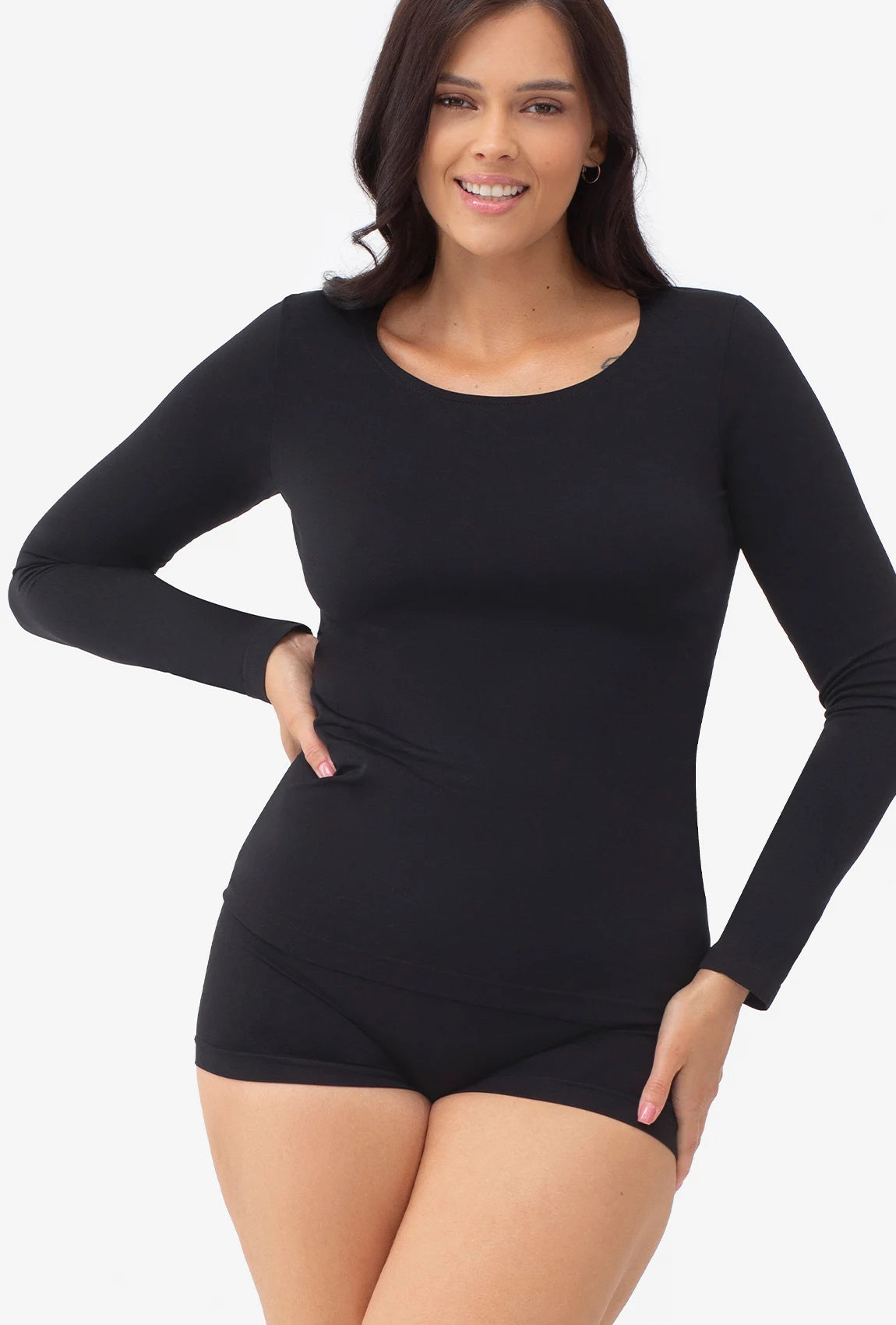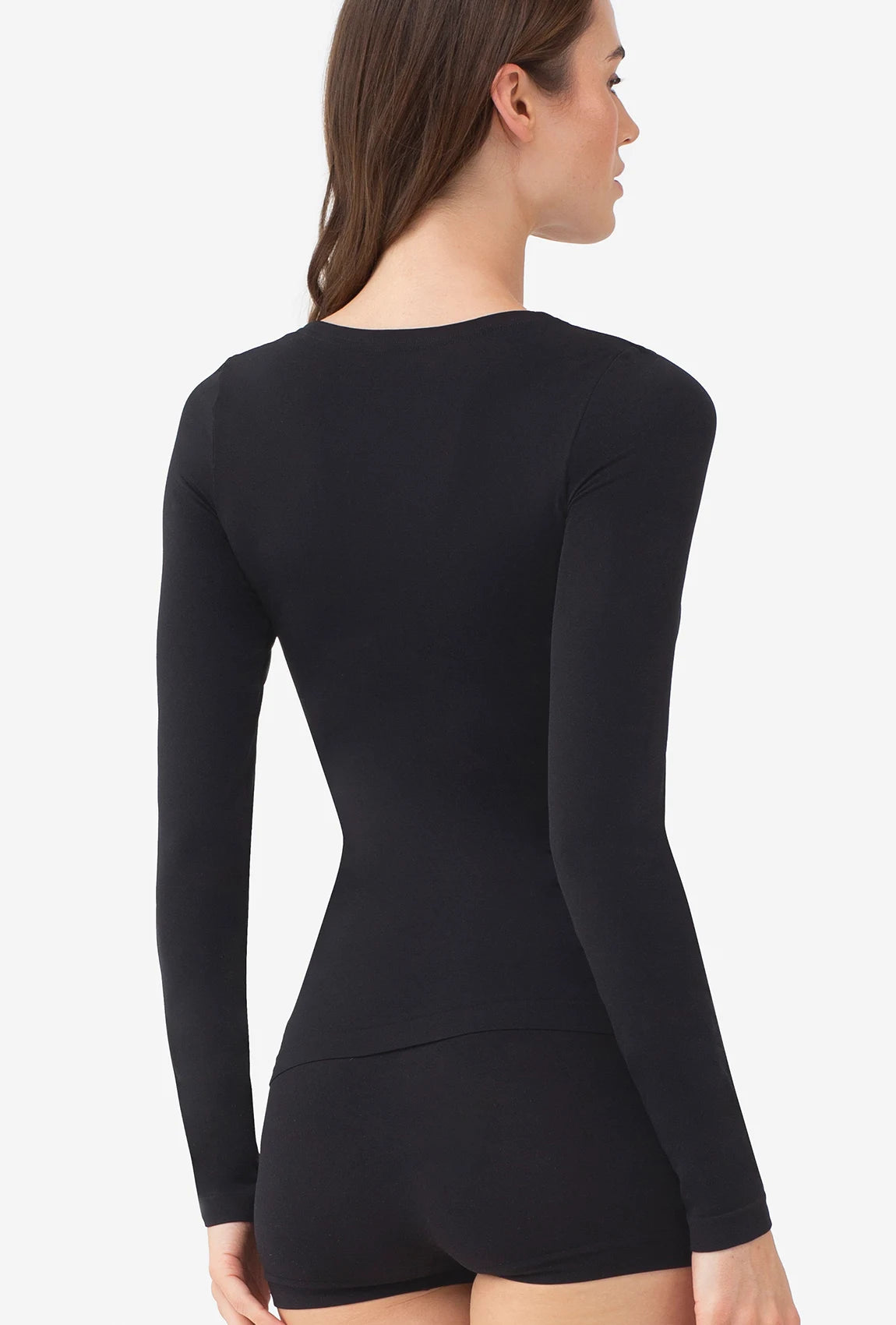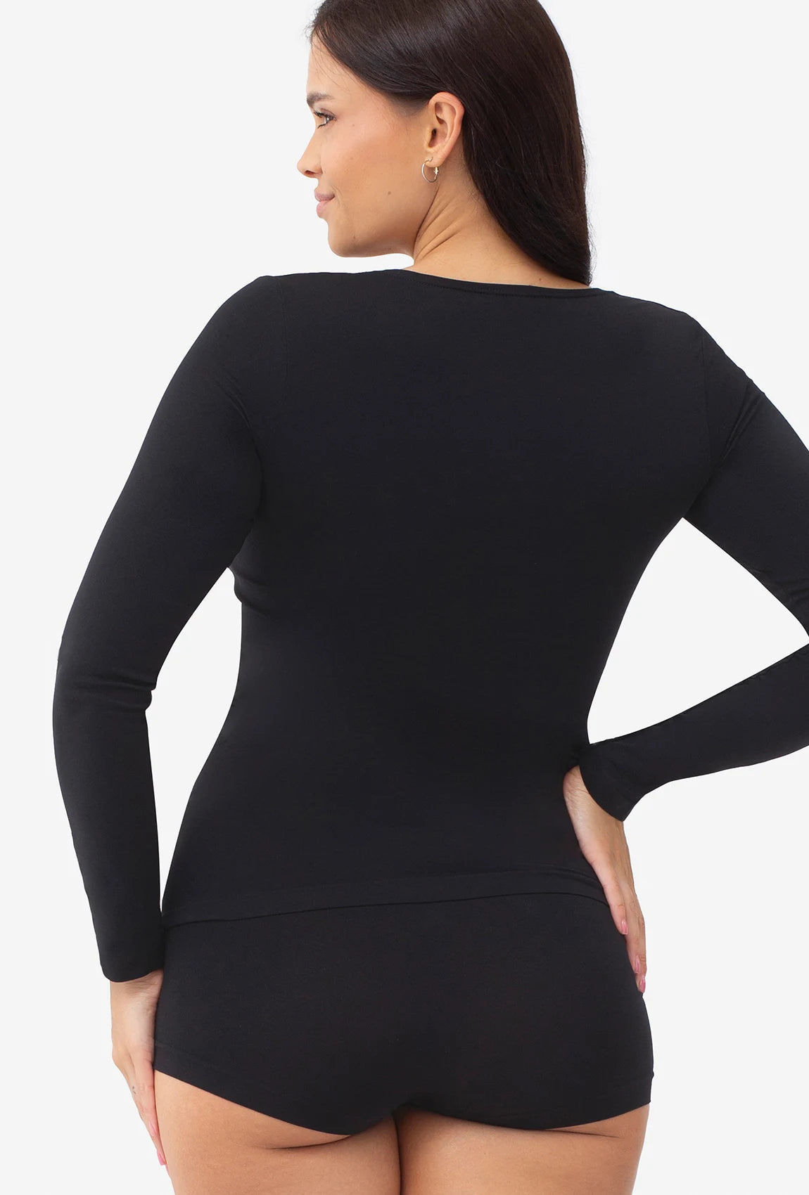 - Zabudowana górna część sensualnego kobiego body, w zmysłowy sposób komponuje się z długim rękawkiem, który perfekcyjnie dopasowuje się do kształtu rąk, zapewniając jedność i spójność kreacji.