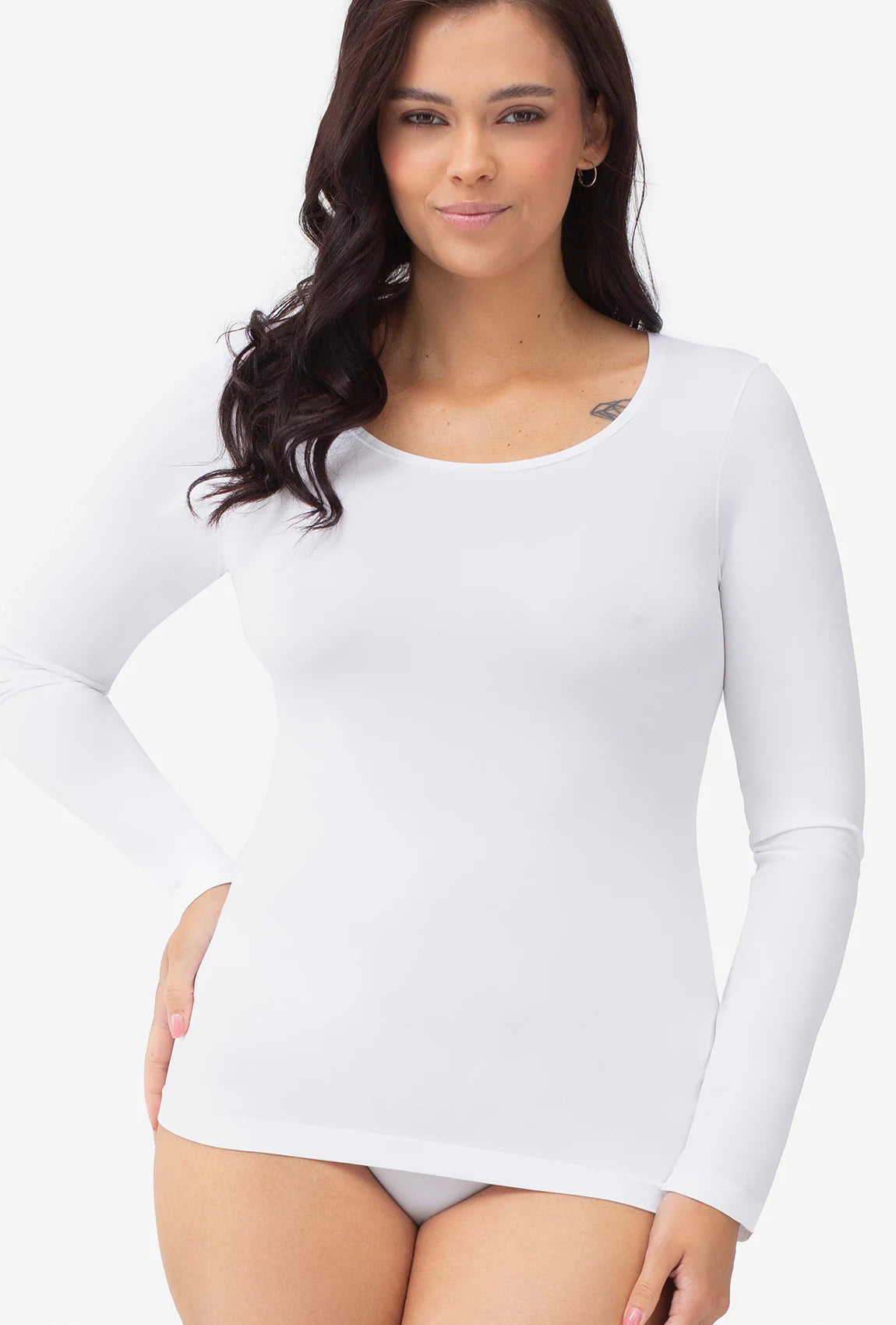 - Zabudowana górna część sensualnego kobiego body, w zmysłowy sposób komponuje się z długim rękawkiem, który perfekcyjnie dopasowuje się do kształtu rąk, zapewniając jedność i spójność kreacji.