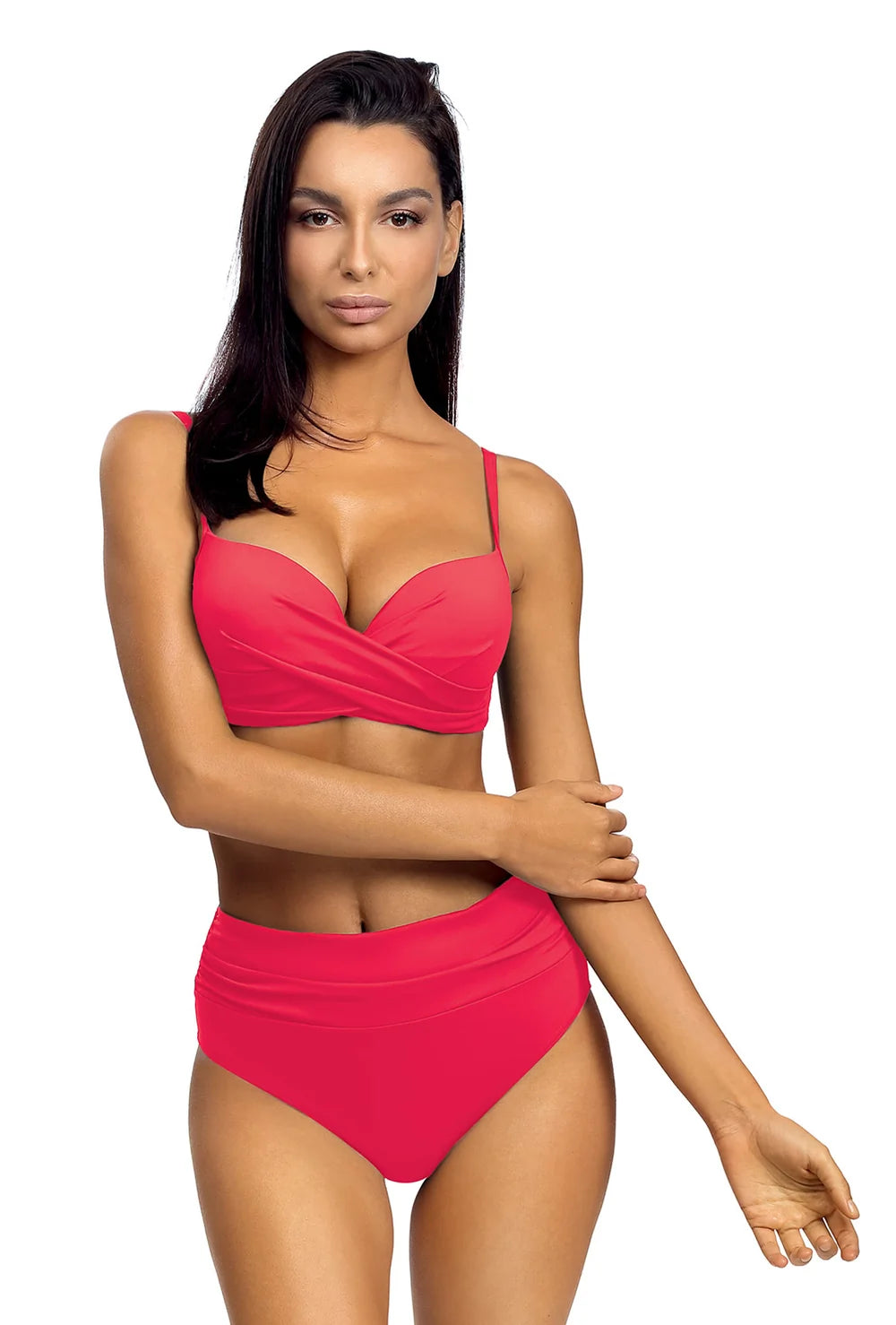 Mocnym atutem kostiumu Bayamon jest połączenie klasycznego kroju z wyrazistą barwą. Proste i minimalistyczne majtki bikini świetnie komponują się z biustonoszem, którego miseczki zwieńczono przekładanym na skos materiałem. Jest on usztywniany i wyposażony w fiszbiny, dzięki czemu idealnie podtrzymuje i modeluje biust. To fason odpowiedni na każdą kobiecą sylwetkę, dlatego też dostępny jest w szerokiej gamie rozmiarów i aż w trzech kolorach do wyboru: niebieskim, zielonym i różowym.