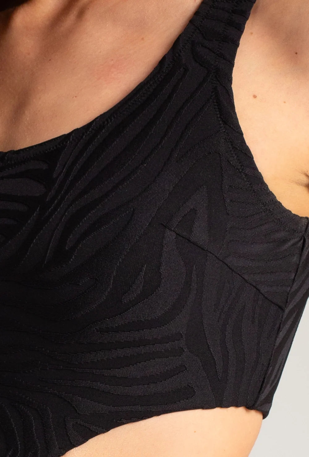 Kostium Heidi od razu zwraca na siebie uwagę i to pod wieloma względami. Po pierwsze: ma urzekający fason z asymetrycznym wycięciem na boku. Po drugie: jest czarny, ale też pokryty subtelnym wzorem przypominającym paski zebry. Paski te nie są jednak czarno-białe, ale utrzymane w dwóch odcieniach czerni. Po trzecie: kostium kąpielowy Heidi ma urzekająco ciekawe ramiączka. Jedno z nich jest szerokie, a drugie nieco węższe oraz wyposażone w złoty detal. Trudno przejść obojętnie obok tak fantazyjnego i efektownego stroju, który z pewnością wykorzystasz w wielu plażowych stylizacjach.
