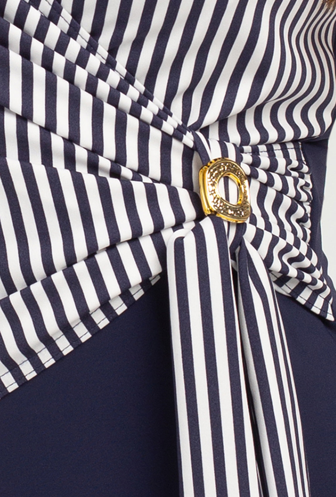 To model utrzymany w granatowej tonacji navy blue. W górnej części jego przód został wykonany z materiału w drobne, biało-granatowe paseczki- są one poprowadzone ukośnie względem sylwetki, dlatego optycznie ją wysmuklają. Na korzyść działa również kopertowy krój wraz z dekoracyjnym wiązaniem z boku, które dodatkowo zaakcentowano złotym detalem. Poniżej talii kostium przechodzi w granat i w tym kolorze wykonany jest również jego tył. Takie połączenie materiałów i kolorów nadaje mu marynistyczny charakter i jest niezwykle korzystne dla pełnej sylwetki.