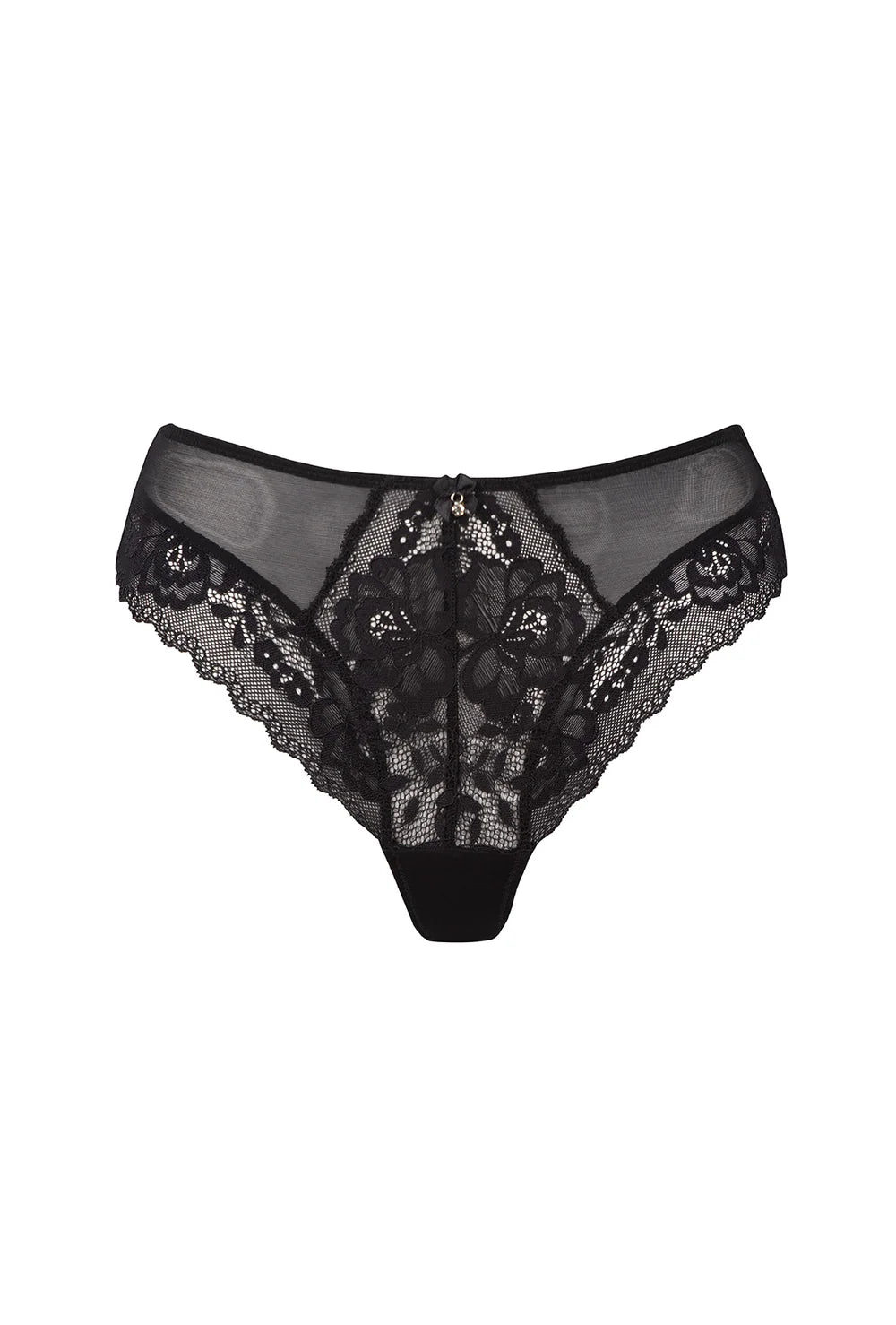 - Majtki Ally zachwycają elegancką czarną koronką z kwiatowym motywem połączoną z delikatną siateczką.