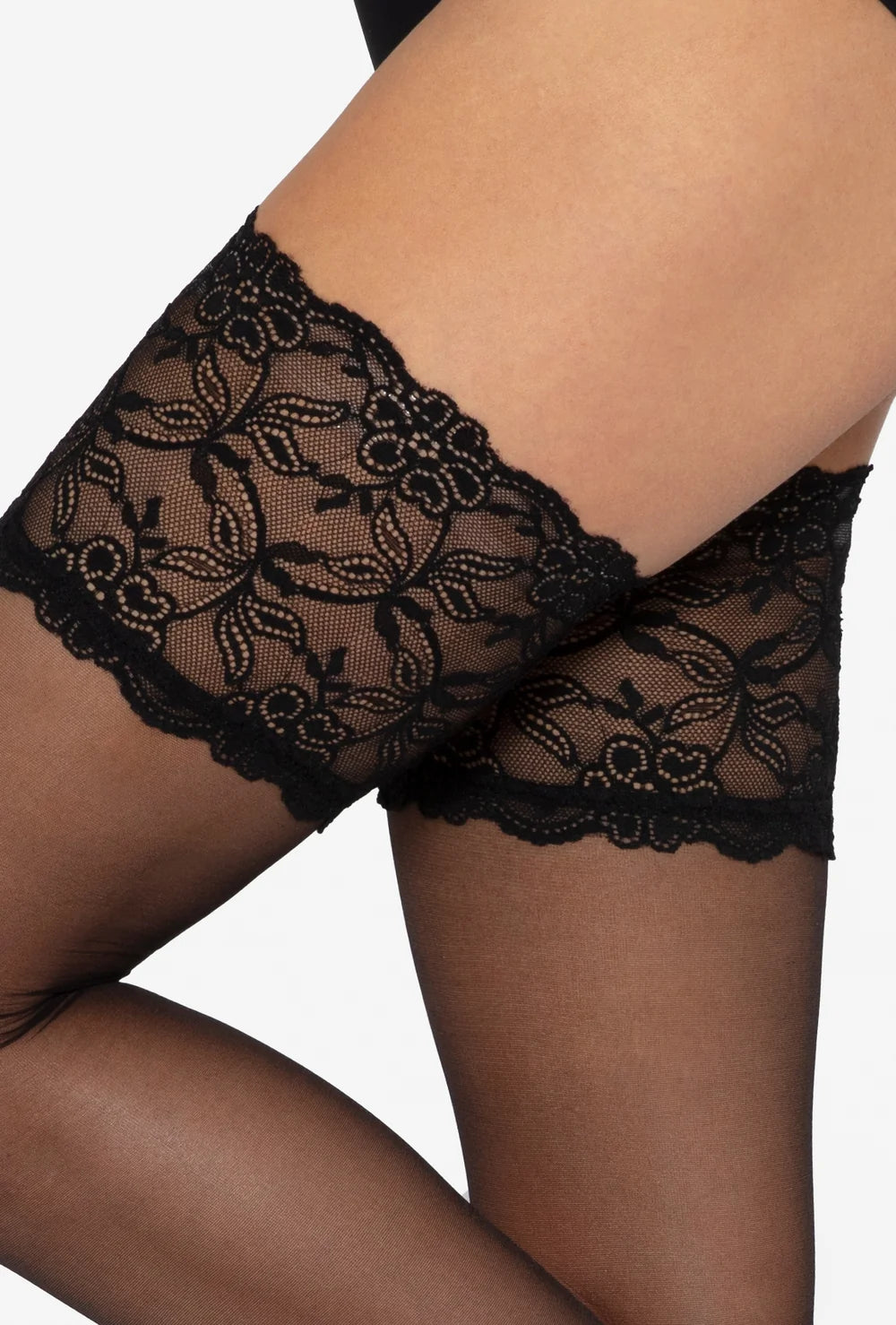 - Możesz cieszyć się trwałym utrzymaniem i pewnością siebie przy każdym kroku, dzięki zastosowaniu w górnej części pończoch praktycznych, silikonowych pasków. Samonośne pończochy, estetycznie wykończone, zapewniają odpowiednie napięcie materiału, a tym samym doskonałą prezentację.