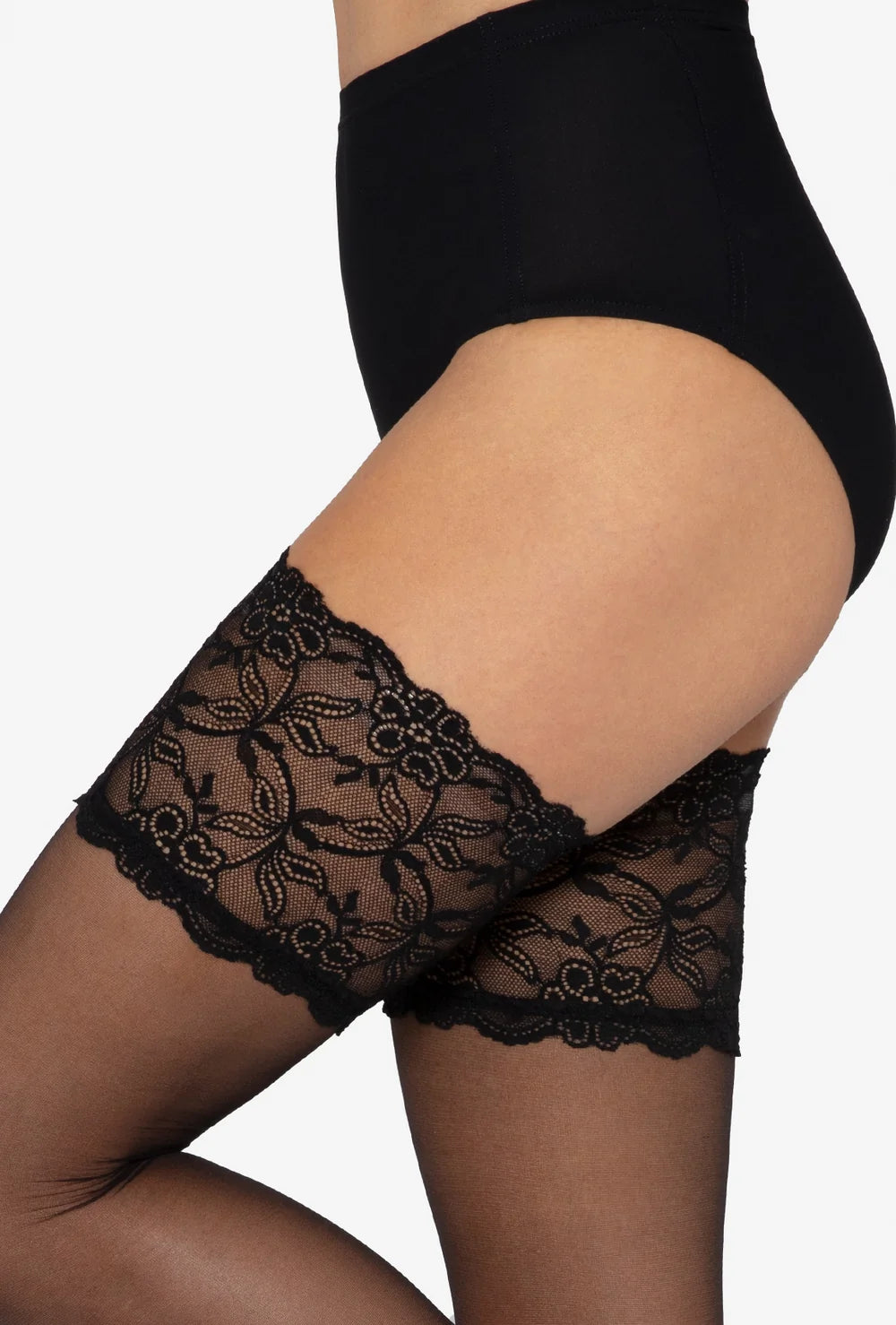 - Ażurowy wzór, zmysłowej koronki pięknie eksponuje nogę, przylega idealnie bez zbędnego ucisku. Tradycyjny i prosty krój przełamany sensualnym kwiatowym motywem stanowi model idealny dla każdej kobiety.