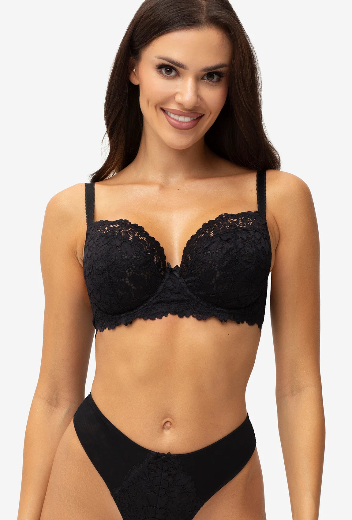 Koronkowy biustonosz Daisy w czarnym kolorze to połączenie lekkości, elegancji i wygody. Miękkie miseczki typu soft, subtelna koronka i klasyczny design sprawiają, że jest to model idealny dla kobiet ceniących naturalny komfort i ponadczasowy styl.