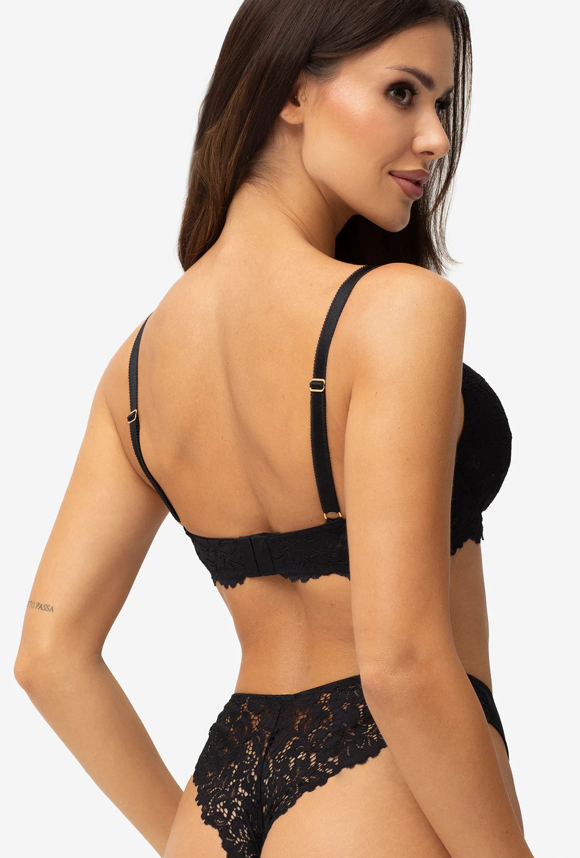 Czarny biustonosz Daisy to propozycja dla kobiet, które cenią subtelną kobiecość i wygodę w eleganckim wydaniu. Delikatna koronka o kwiatowym wzorze nadaje modelowi zmysłowy charakter, a klasyczna czerń sprawia, że biustonosz prezentuje się ponadczasowo i stylowo – zarówno na co dzień, jak i na specjalne okazje.
