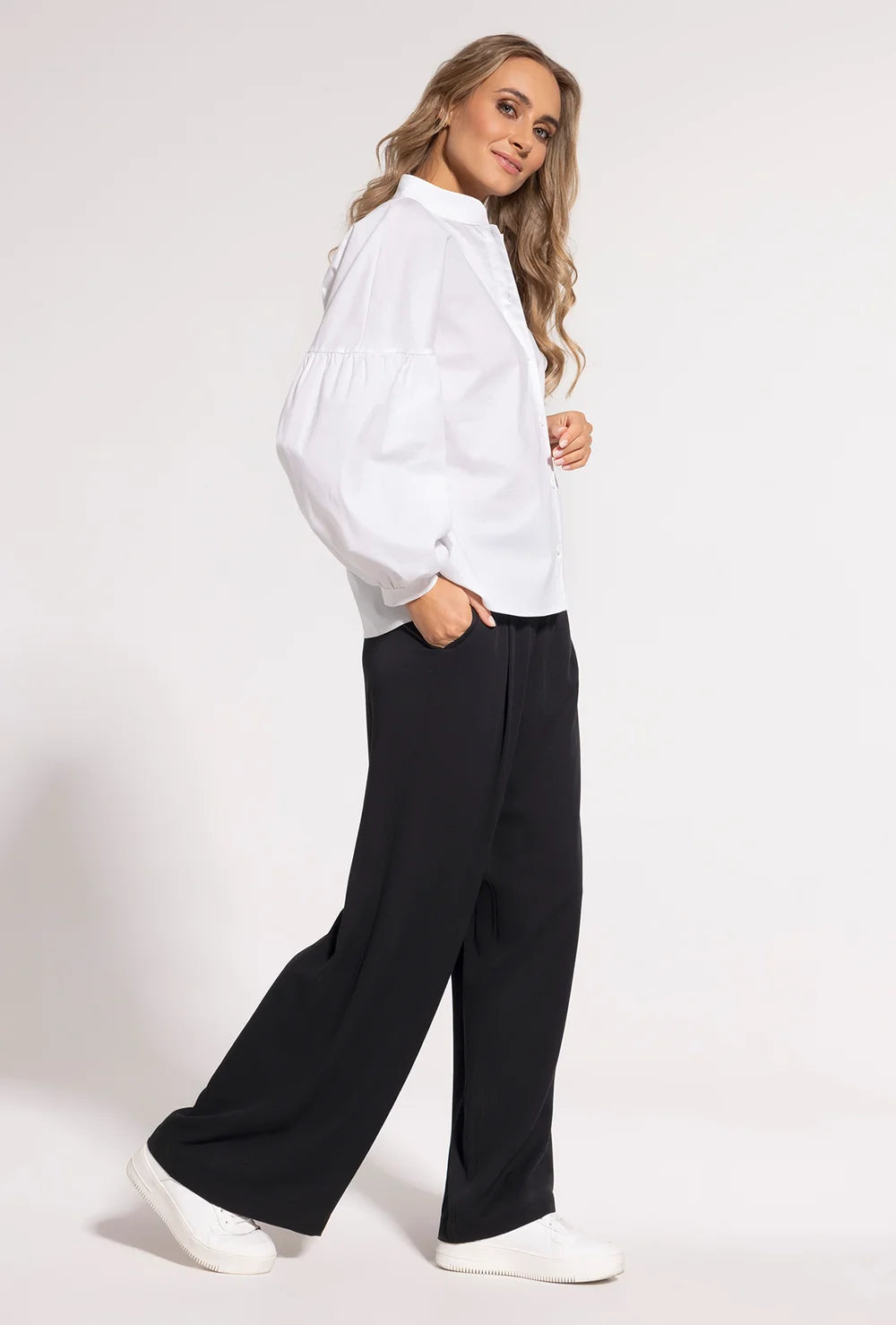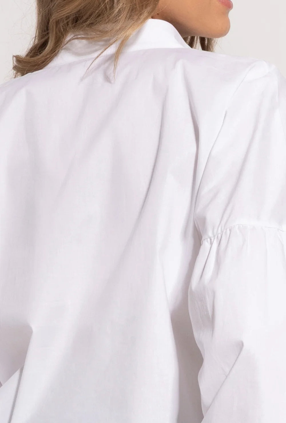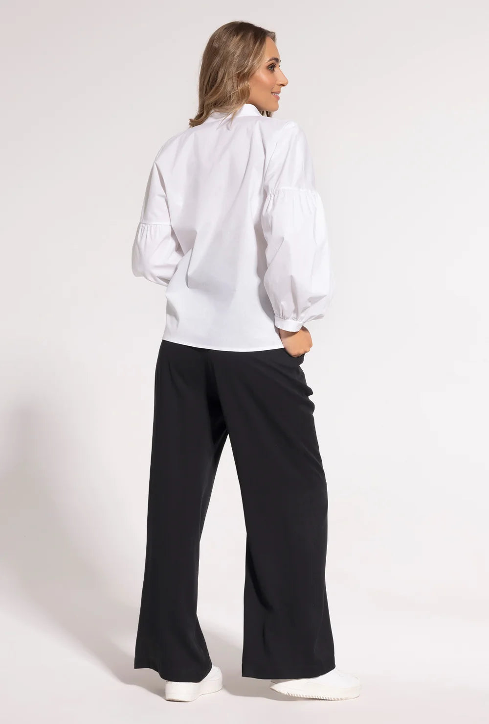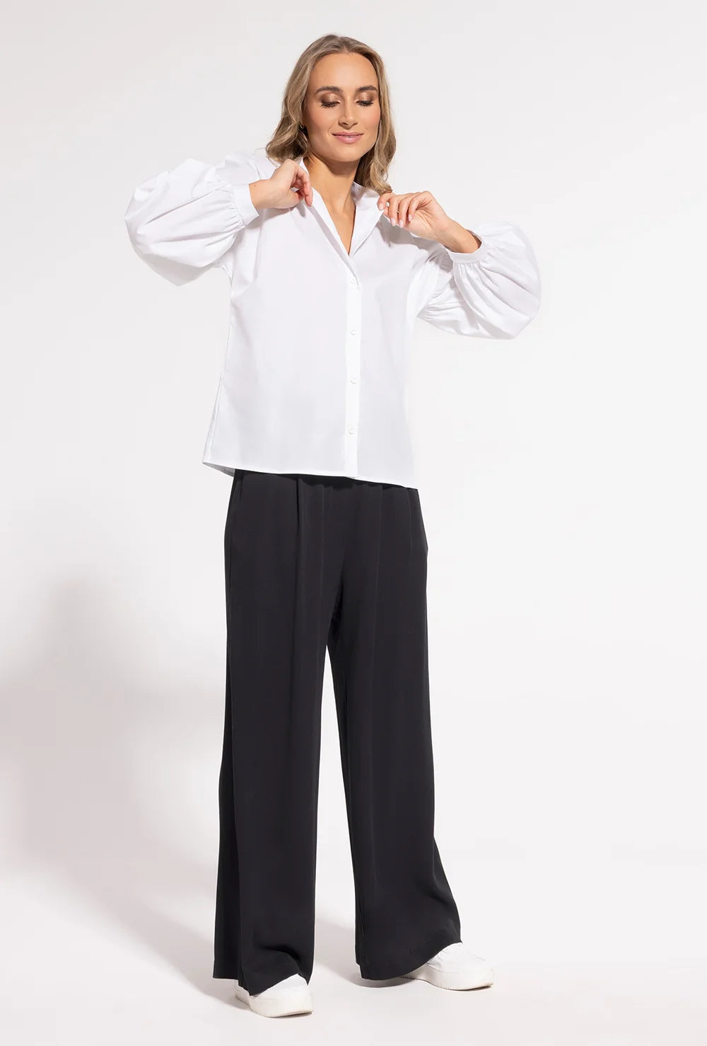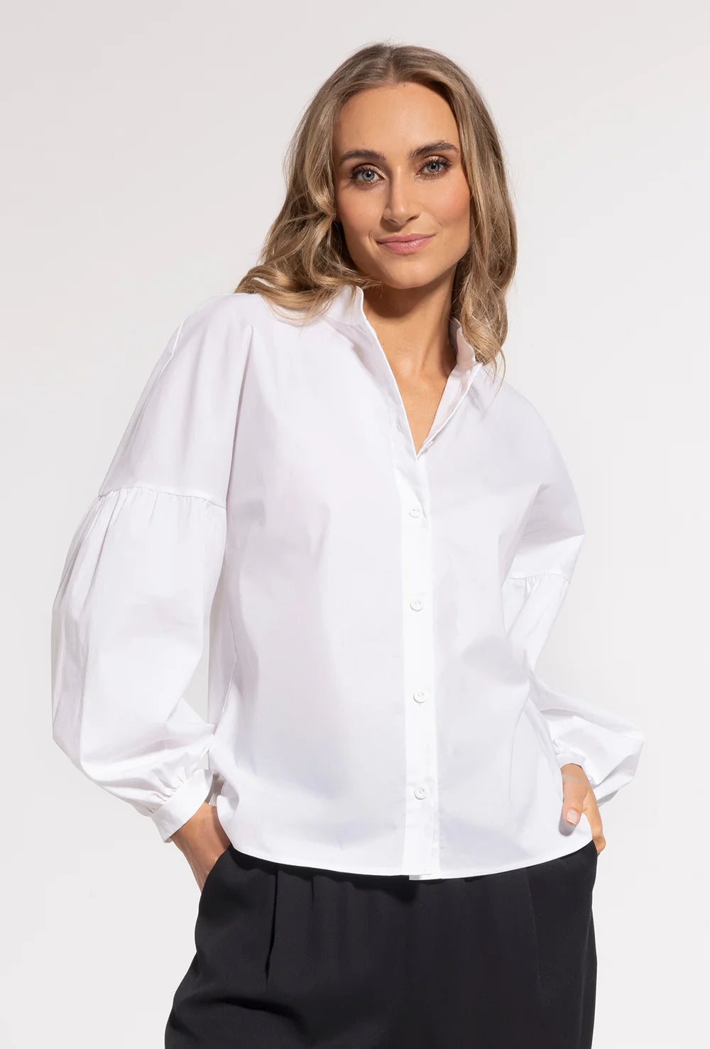Przewiewna koszula damska z bawełny o swobodnym fasonie, który łączy dopracowany styl i wygodę noszenia. Idealna na każdą porę roku, a w szczególności na okres wiosenno-letni. To model z szerokimi rękawami o obniżonej linii ramion, zapinany na guziki i wyposażony w stójkę. Rękawy są starannie drapowane i wykończone mankietem, który lekko je bufuje. Koszula Karen nie poszerza sylwetki w ramionach, a poprzez swój krój może delikatnie zamaskować obwód talii. To przemyślany fason dla kobiet ceniących ponadczasową elegancję z nowoczesnym twistem.