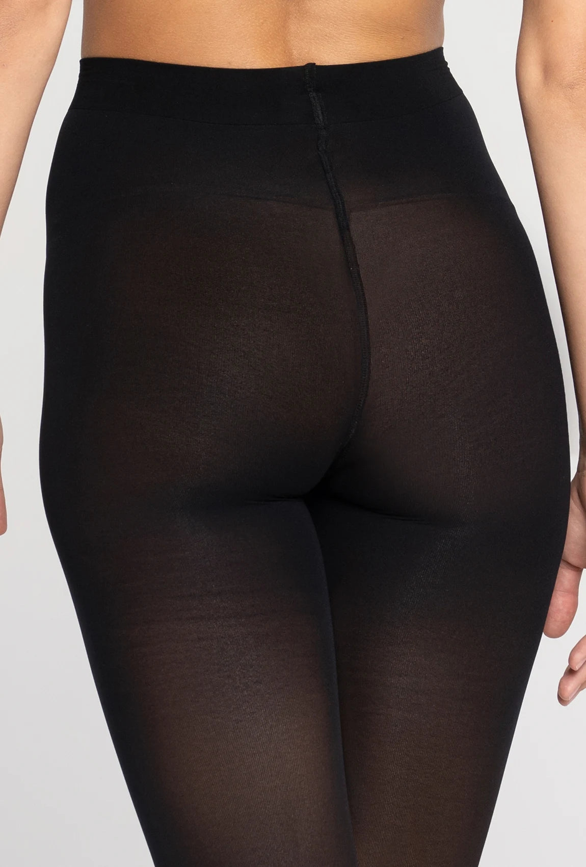 Matowa czerń nie odbija światła tak, jak rajstopy z połyskiem, dzięki czemu może dawać wrażenie optycznego wysmuklenia. Jest to jednak subtelny efekt.