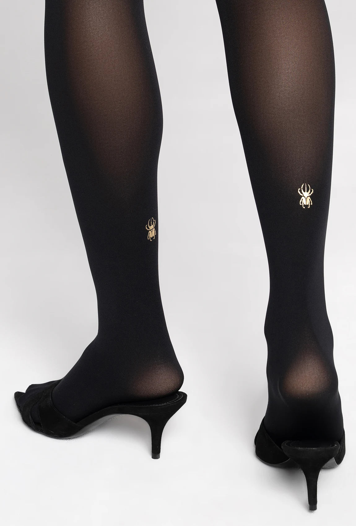 Czasami piękno tkwi w szczegółach – tak jest w przypadku kryjących rajstop Scarab ze złotym skarabeuszem. Ten ozdobny element został ulokowany z tyłu, w dolnej części łydek, dzięki czemu dostrzegają go jedynie spostrzegawcze osoby, które również lubią zwracać uwagę na dopracowane detale. Pomimo złotego akcentu rajstopy te są w pełni uniwersalne i ponadczasowe – doskonałe do wielu stylizacji na nieco chłodniejsze dni.