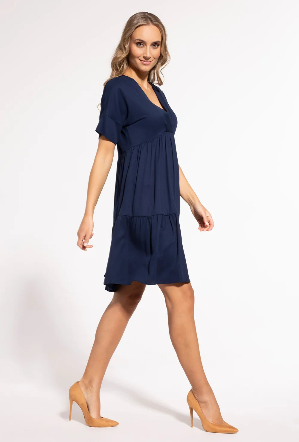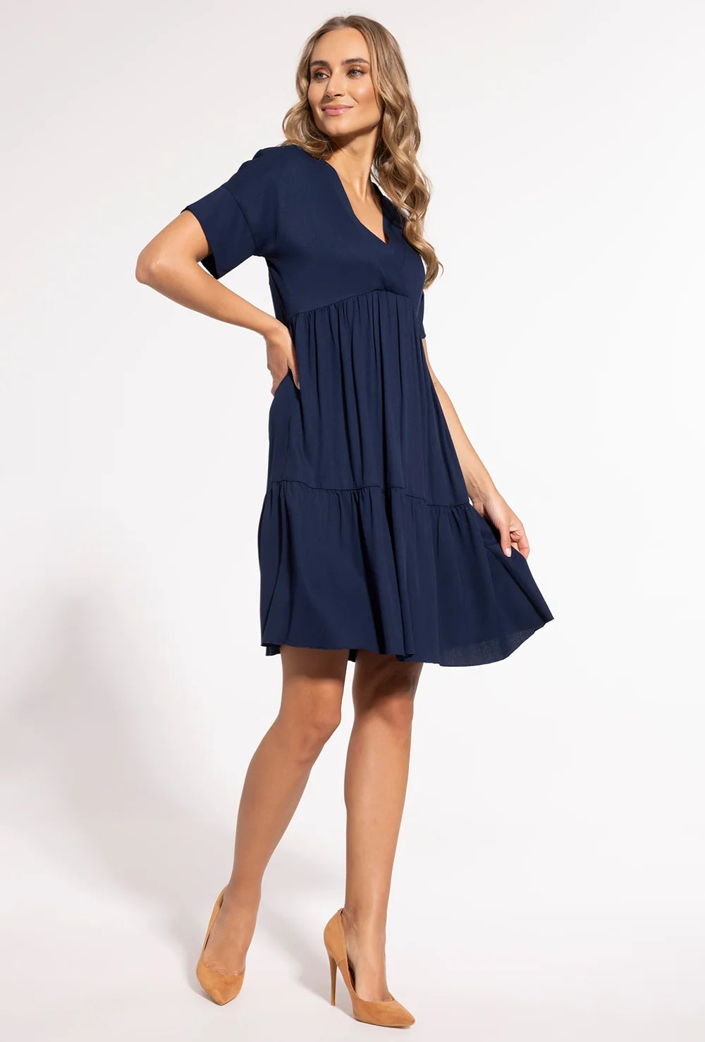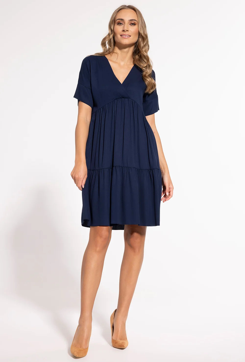 W Twojej garderobie nadal brakuje sukienki, która będzie niezastąpiona podczas ciepłych i słonecznych dni? Co powiesz na luźną sukienkę z krótkim rękawem Kim? Ten model to absolutna nowość w linii ubrań marki Gatta na wiosnę i lato 2025. Sukienka posiada dekolt V, odcięcie pod biustem oraz zwiewną dolną część o długości do kolan. Dużą zaletą naszej zwiewnej sukienki jest to, że zarówno panie o klasycznej sylwetce, jak i kobiety w ciąży będą wyglądać w niej pięknie. W sklepie online Gatta znajdziesz ją w kolorze granatowym i fuksji. Sprawdź!