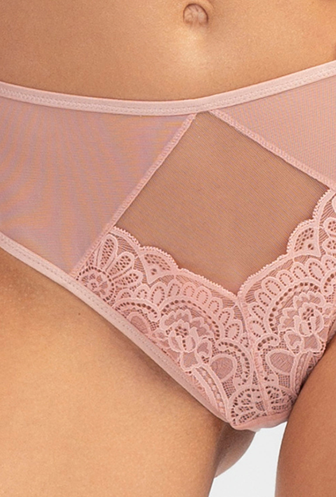 Przód majtek optycznie wysmukla sylwetkę, a wszystko to za sprawą przemyślanego połączenia materiałów i kształtów. Transparentny panel na środku bielizny oraz koronka ułożona w kształt litery V dodają sylwetce smukłości. Tył bielizny czaruje koronkową krawędzią, która delikatnie odsłania pośladki, akcentując ich naturalny kształt.