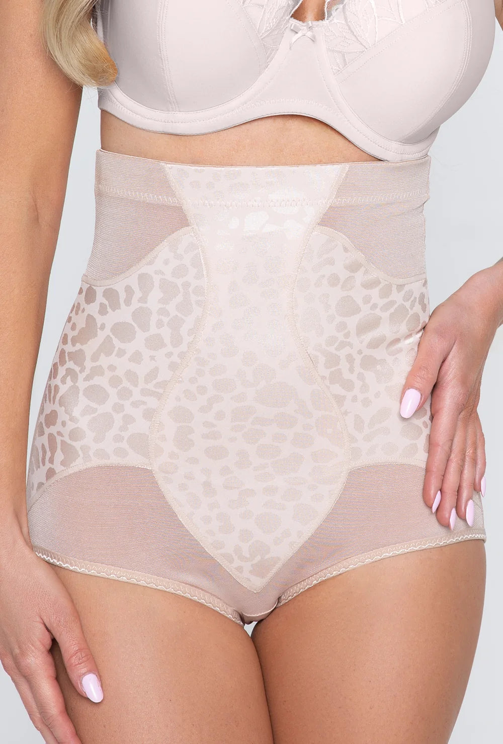 - Majtki z podwyższonym stanem w niczym nie przypominają babcinej bielizny! Subtelna kolorystyka w beżowym odcieniu oraz ozdobny nadruk w zwierzęce cętki sprawią, że poczujesz się seksownie i pięknie.