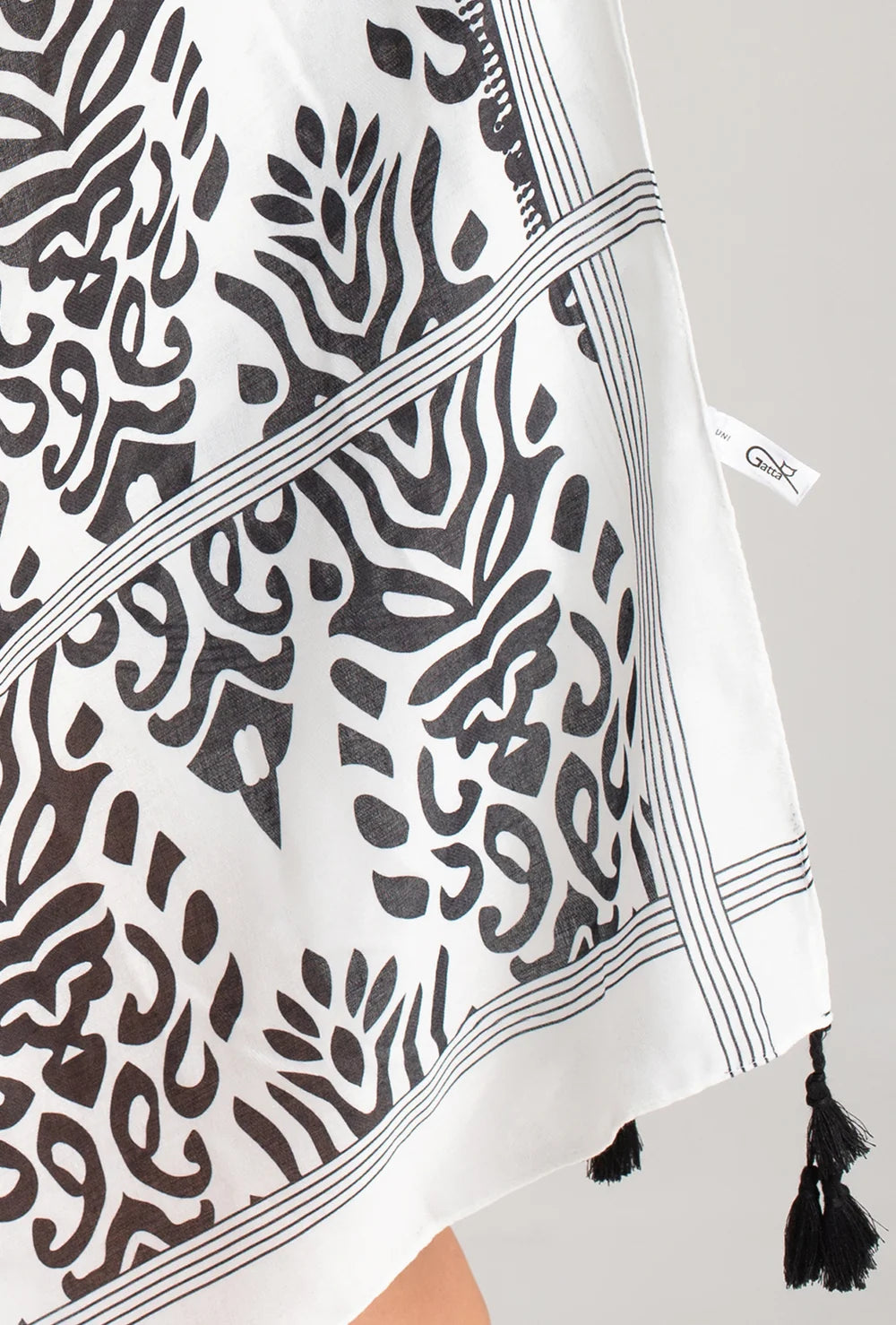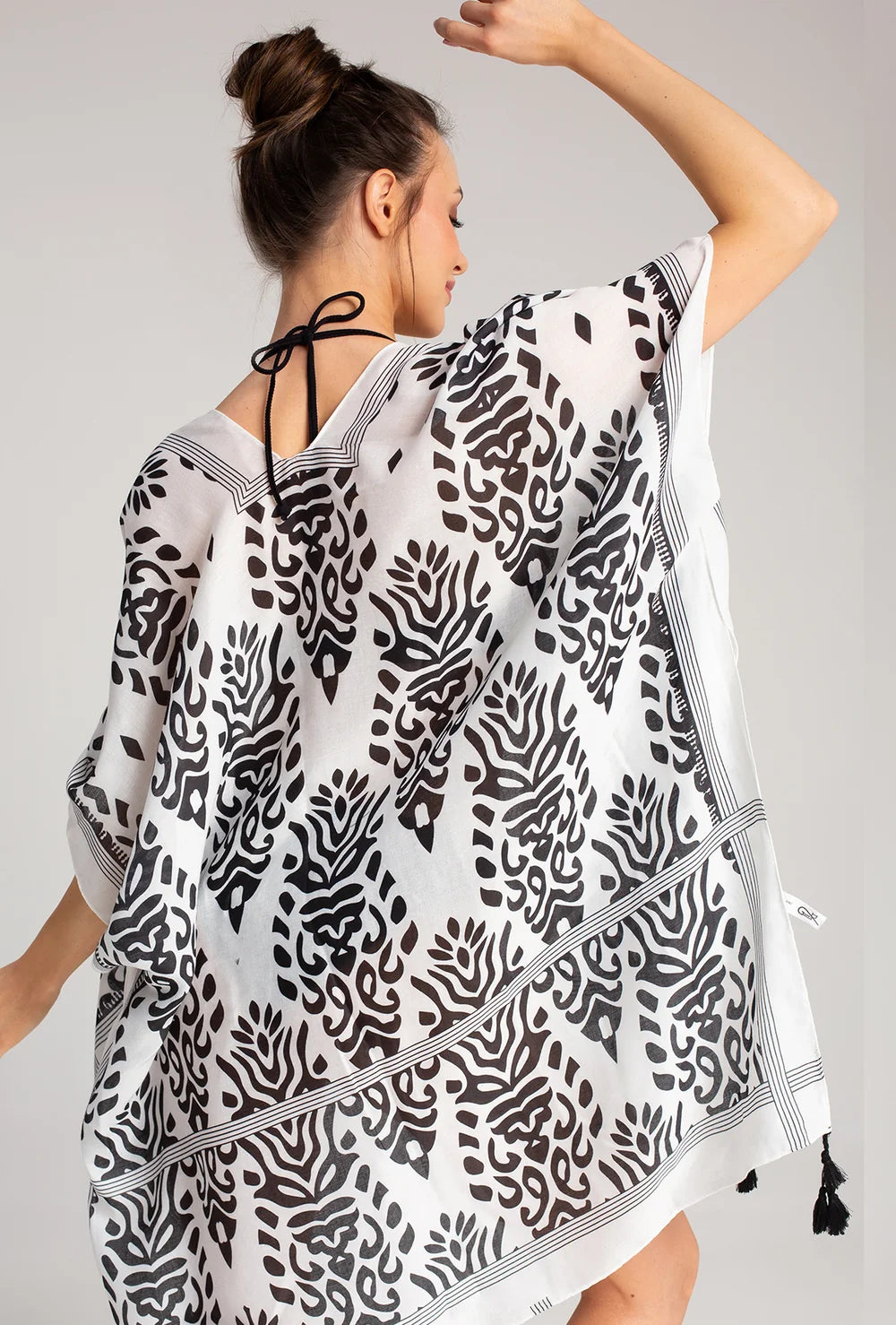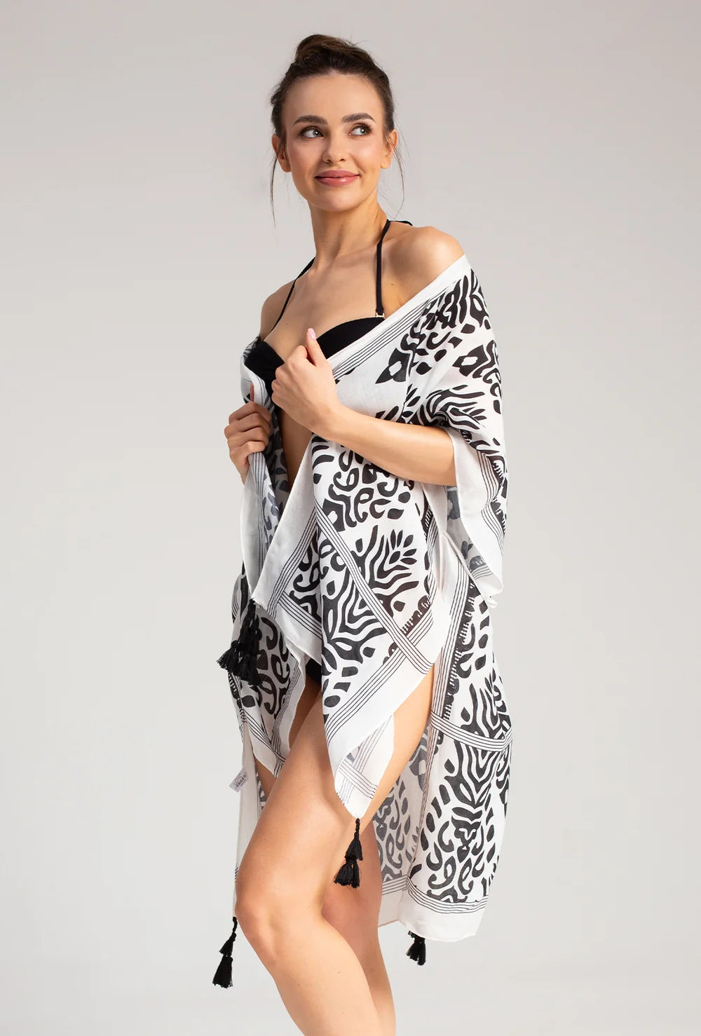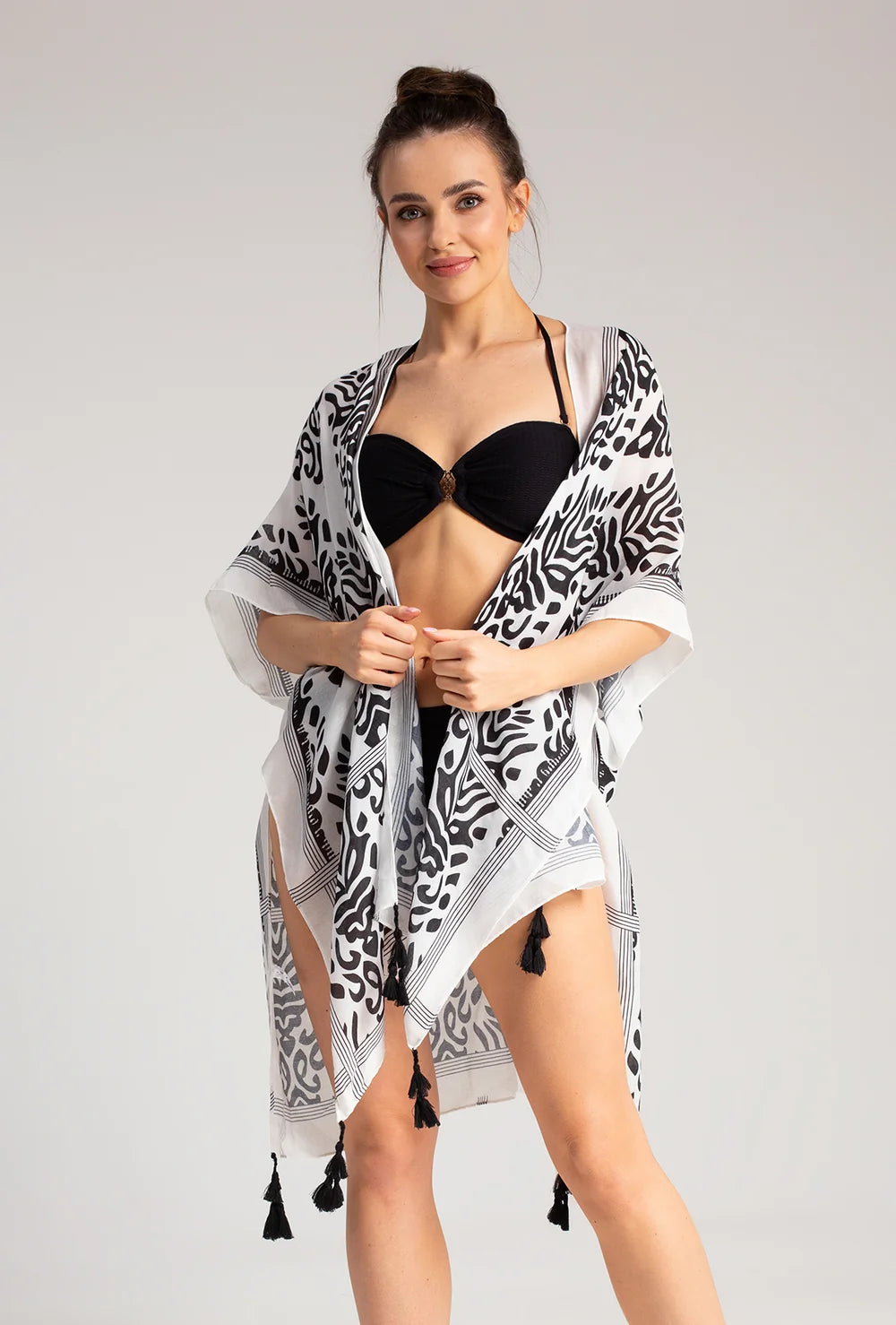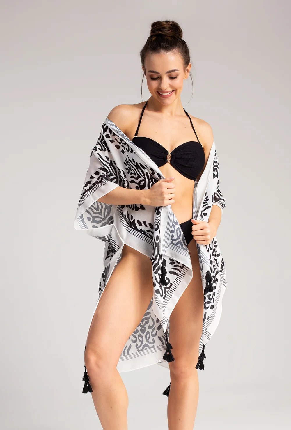 Czarno-biała narzutka plażowa Maddie doskonale sprawdzi się w wakacyjnej garderobie. Wykorzystasz ją w typowo plażowych stylizacjach, jak również wówczas, gdy będziesz potrzebowała czegoś, czym można okryć ramiona podczas spaceru. Pareo Maddie pasuje bowiem nie tylko do kostiumów kąpielowych, ale też do minimalistycznych sukienek i bluzek na ramiączkach.