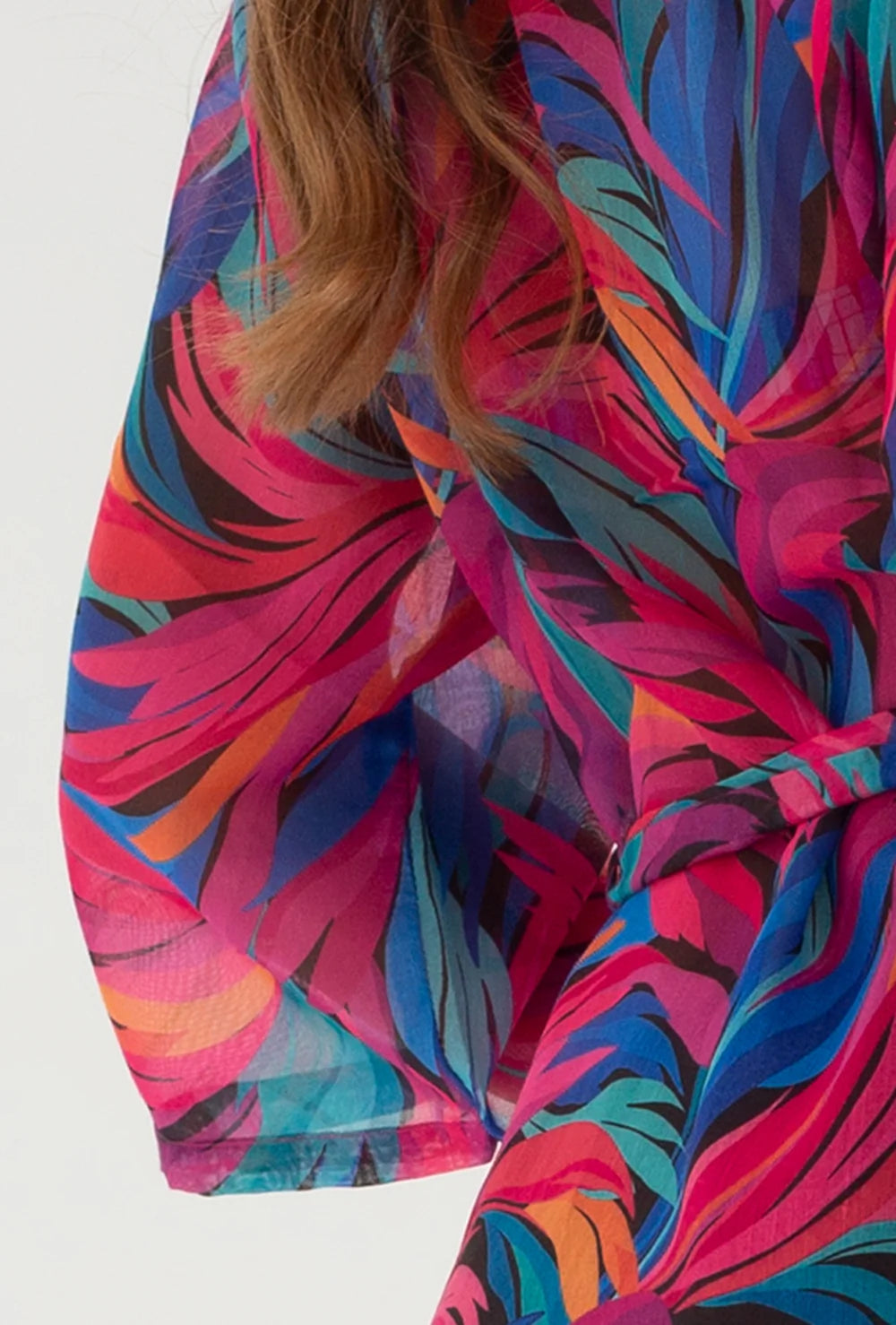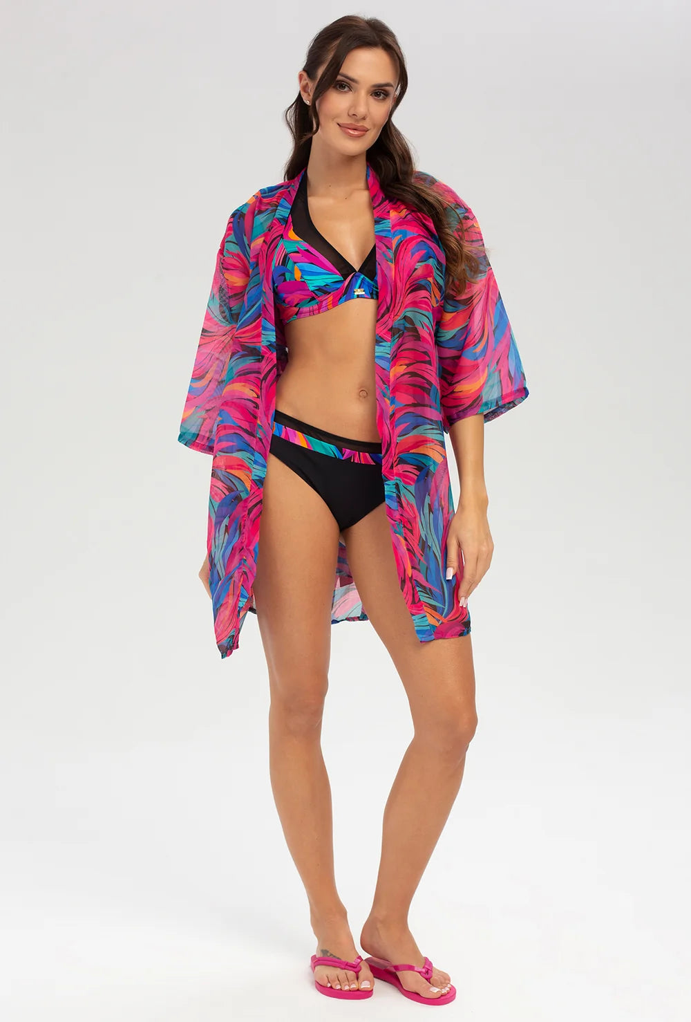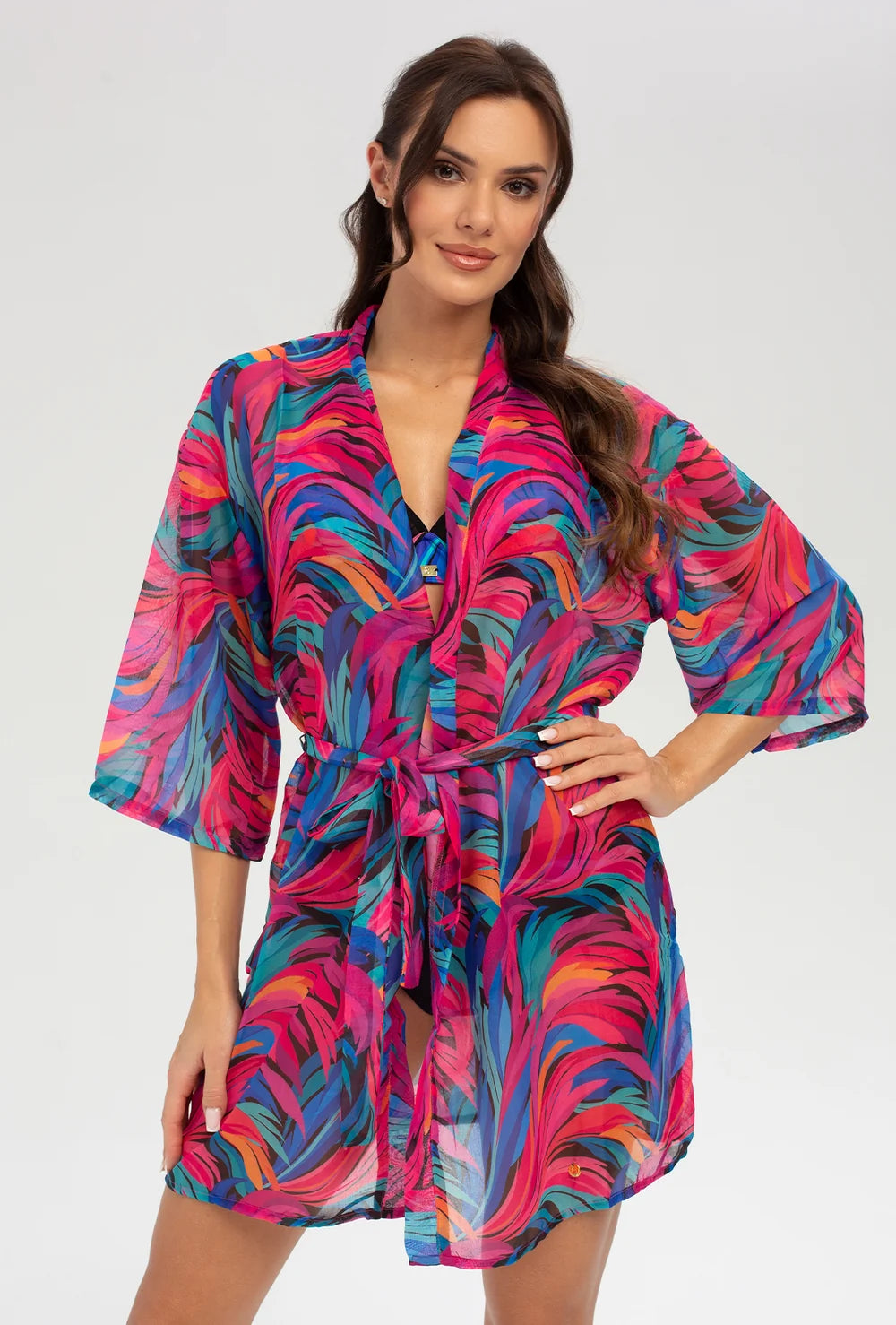 Narzutka plażowa Marmaris od razu wpada w oko, a wszystko to za sprawą jej wyjątkowej kolorystyki. Zestawienie różu, pomarańczy, turkusu i niebieskiego na lekko transparentnym materiale zapewniło zjawiskowy efekt.