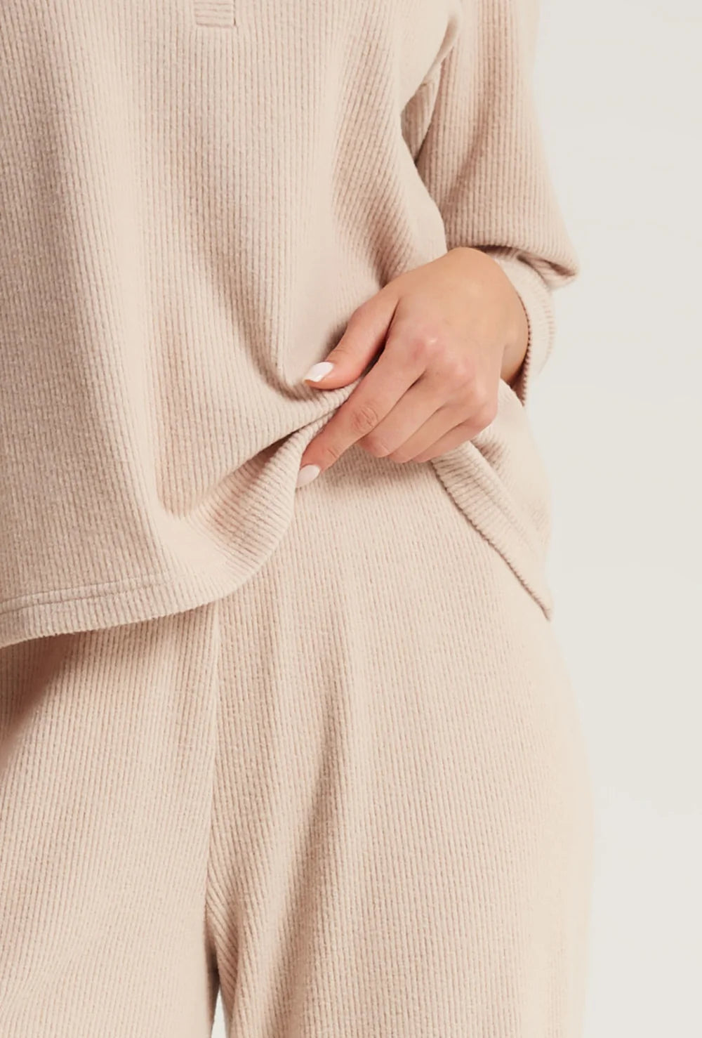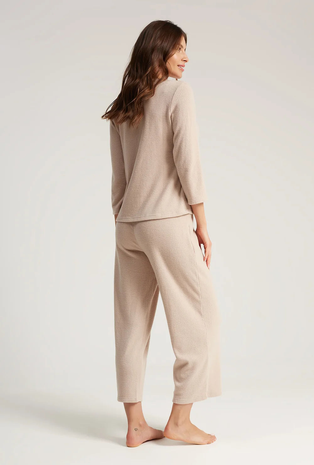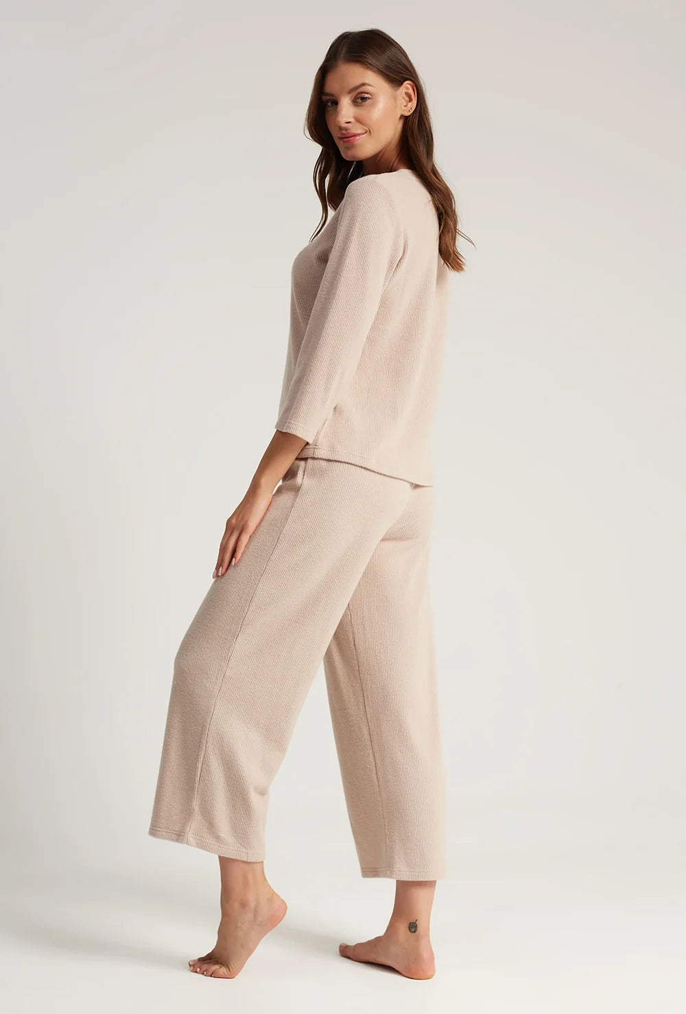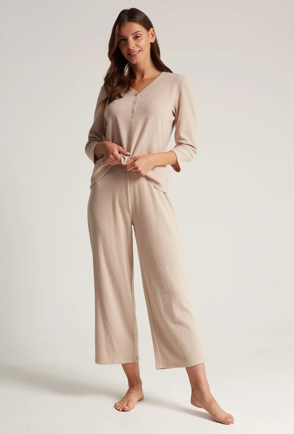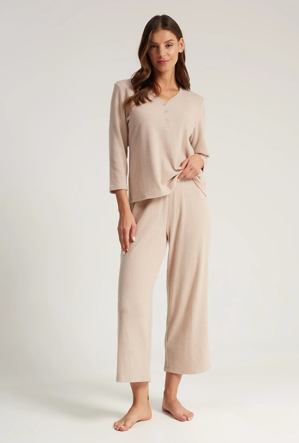 Piżama damska Maria ma swobodny krój: szerokie nogawki oraz dłuższe rękawy. Prążkowany materiał został wykonany z poliestru, wiskozy i elastanu - jest przyjemny w dotyku i ciepły.