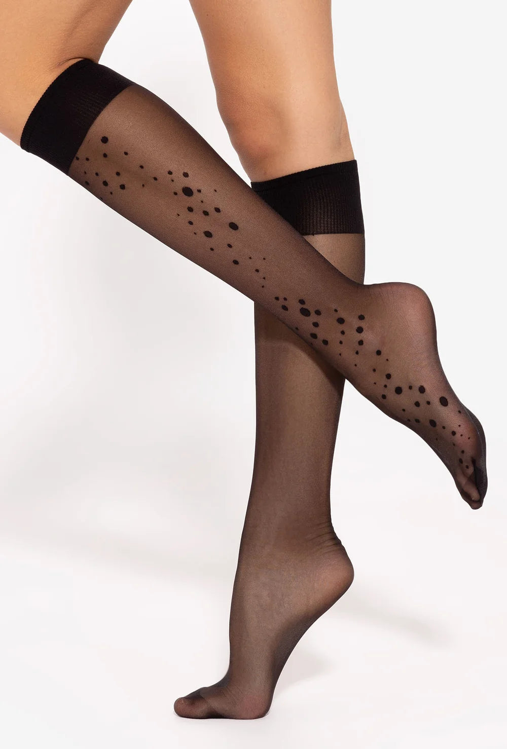 W nowej kolekcji Gatta nie mogło zabraknąć stylowych i praktycznych podkolanówek damskich. To nieodłączny element wielu damskich stylizacji. Odpowiednio dobrane podkolanówki sprawdzają się bowiem niemal o każdej porze roku. Wzór 13 w urocze kropeczki będzie idealny na wiosnę - od razu kojarzy się z lekkimi stylizacjami na nieco cieplejsze dni.