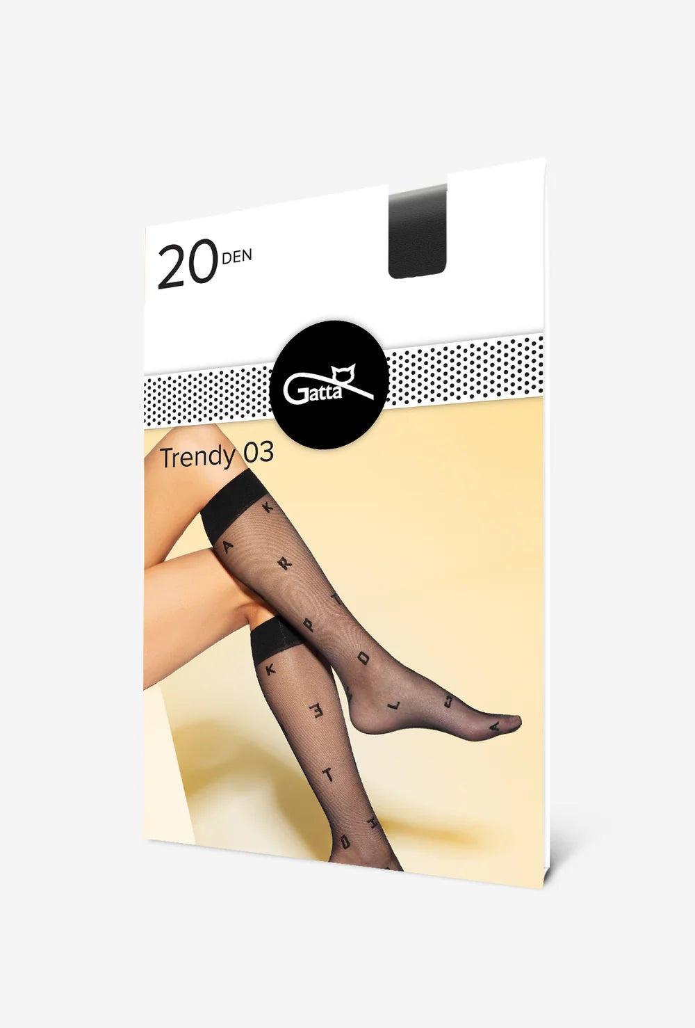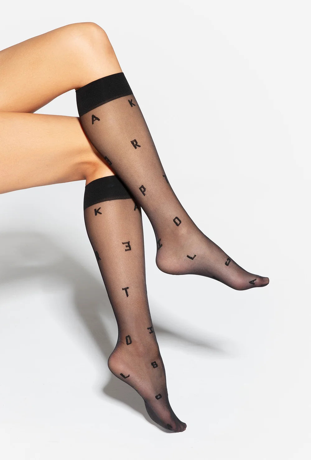 - Wybierając podkolanówki w niebanalny wzór, który wygląda jak rozsypany alfabet, dodatkowo zyskasz wyjątkowy efekt w swojej stylizacji.