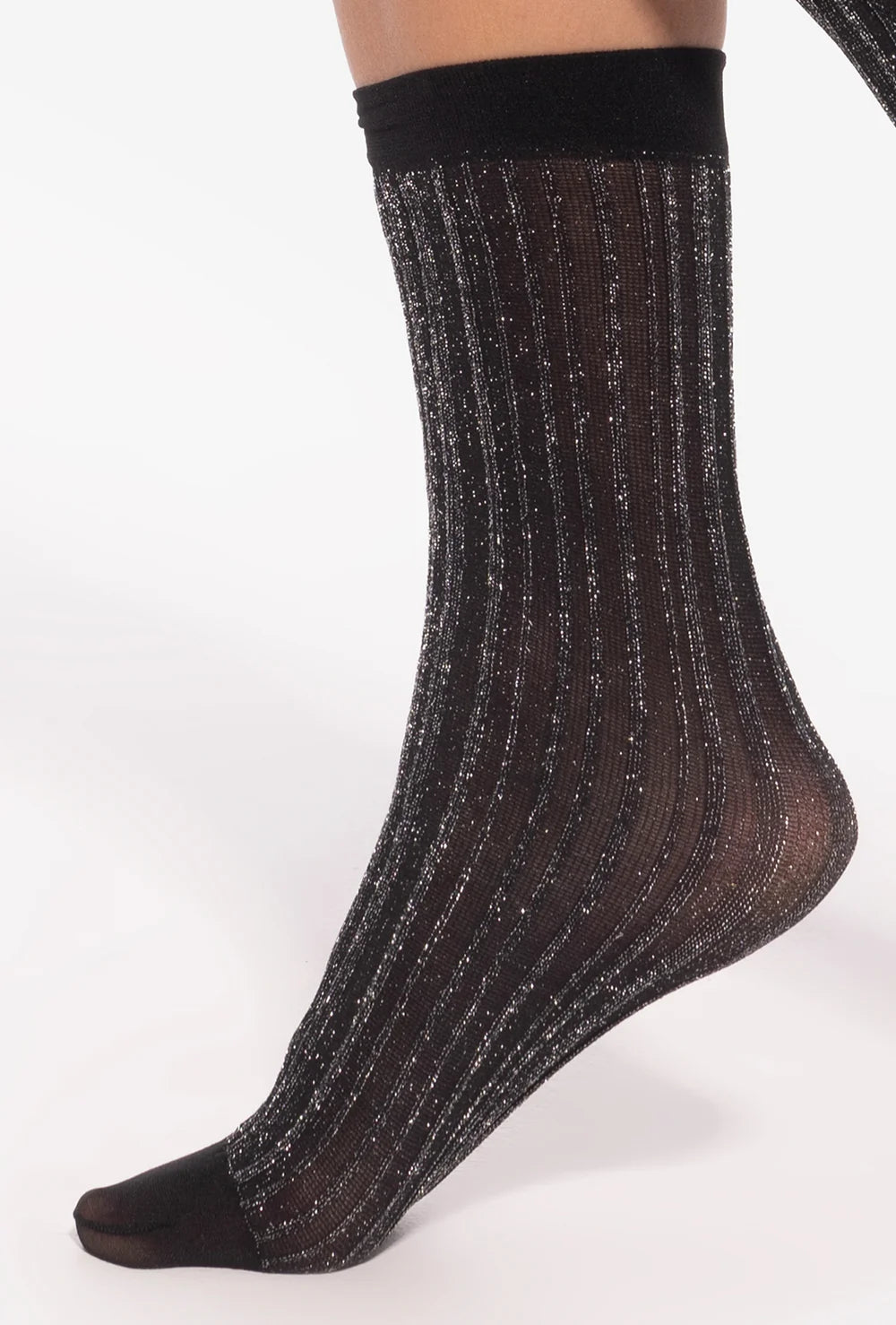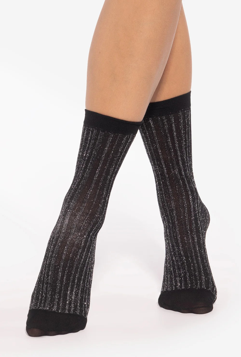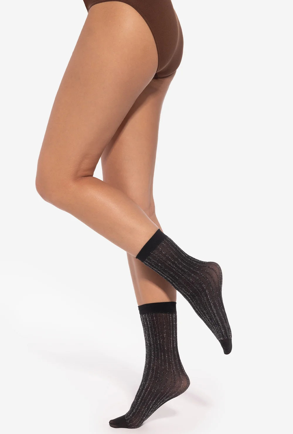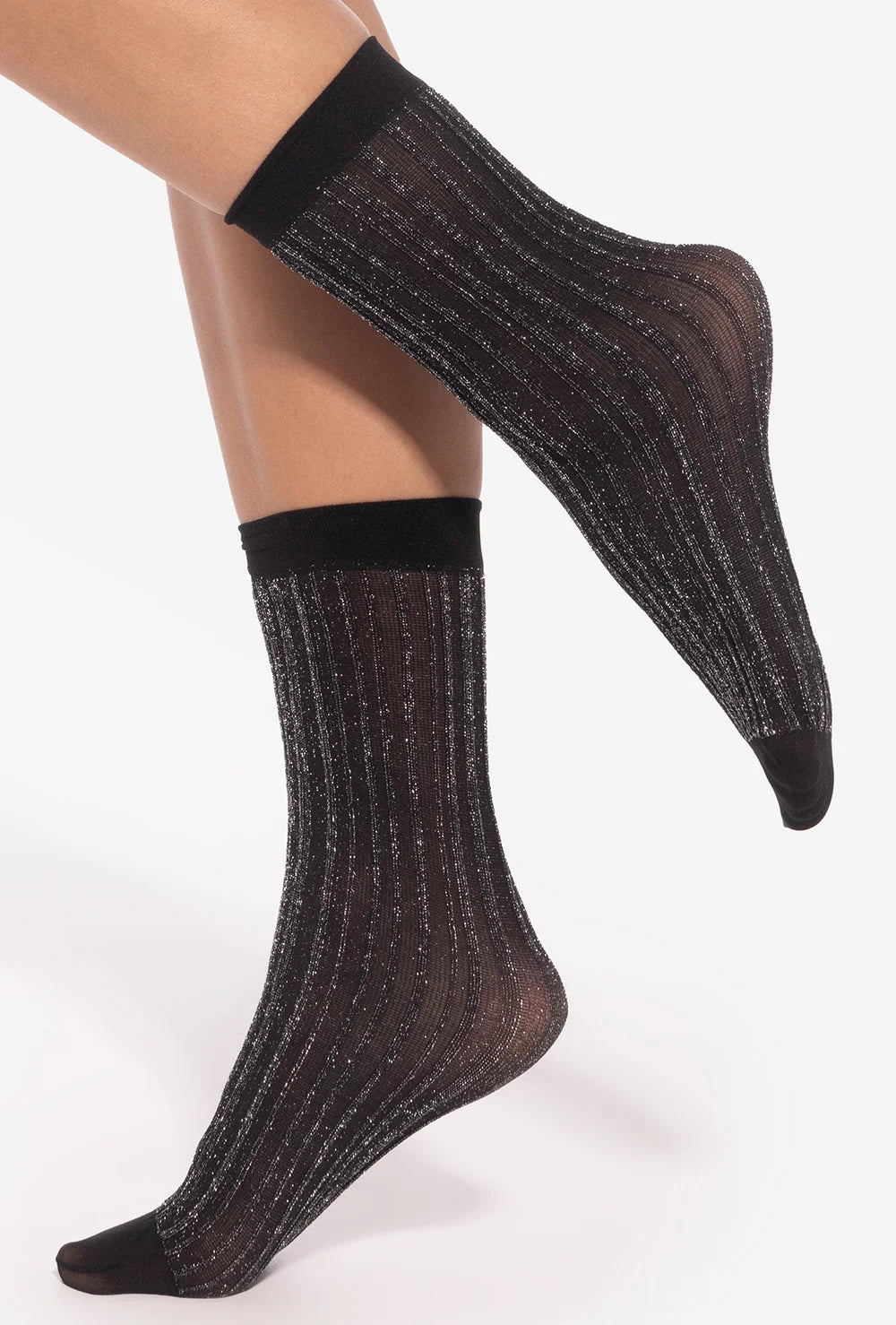Czasami to właśnie najdrobniejsze elementy ubioru wpływają na jego ostateczny charakter. Taką moc mają połyskujące skarpetki z lurexem z oferty Gatta, które od razu wpadają w oko i nadają ton każdej stylizacji. Ich czarną powierzchnię urozmaicono pionowymi dekorami w srebrzystym odcieniu.
