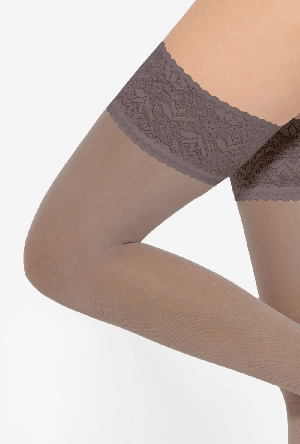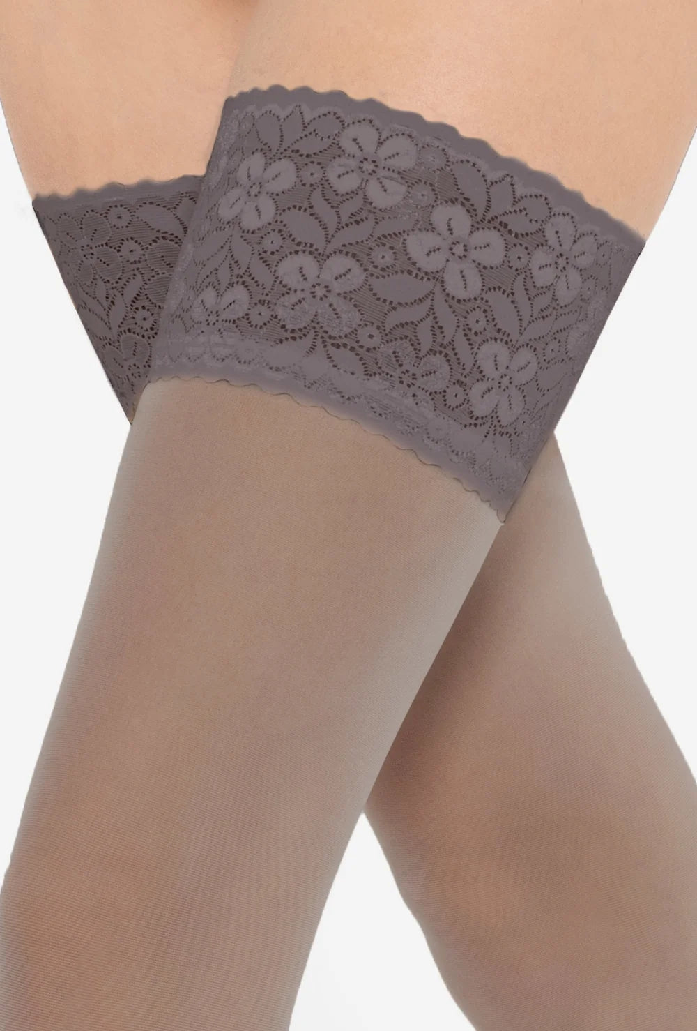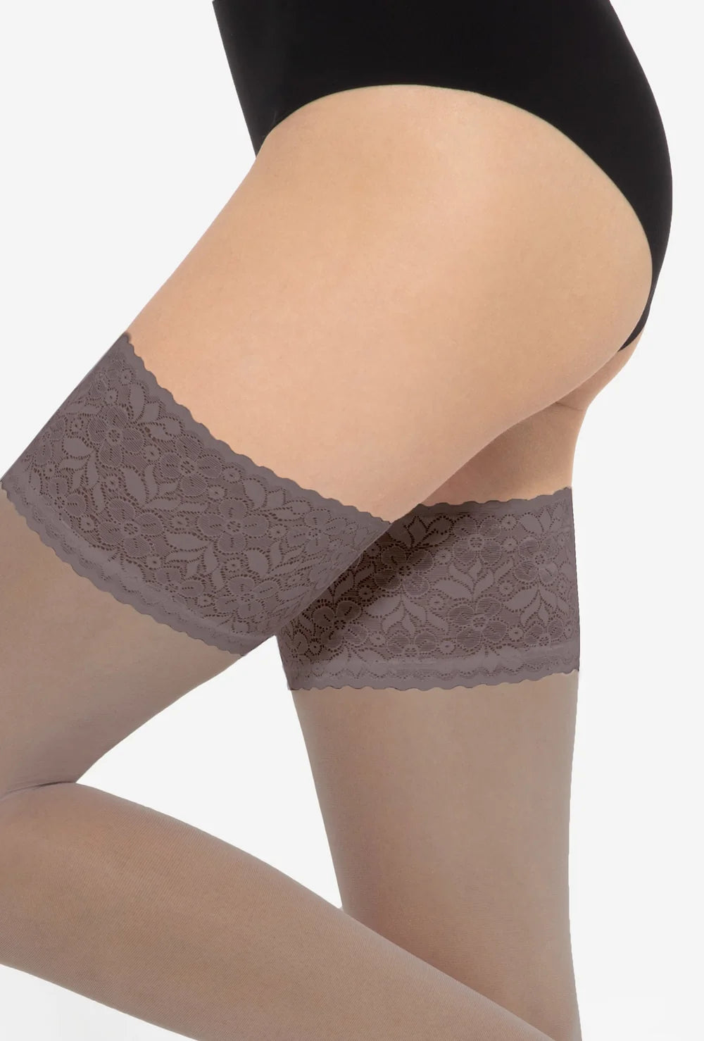 - Model pończoch samonośnych charakteryzuje duża różnorodność kolorystyczna - od krystalicznie białego Bianco, poprzez przydymione Panna, cieliste Beige i Diano, soczysty Golden, aż po głęboki brąz Lyonu, surowy Grafit i aksamitnie czarny Nero. To prawdziwy festiwal barw idealny dla każdej karnacji. Brak zaznaczonej części palcowej sprawia, że z łatwością dobierzesz każde, nawet otwarte obuwie.