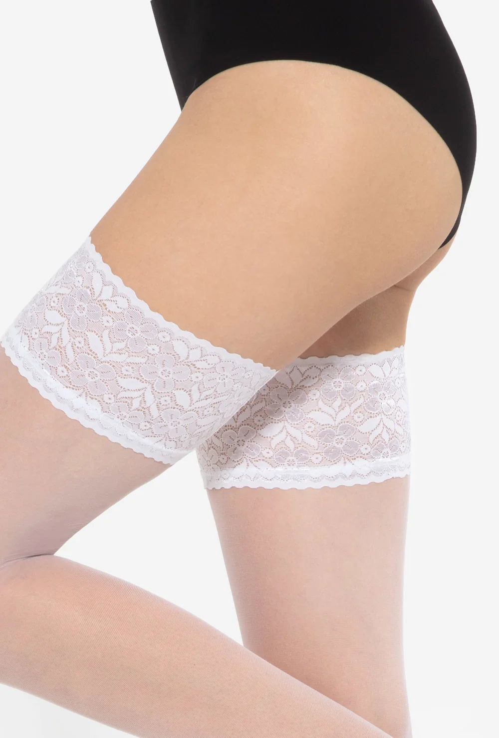 - Praktyczne i delikatne, silikonowe paski stanowią gwarancję niezawodności pończoch samonośnych. Bardzo dobrze przylegają do ciała. Dzięki ich zastosowaniu materiał nie zsuwa się, ani nie marszczy. Silikonowe paski zostały zamaskowane szerokim paskiem dekoracyjnym - ze zmysłowej koronki.