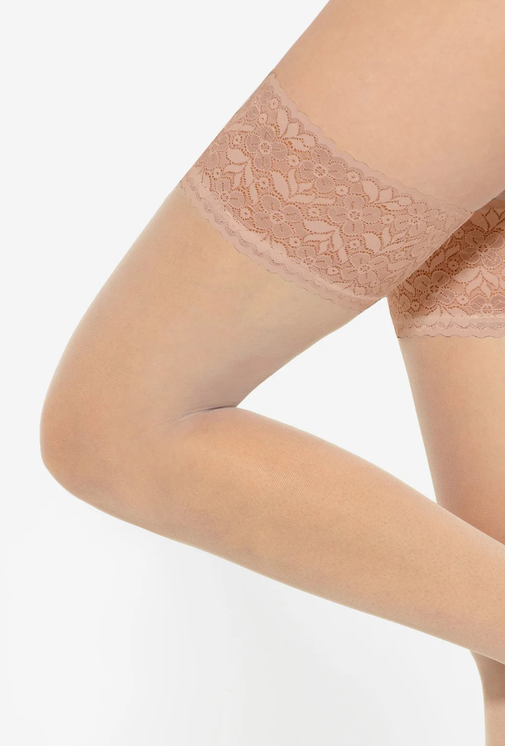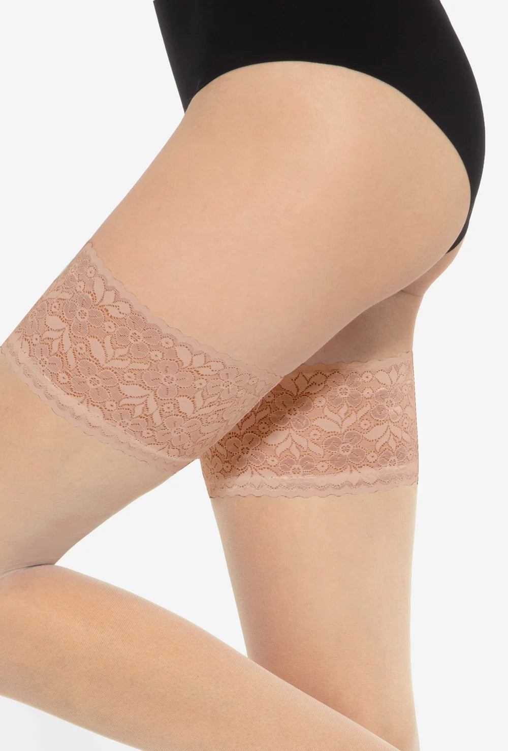 - Praktyczne i delikatne, silikonowe paski stanowią gwarancję niezawodności pończoch samonośnych. Bardzo dobrze przylegają do ciała. Dzięki ich zastosowaniu materiał nie zsuwa się, ani nie marszczy. Silikonowe paski zostały zamaskowane szerokim paskiem dekoracyjnym - ze zmysłowej koronki.