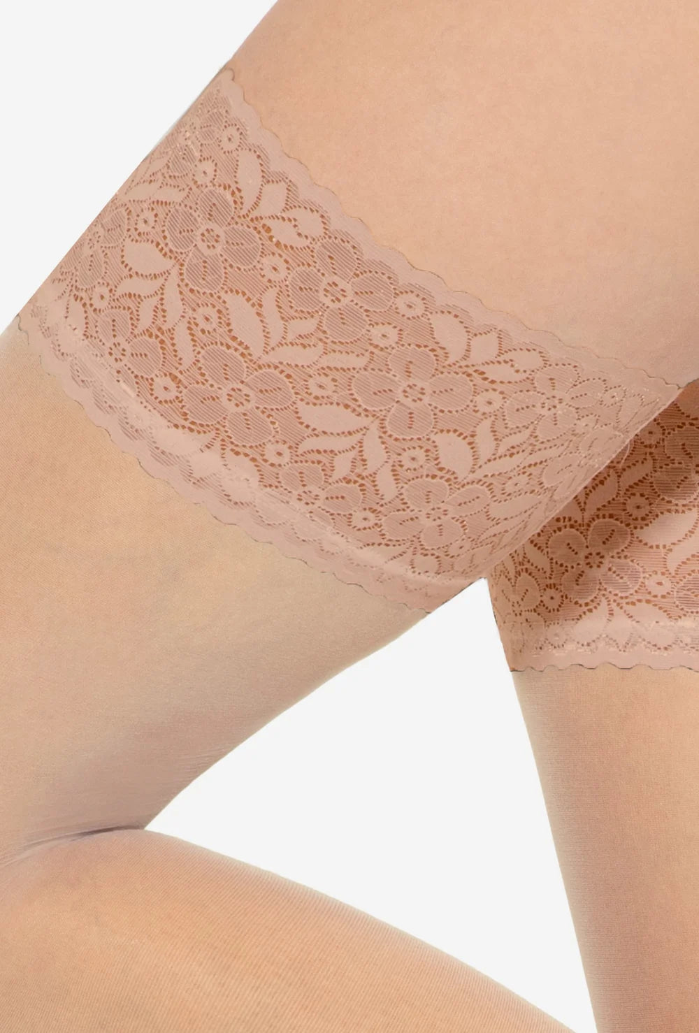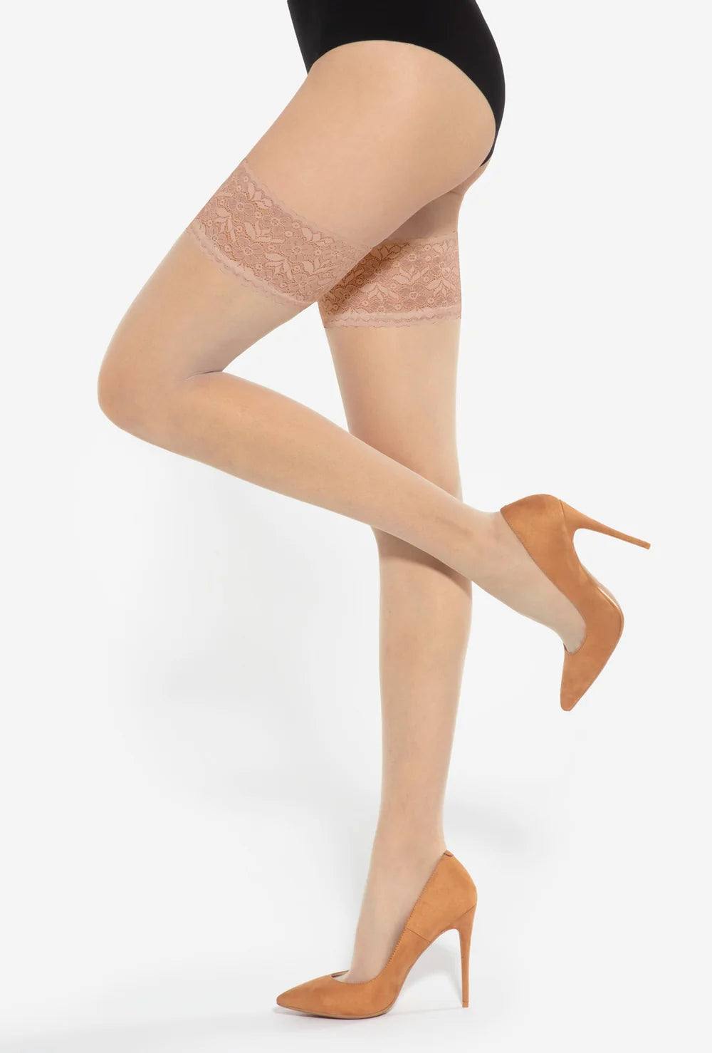 - Model pończoch samonośnych charakteryzuje duża różnorodność kolorystyczna - od krystalicznie białego Bianco, poprzez przydymione Panna, cieliste Beige i Diano, soczysty Golden, aż po głęboki brąz Lyonu, surowy Grafit i aksamitnie czarny Nero. To prawdziwy festiwal barw idealny dla każdej karnacji. Brak zaznaczonej części palcowej sprawia, że z łatwością dobierzesz każde, nawet otwarte obuwie.