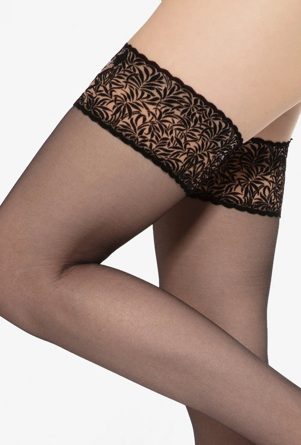 - Pończochy zostały wykonane z elastycznej i transparentnej przędzy LYCRA®, która idealnie przylega do ciała tworząc na jego powierzchni delikatną, zmysłową mgiełkę, która subtelnie zarysowuje kształt nóg wysmuklając je optycznie.