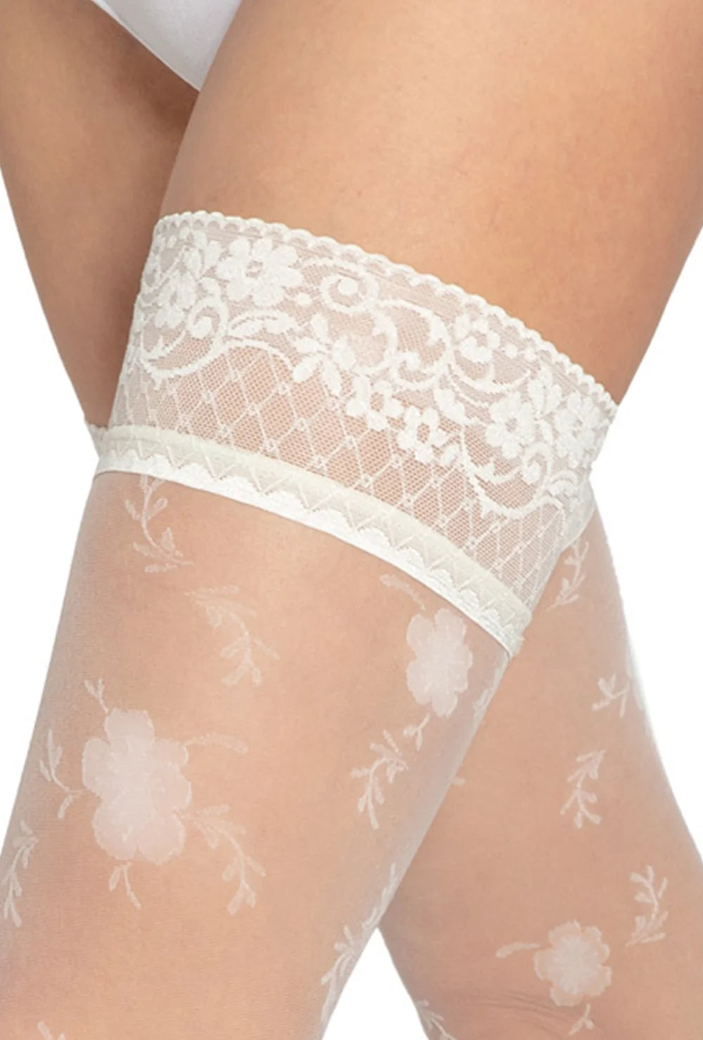 Eleganckie, wzorzyste, samonośne pończochy ślubne. Ich delikatną powierzchnię zdobi efektowny wzór kwiatowy. Góra pończoch zdobiona jest subtelną koronką. Pończochy nie mają zaznaczonej części palcowej, dzięki czemu nadają się również do butów typu open toe.