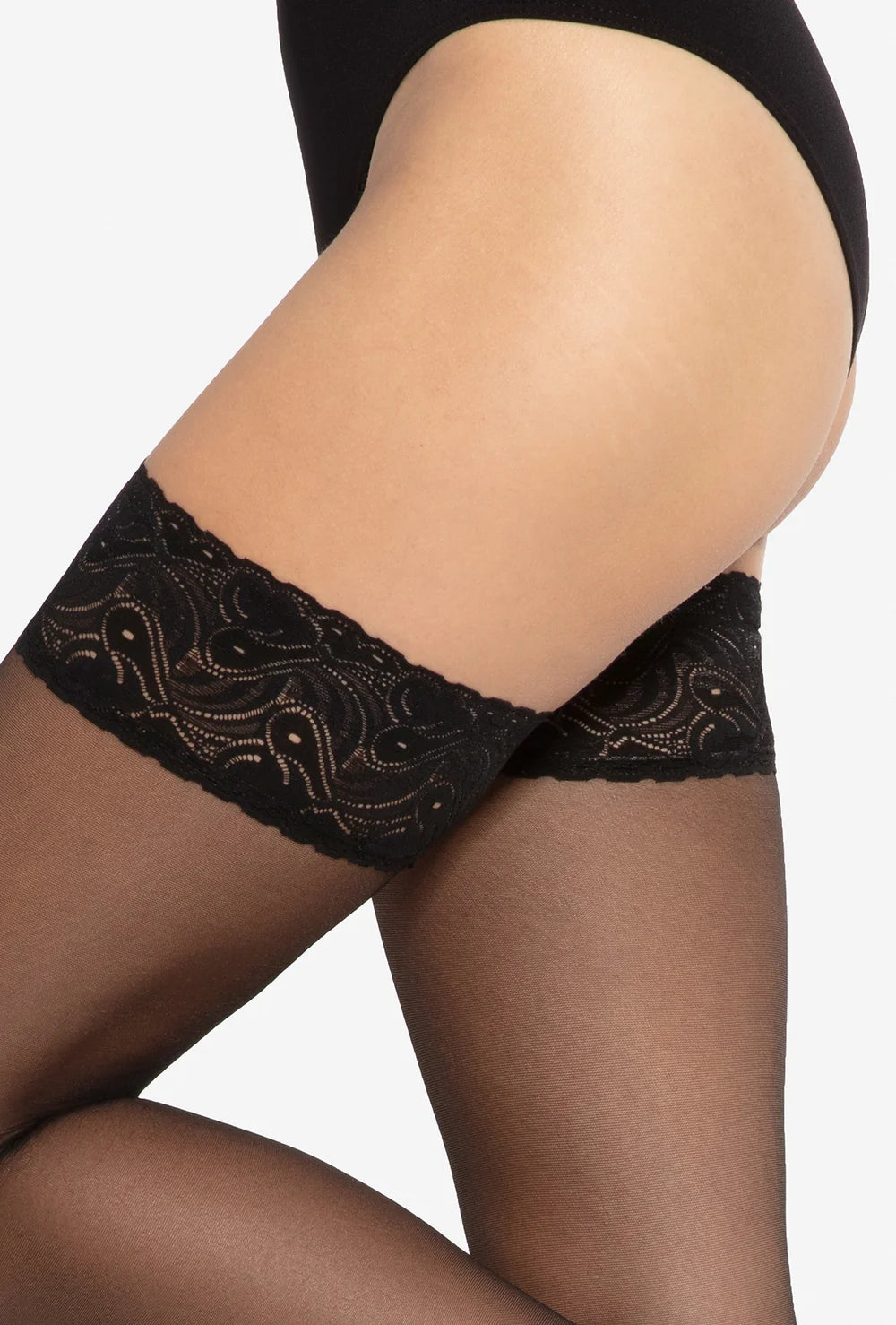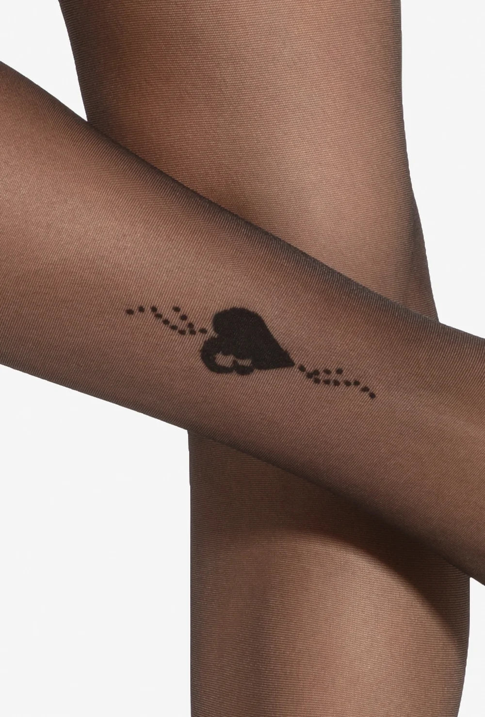 - Górna część pończochy wykończona jest koronką uzupełnioną od wewnątrz silikonowymi paskami, które zapobiegają zsuwaniu się pończoch. Wzór koronki to inspirowany kulturą bliskiego wschodu motyw paisley. Pończochy o grubości 20 DEN posiadają półmatowe, bardzo eleganckie wykończenie. Oryginalnego charakteru nadaje im wzór serduszka umieszczony na boku łydki, który intrygująco zdobi nogi.